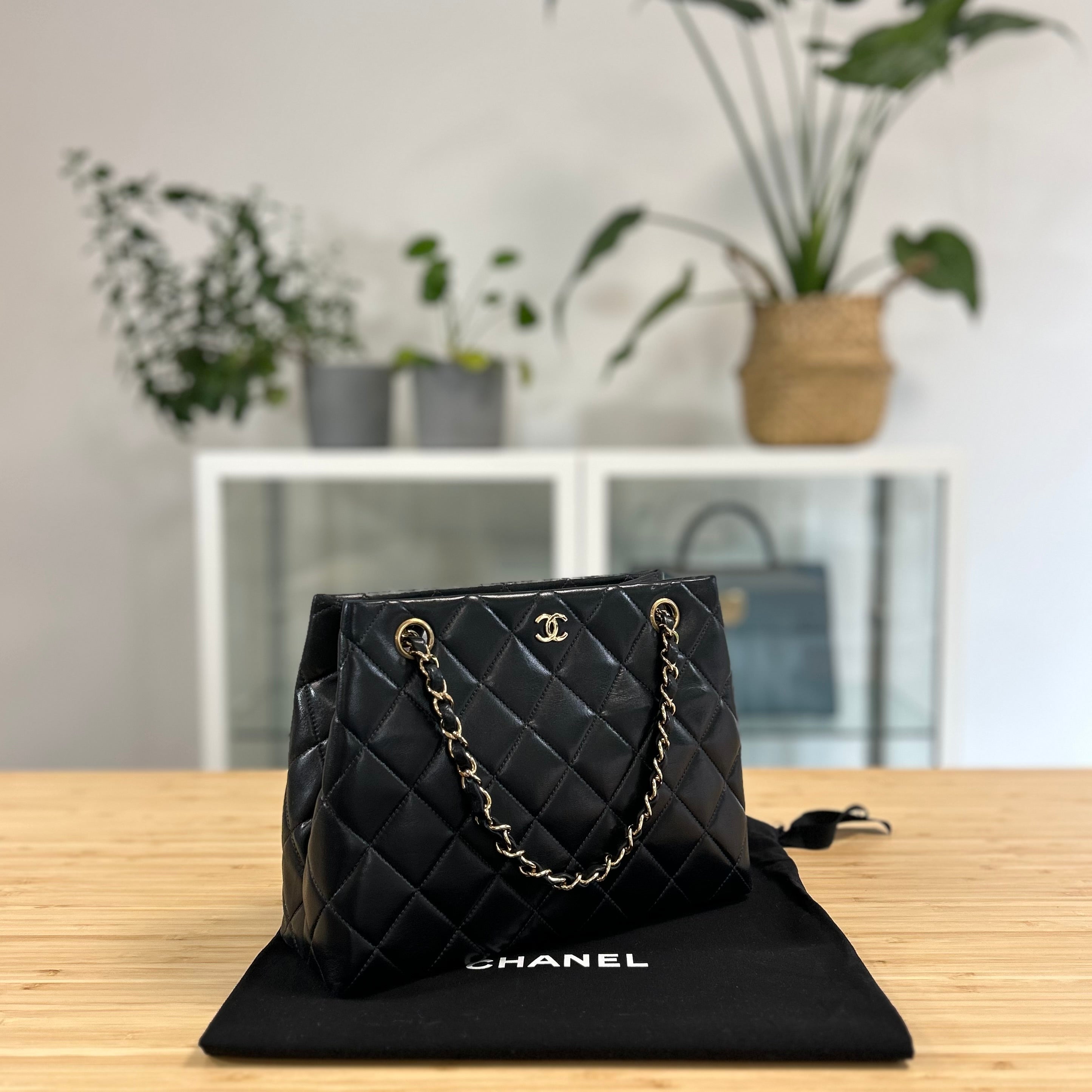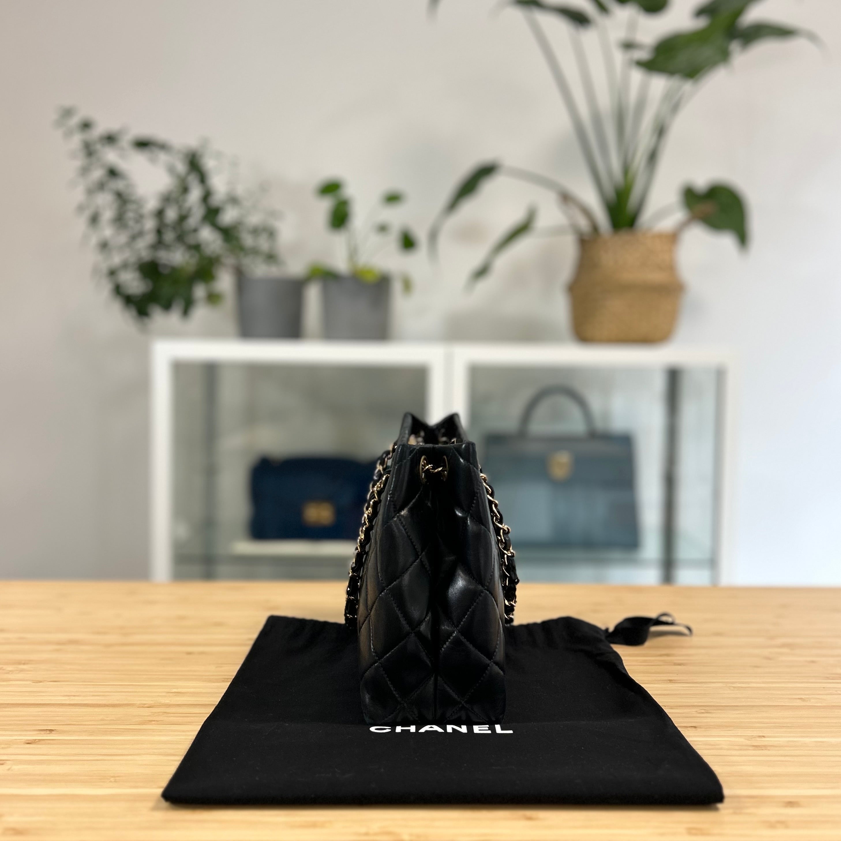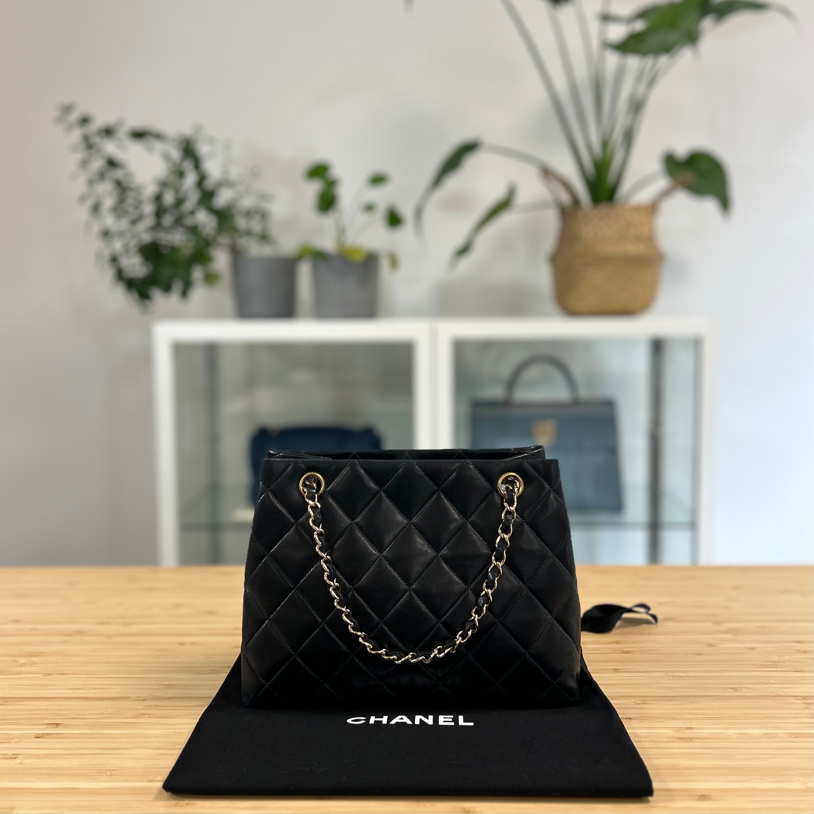 Description: This Chanel Small Shopping Tote has a chain strap which can be used as double top handles or a longer shoulder strap. It has a magnetic press stud fasten. Inside it has 1 zipped pocket. It is from 1997-1999.