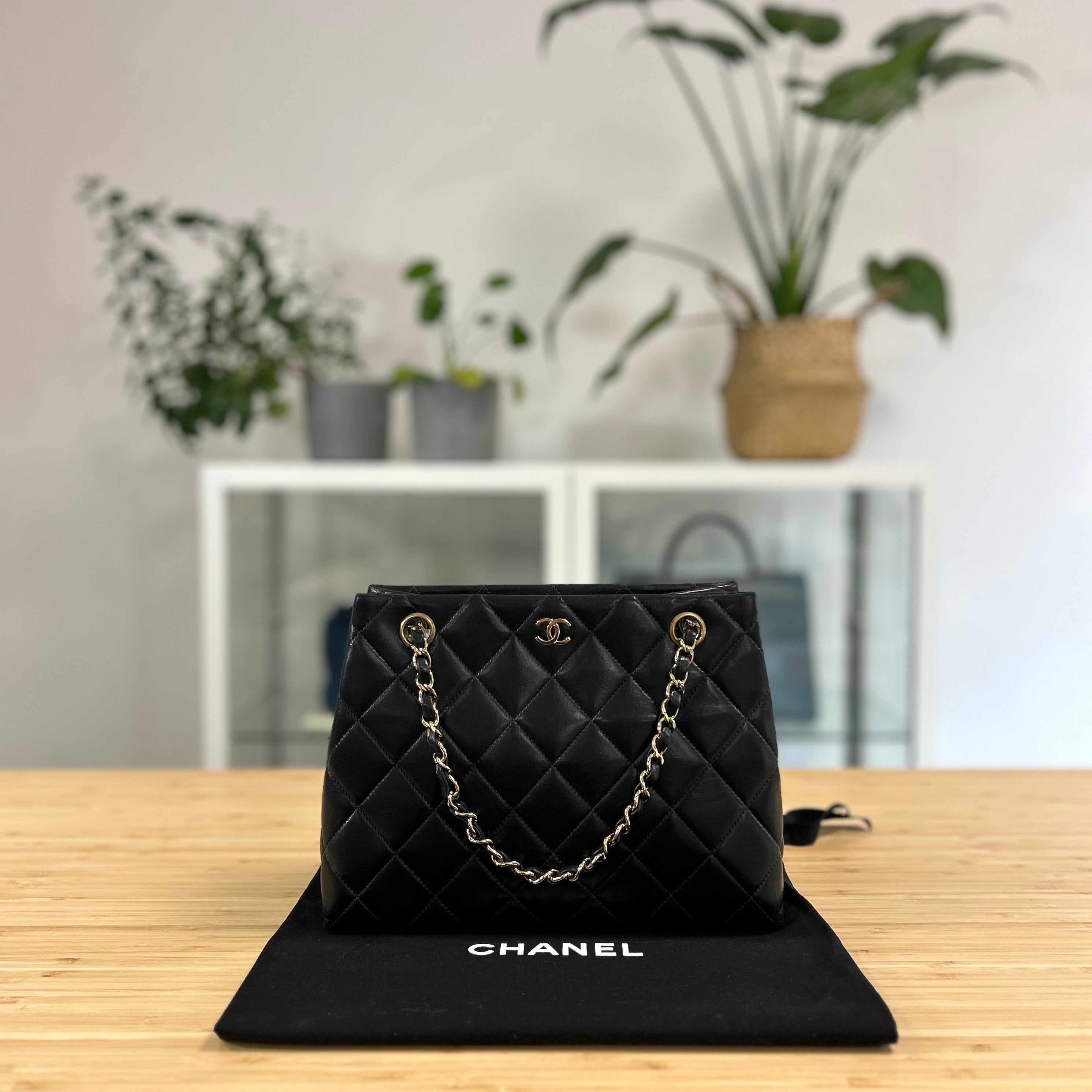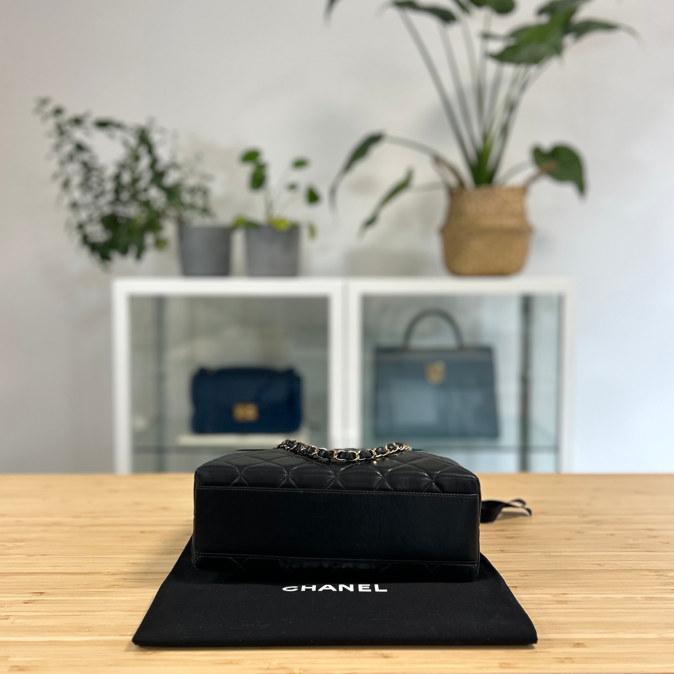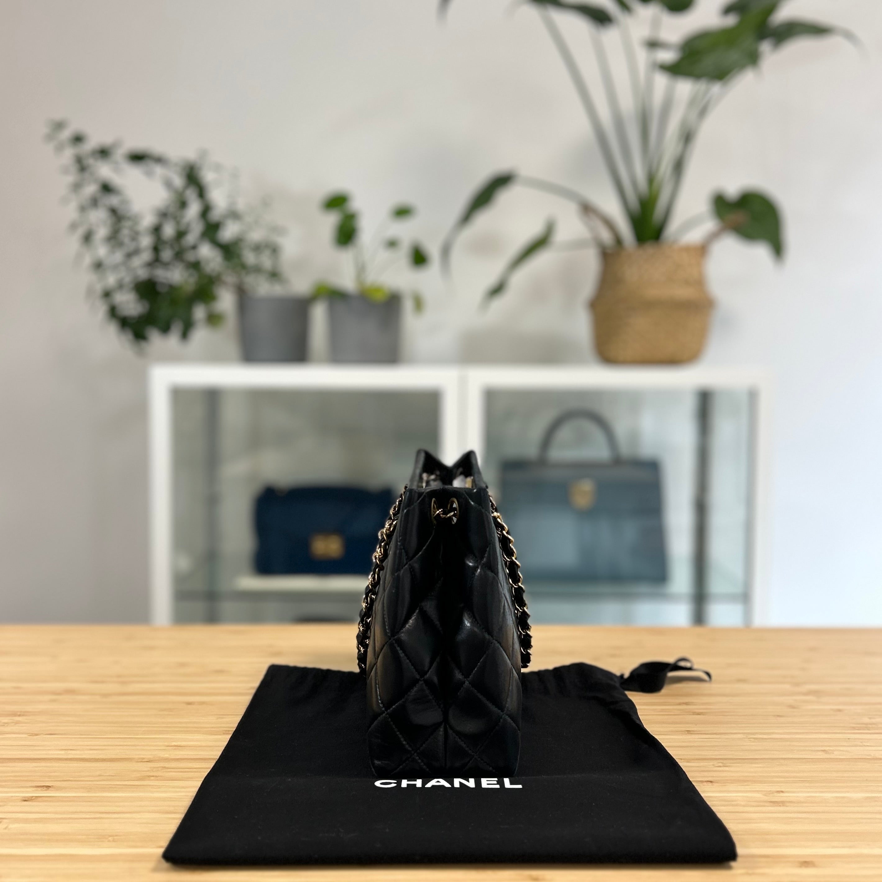 Description: This Chanel Small Shopping Tote has a chain strap which can be used as double top handles or a longer shoulder strap. It has a magnetic press stud fasten. Inside it has 1 zipped pocket. It is from 1997-1999.