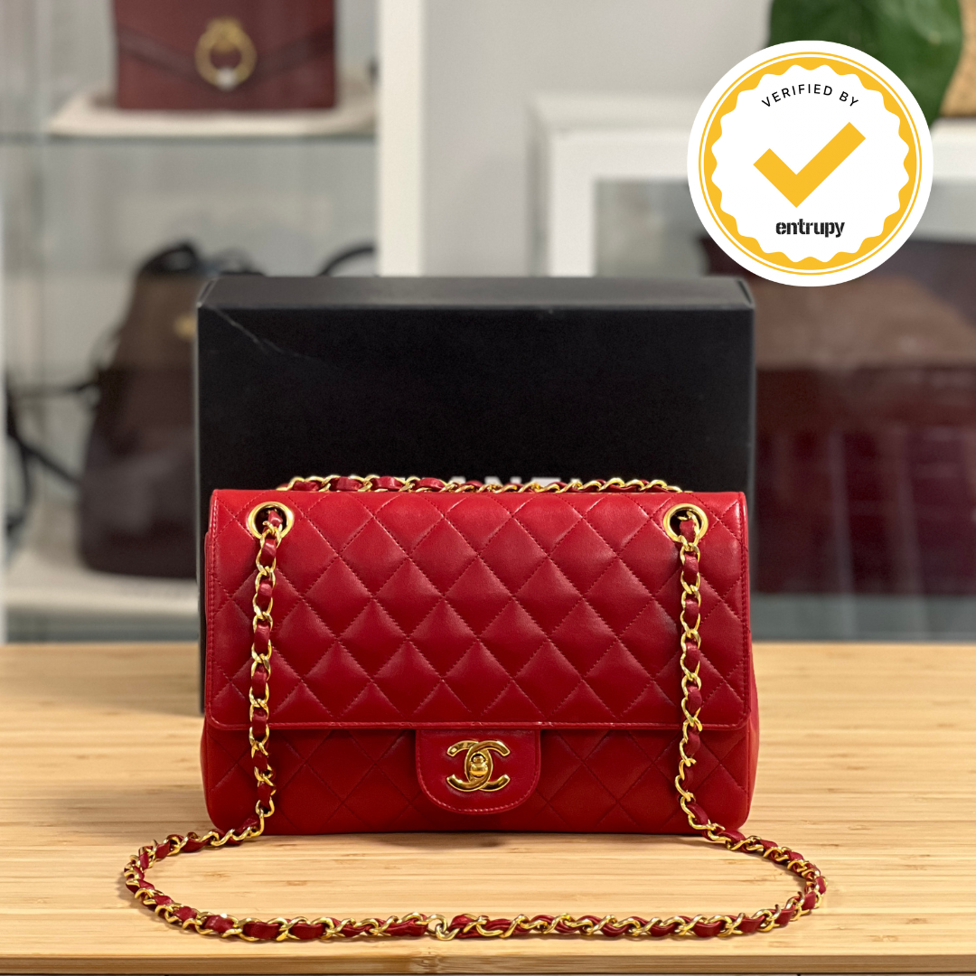 Description: This Chanel Double Flap is in size Medium. It has an adjustable chain and leather strap. It has an external flat pocket on the back. The first flap closure has the iconic CC turnlock fasten, and has 1 pocket inside. The second flap has a press stud fasten and inside it has a front pocket and the main section with 2 flat pockets and 1 lipstick pocket. The serial code begins with 1 so it is from 1989-1991.