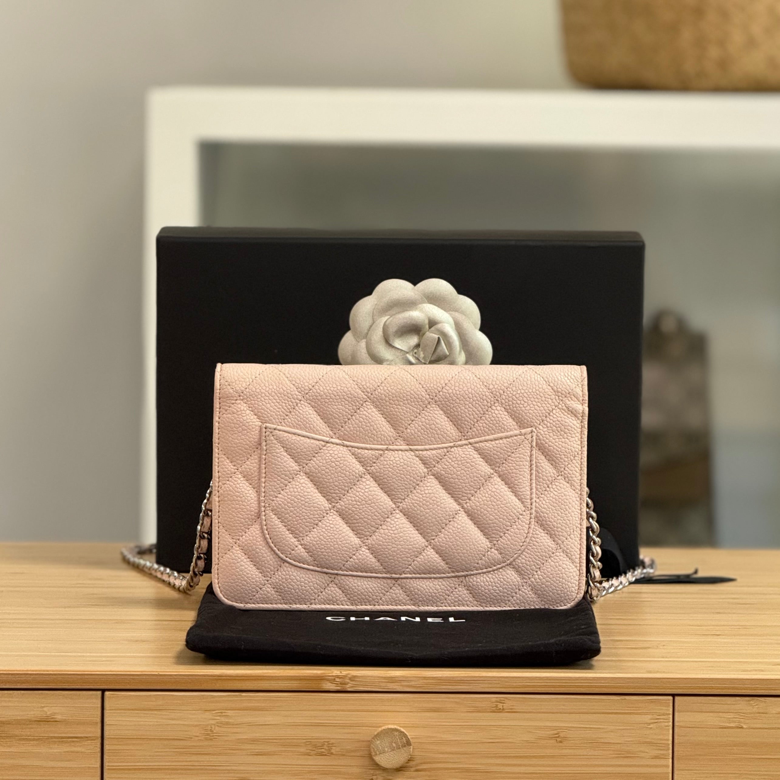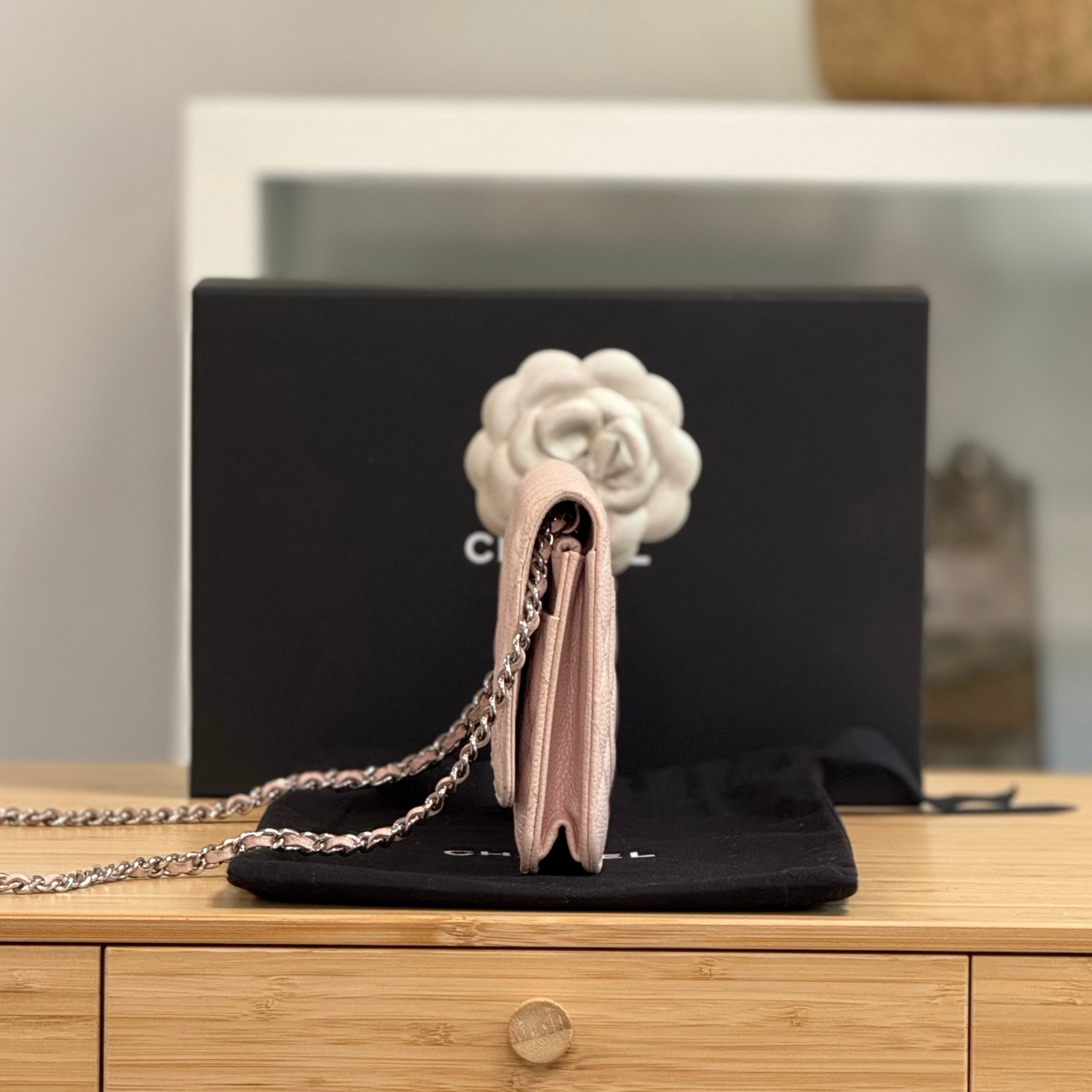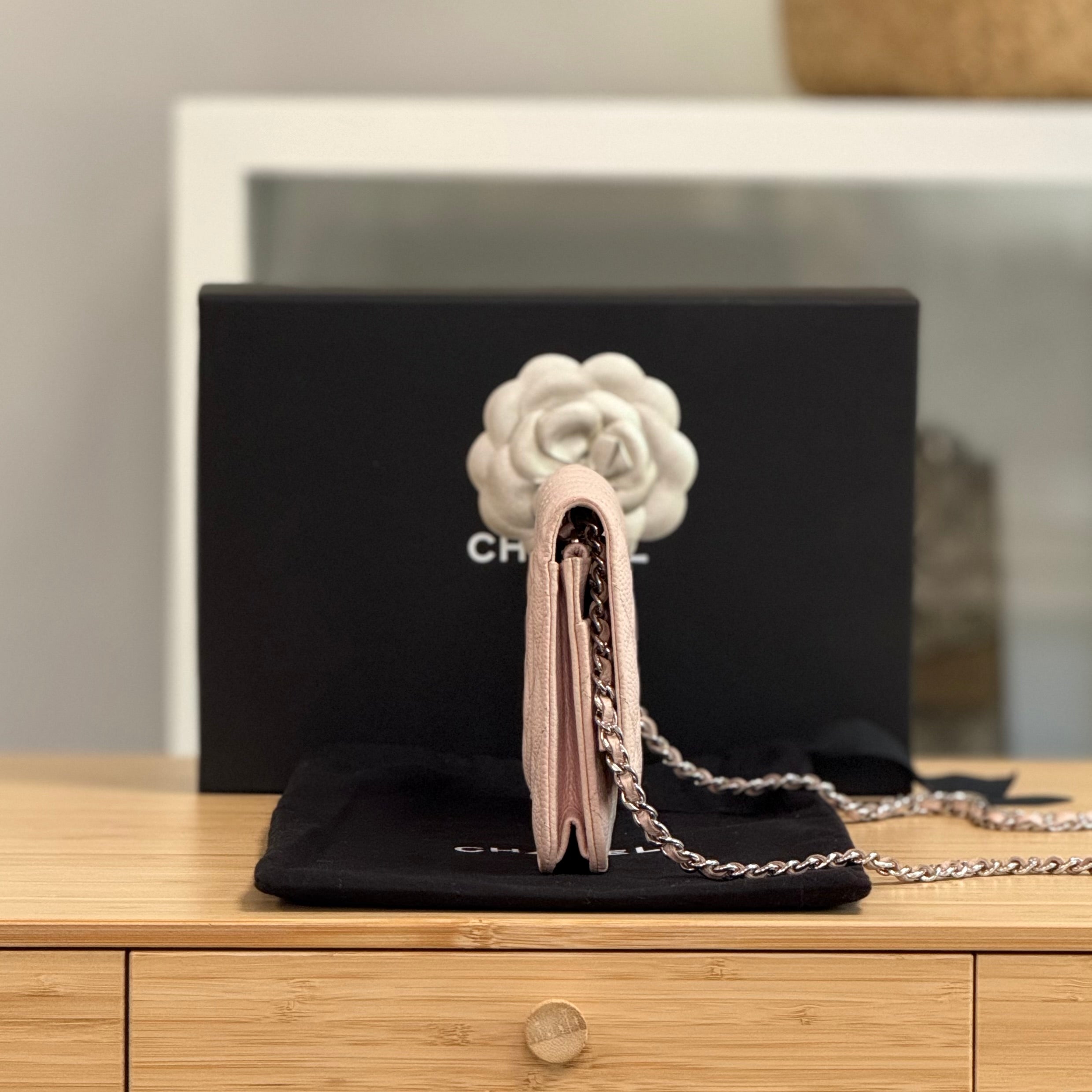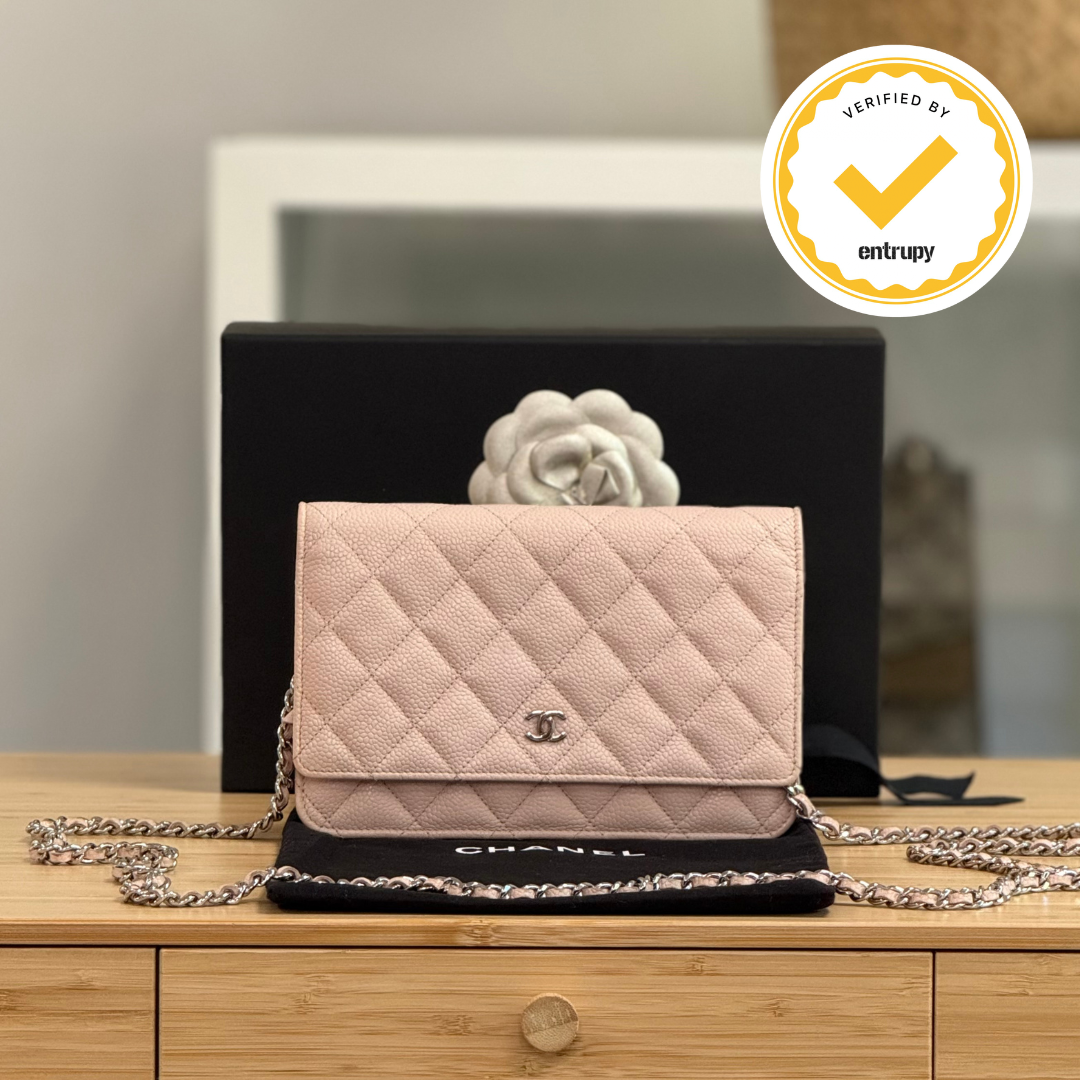 Description: This Chanel WOC has a long strap and a flap closure with a press-stud fasten. It has an exterior flat pocket on the back of the bag. Inside there are 6 card slots, 2 flat pockets and 2 zipped pockets. It is an 18 series Chanel, so it is from 2013-14. Verified with Entrupy Authentication.