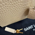Description: This Saint Laurent Croc Sac de Jour has 2 top handles and a removable strap. It has a removable cloche with padlock. The base has 5 studs. Inside it has 2 large compartments and a central zipped pocket. It has a fob with 2 keys that is attached to the inside with a press-stud.