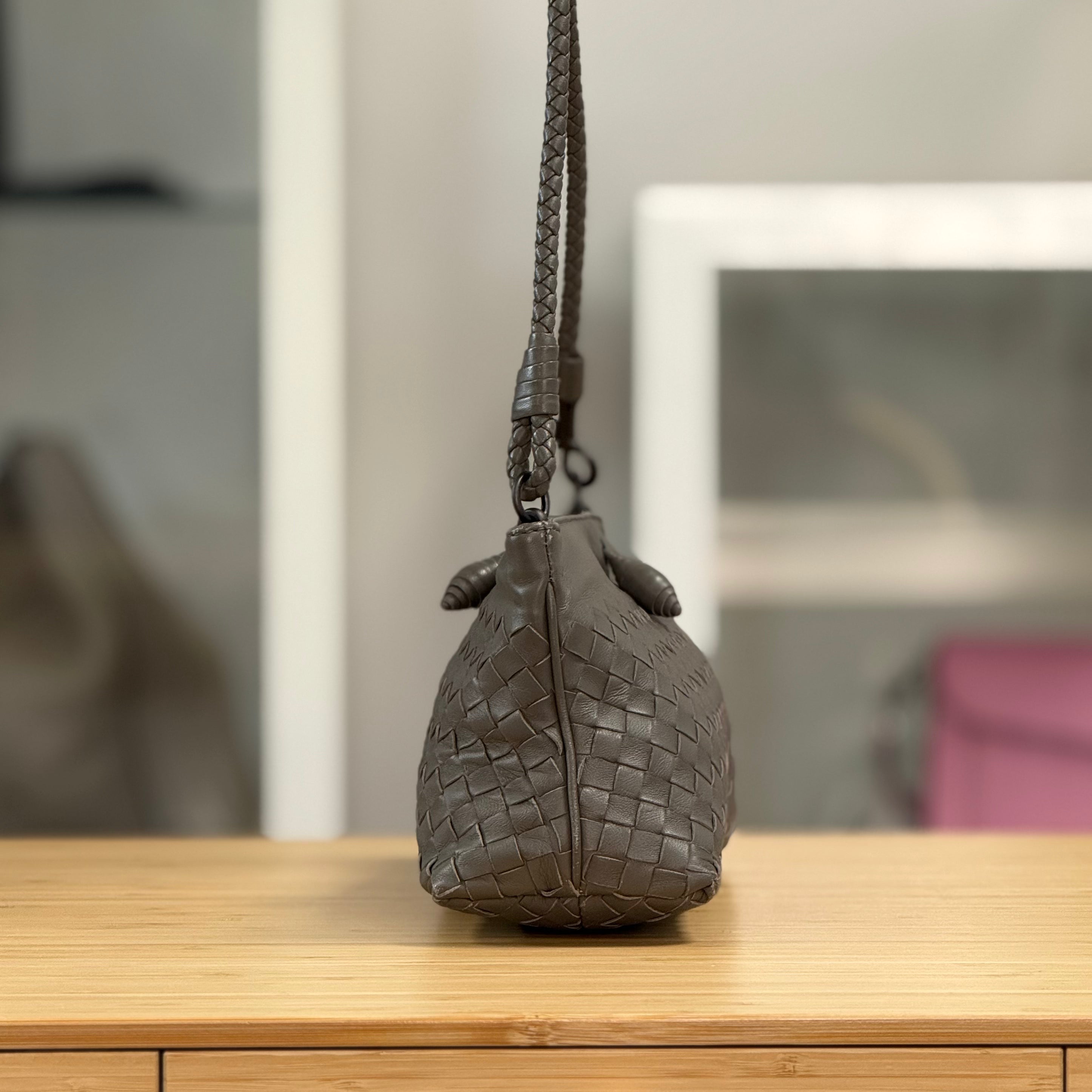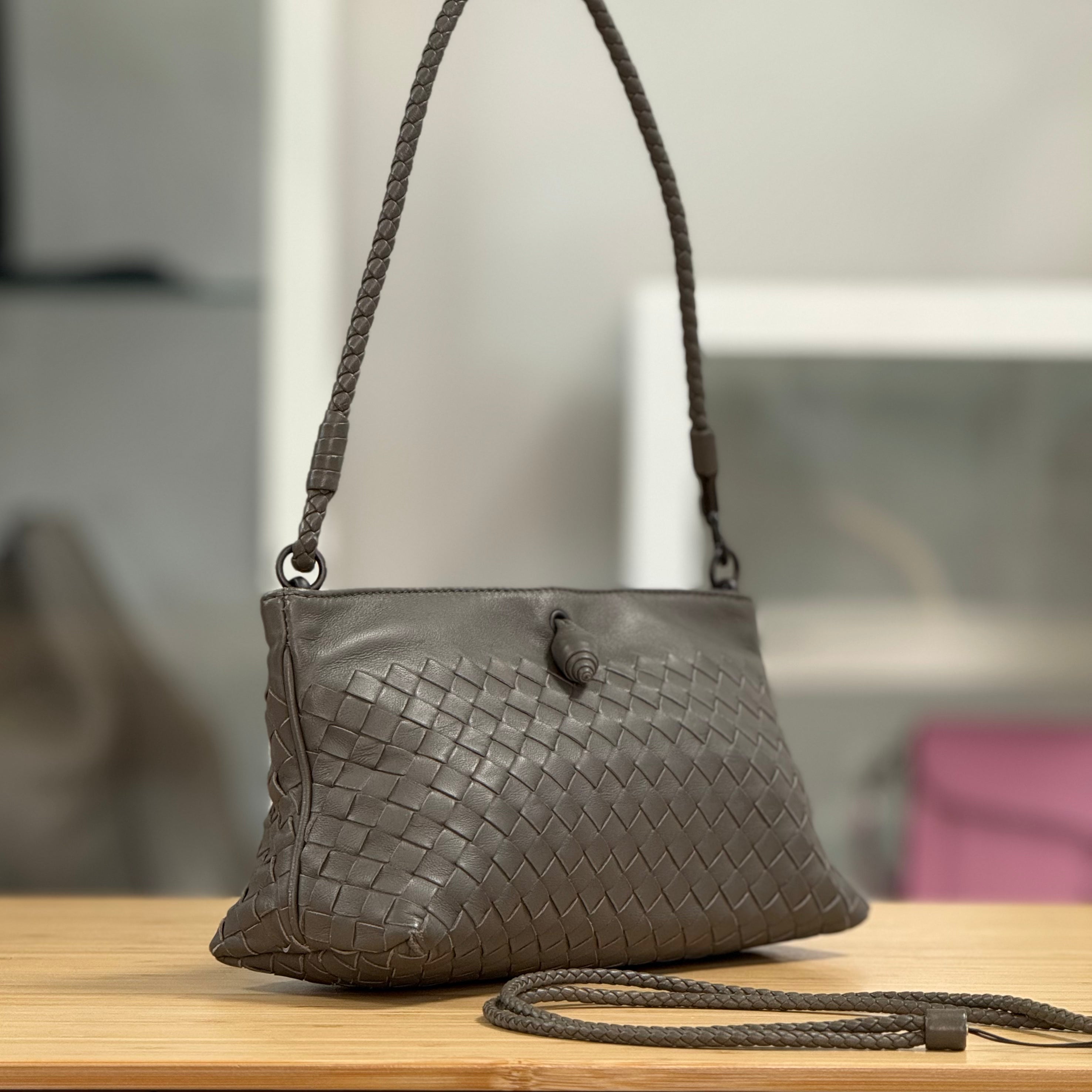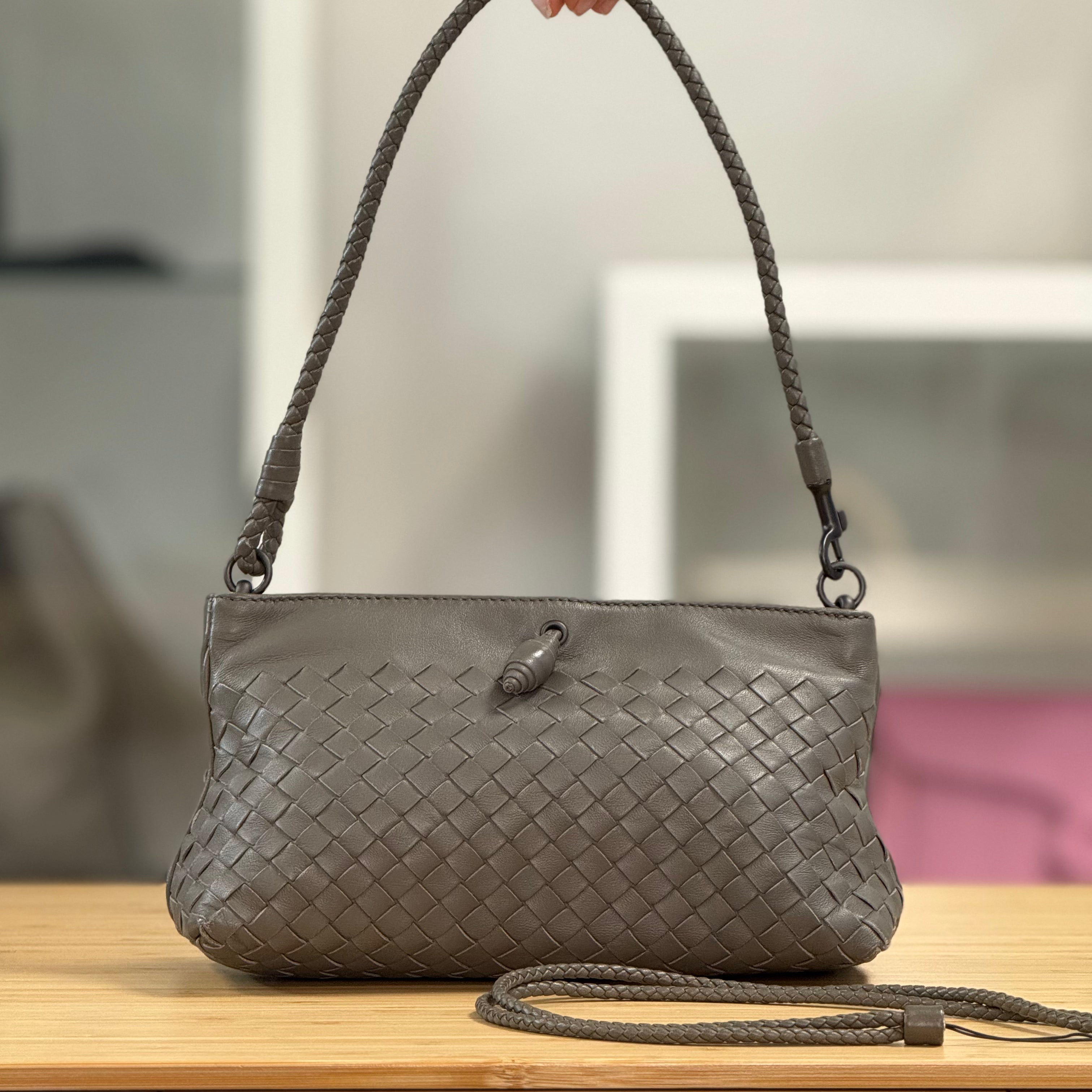 Description: This Bottega Veneta Intrecciato Pochette has a woven leather strap and a frame top closure. It comes with a woven leather phone strap.