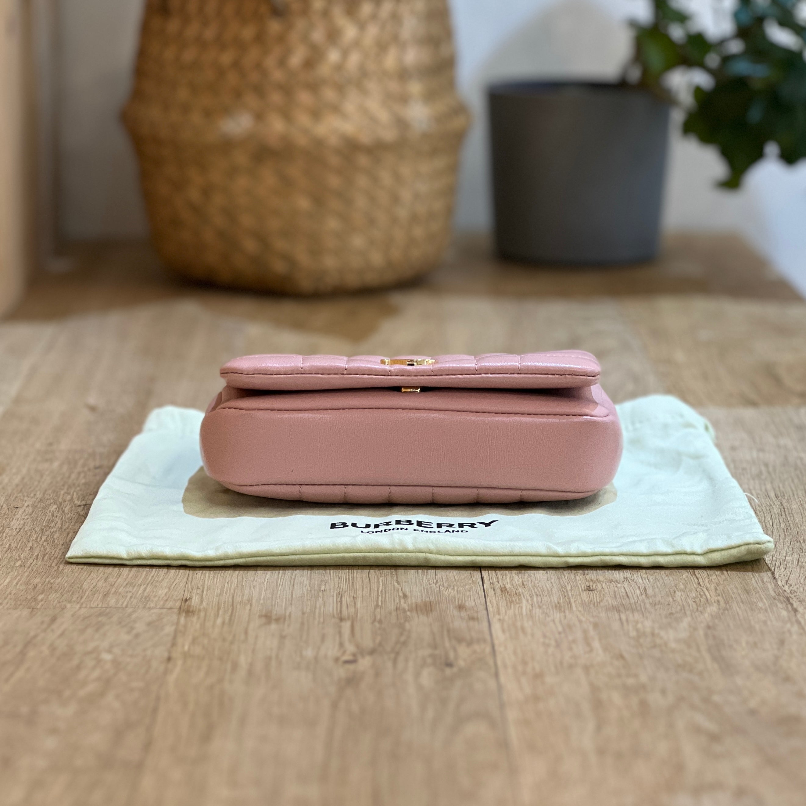 Description: This Burberry Quilted Mini Lola has a long strap, and a flap closure with a press-stud fasten. Inside there is 1 flat pocket.