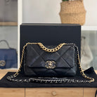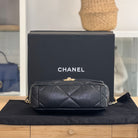 Description: This Chanel 19 in size small has a top handle and a long strap. It has an exterior flat pocket with a magnetic press-stud fasten on the back of the bag. The date code begins 30, so it is from 2020