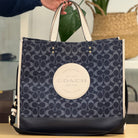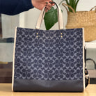 Description: This Dempsey Tote 40 in Signature Denim has double top handles, a removable & adjustable strap and a magnetic press-stud fasten. It has 4 base studs. Inside there are 2 flat pockets, 2 zipped pockets and 1 pen pocket.