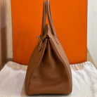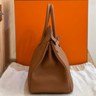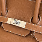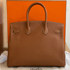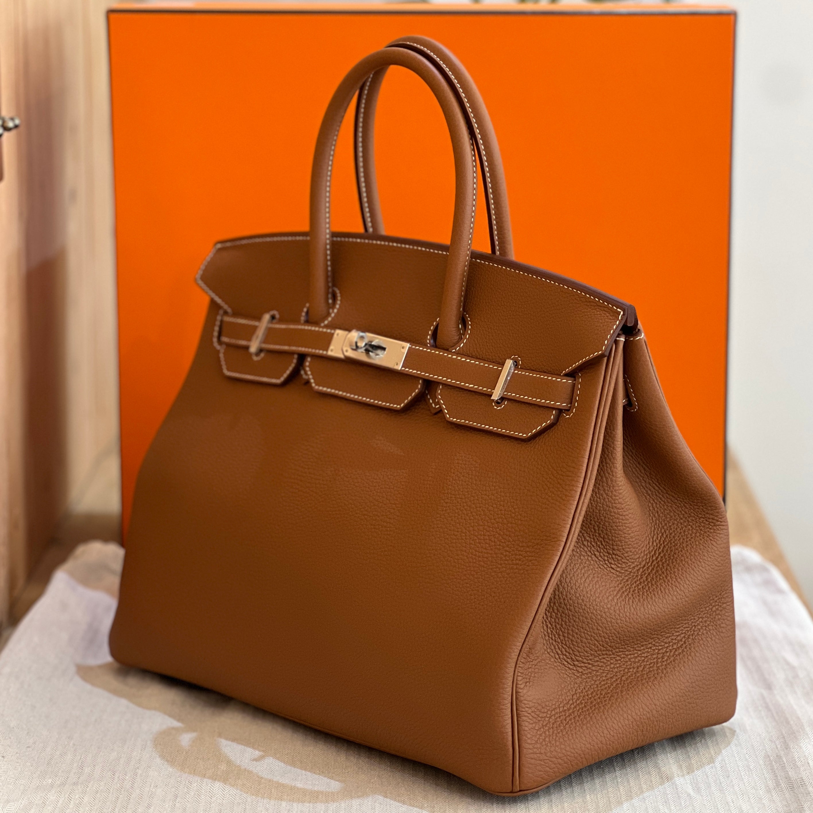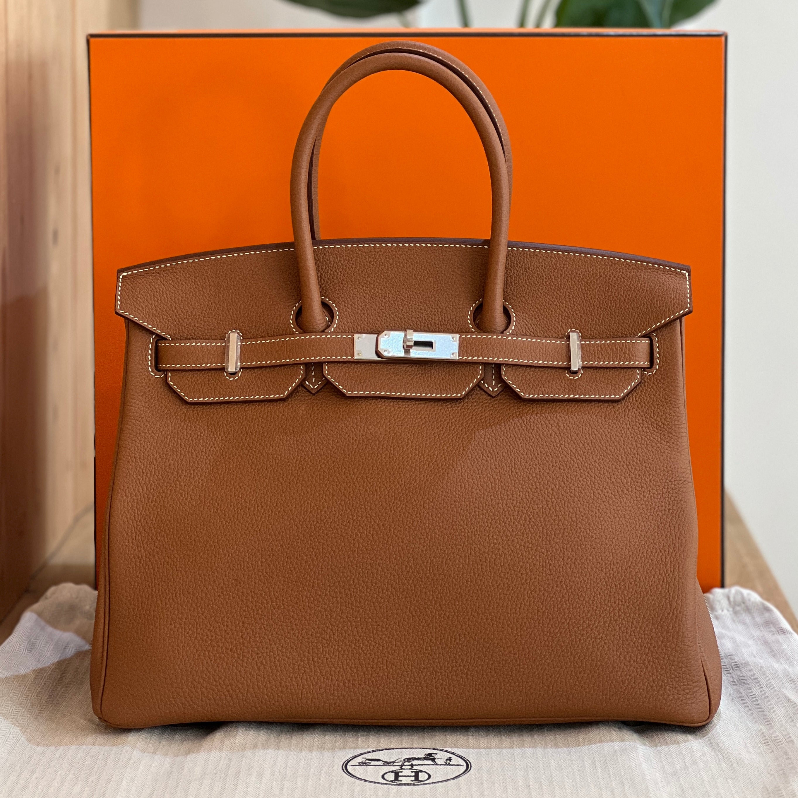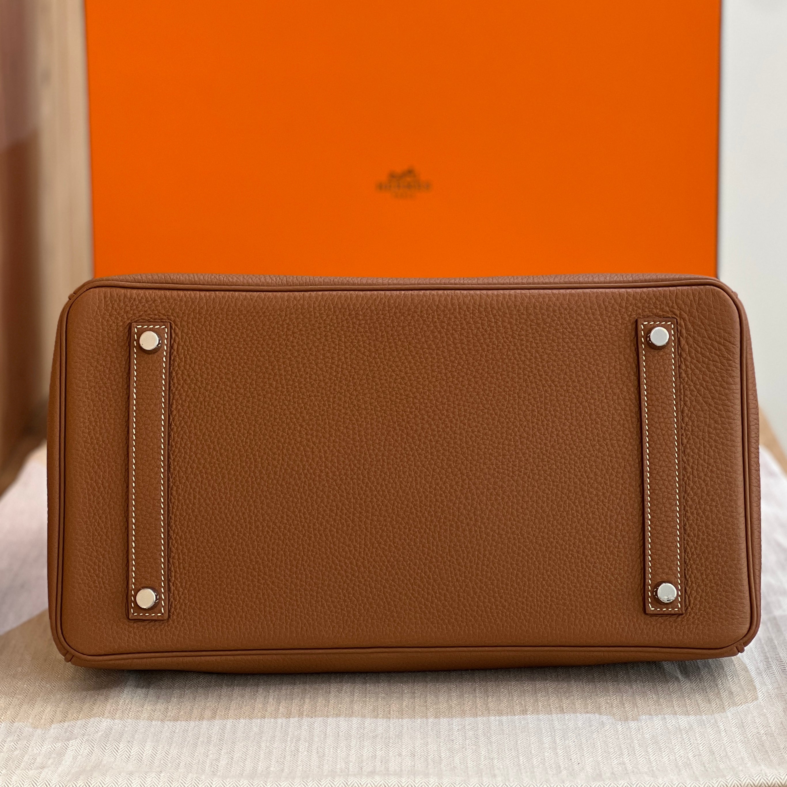 Description: This Hermès Birkin 35 has double top handles with a removable cloche, and 4 base studs. It has a flap closure with a turnlock belt fasten. Inside there is 1 zipped pocket and 1 flat pocket. The date stamp is Y (no surrounding shape) so it is from 2020.