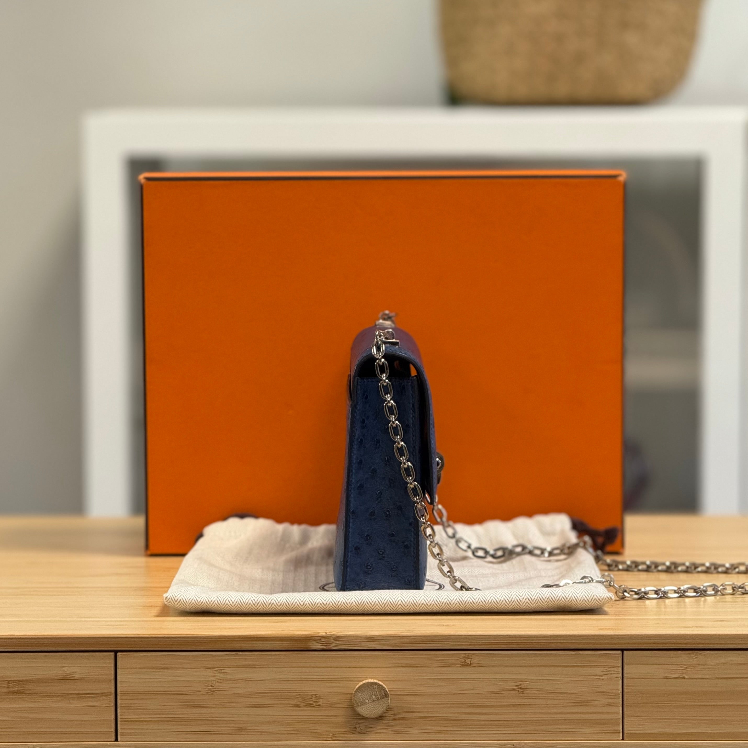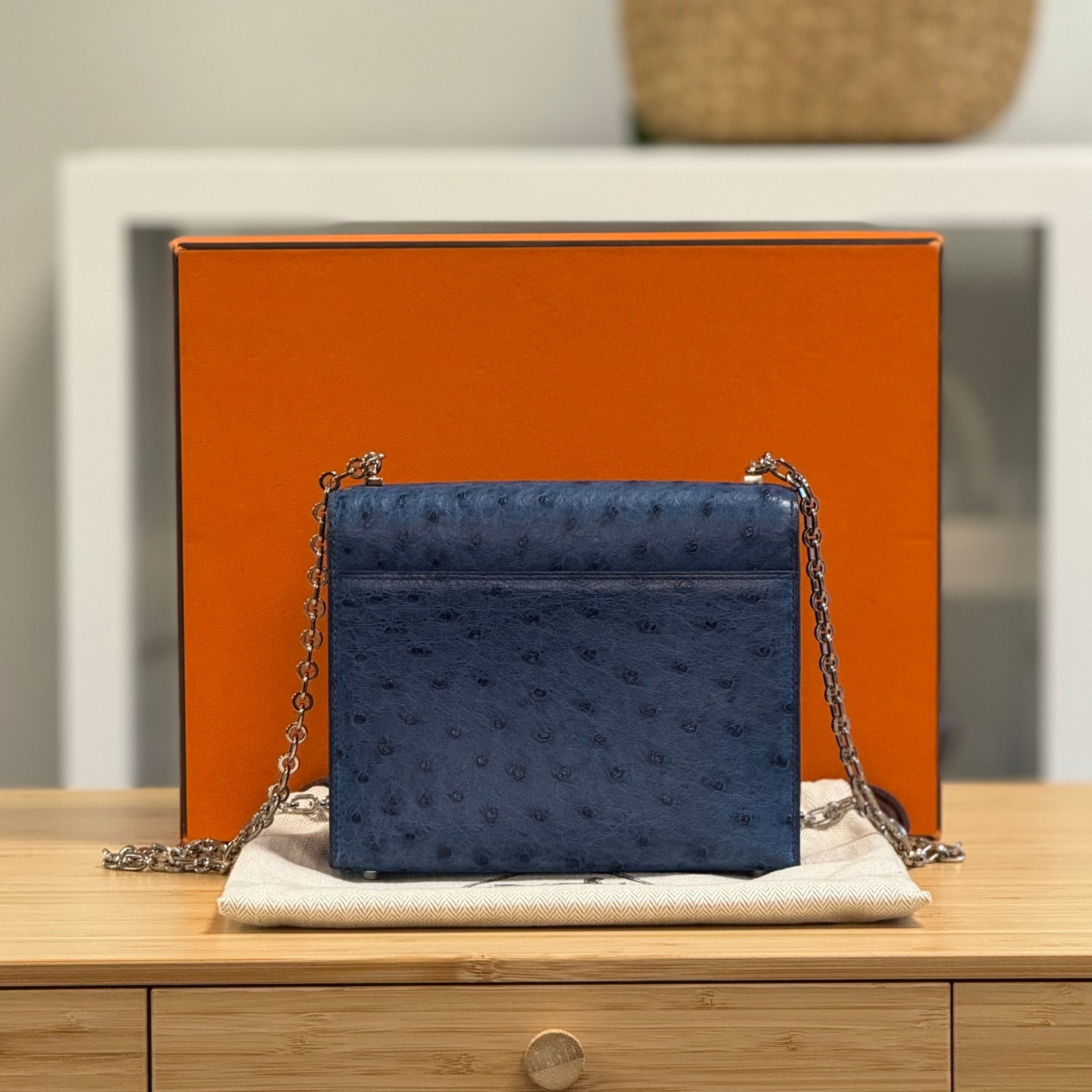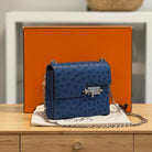 Minnie-Ella likes: This is such a head turner, ostrich leather has that instantly recognisable pebbled texture, and in a lovely sophisticated blue to add to the exclusivity!