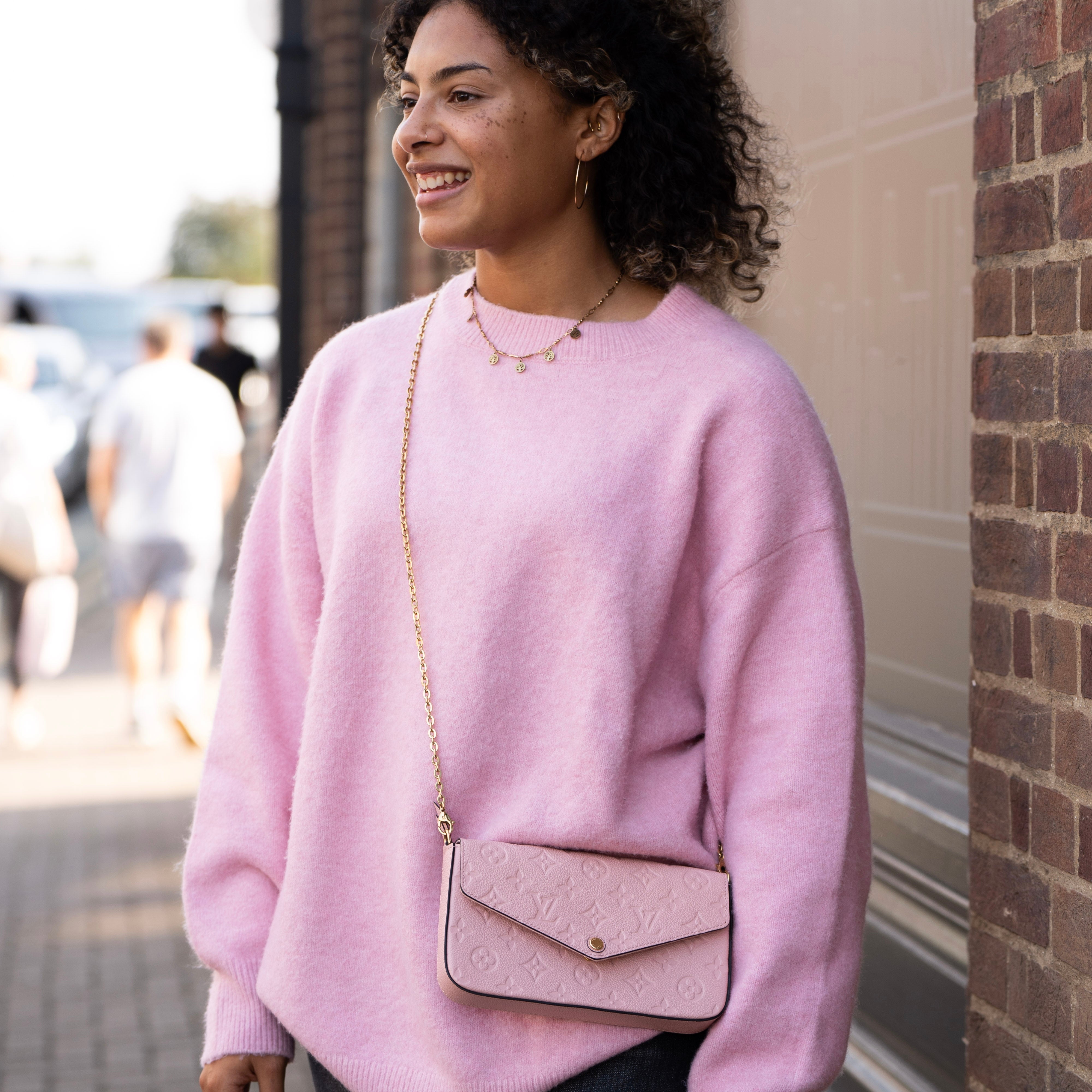 Description: This Louis Vuitton Pochette Felicie has a removable chain strap. It has an envelope flap closure with a press-stud fasten. Inside there is 1 flat pocket, 1 removable zipped pouch, and 1 removable slip wallet with 8 card slots and 1 flat pocket. The date code is NZ3199.