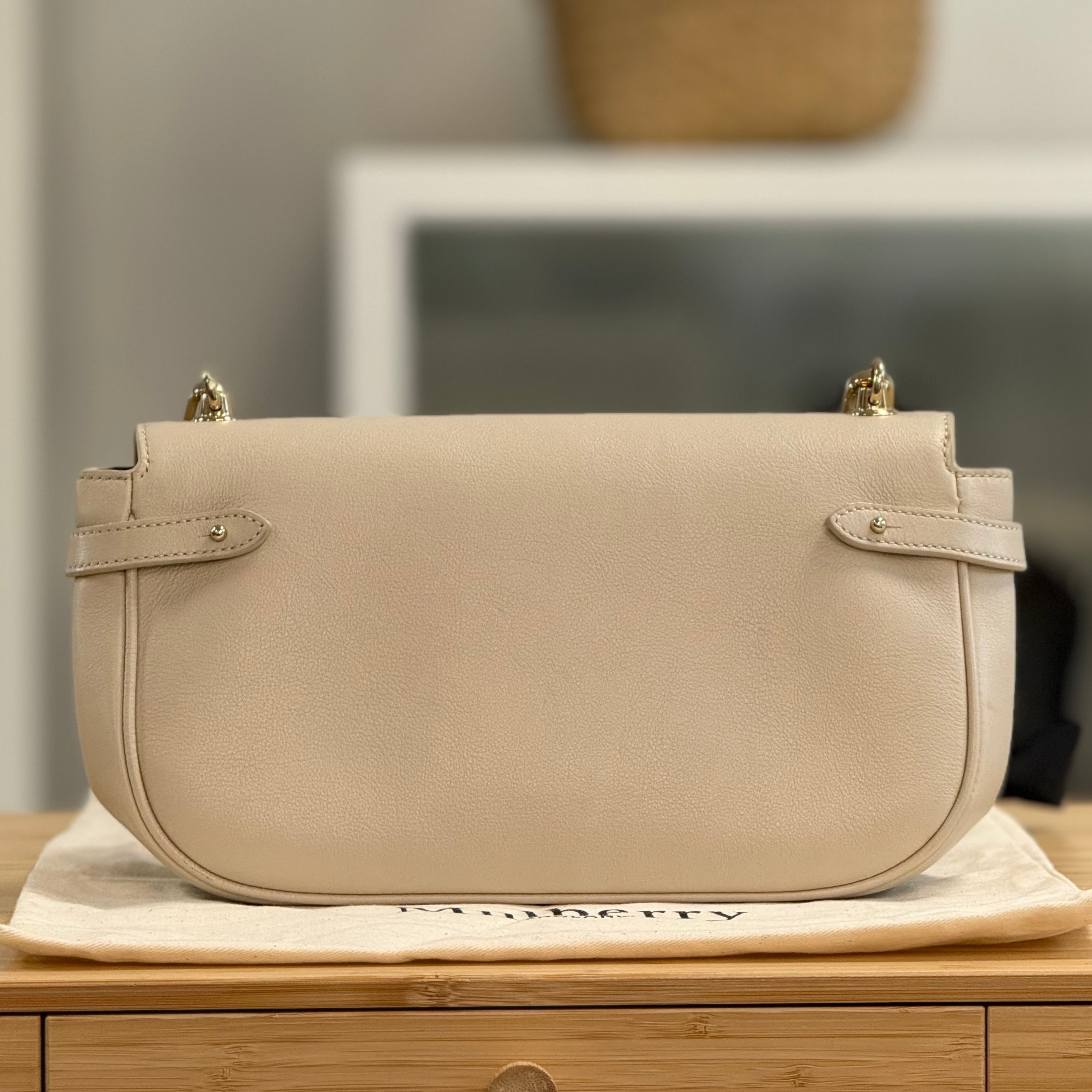 Description: This Mulberry Amberley East West has a removable chain/leather strap. It has a front flap with the signature Rider's Lock fasten. Inside there is one main compartment with a flat pocket.