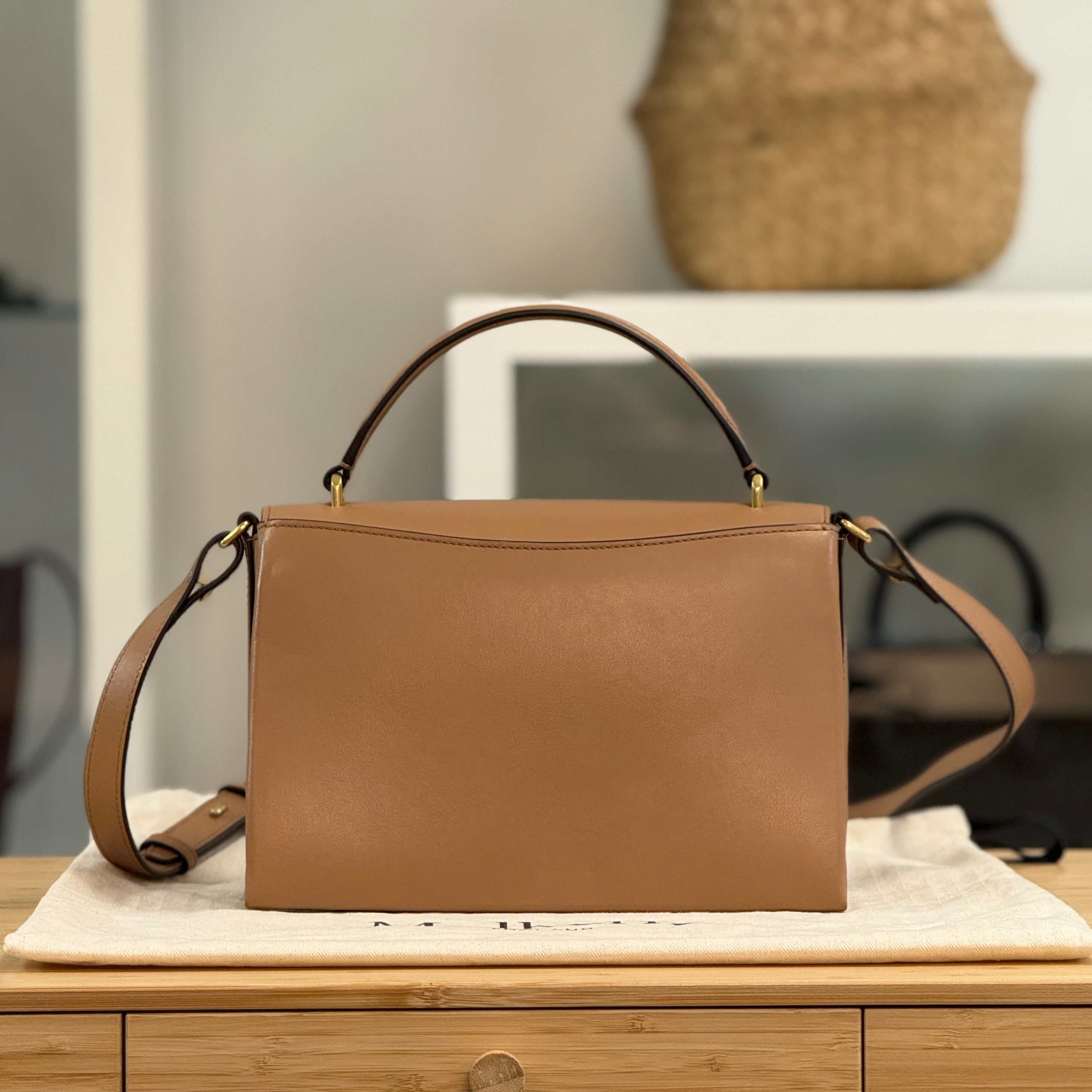 Description: This Mulberry Lana in size medium has 1 top handle and a removable & adjustable strap. It has 1 exterior flat pocket on the back. It has a flap closure with foundry lock fasten. Inside there are 3 sections, the middle section has a small flat pocket.