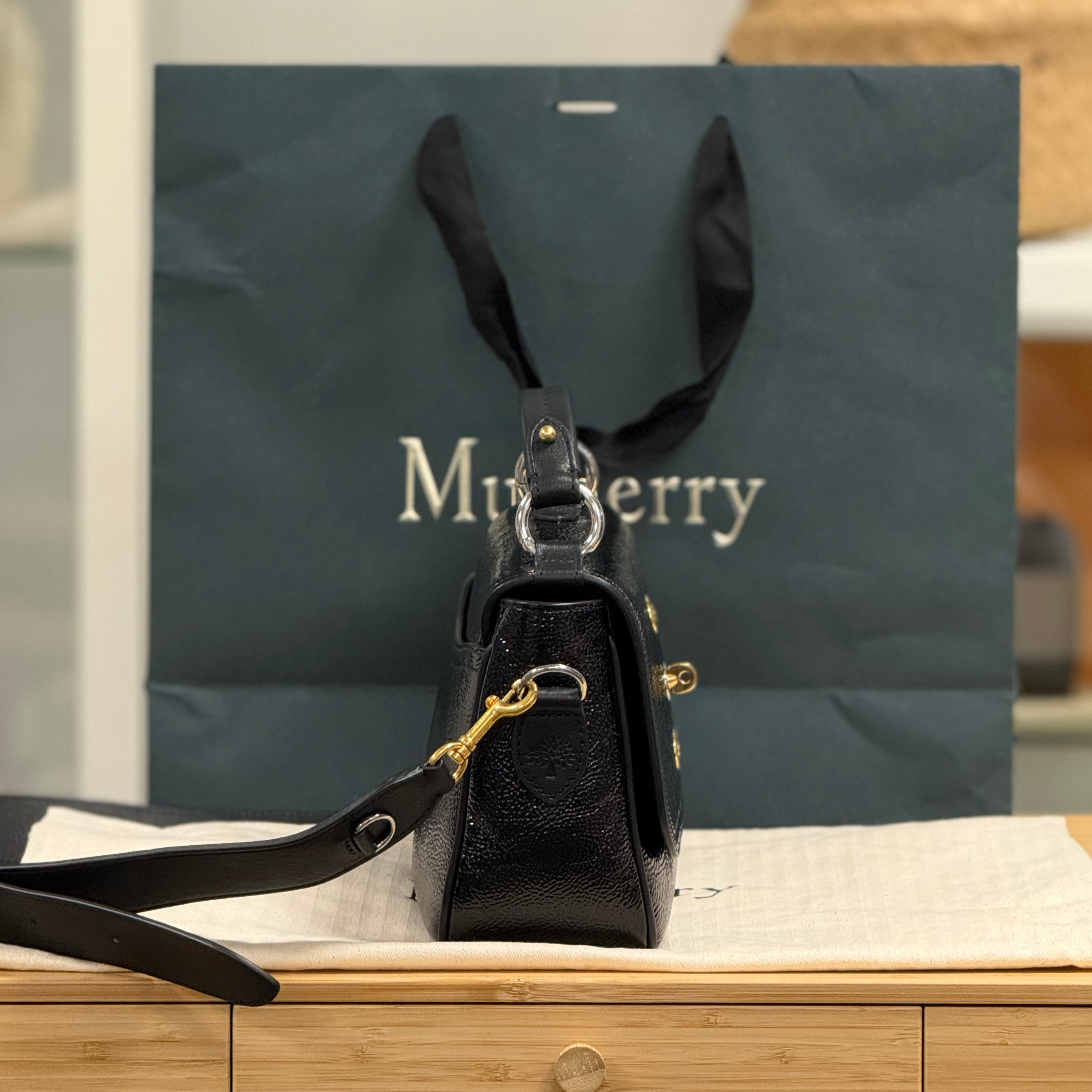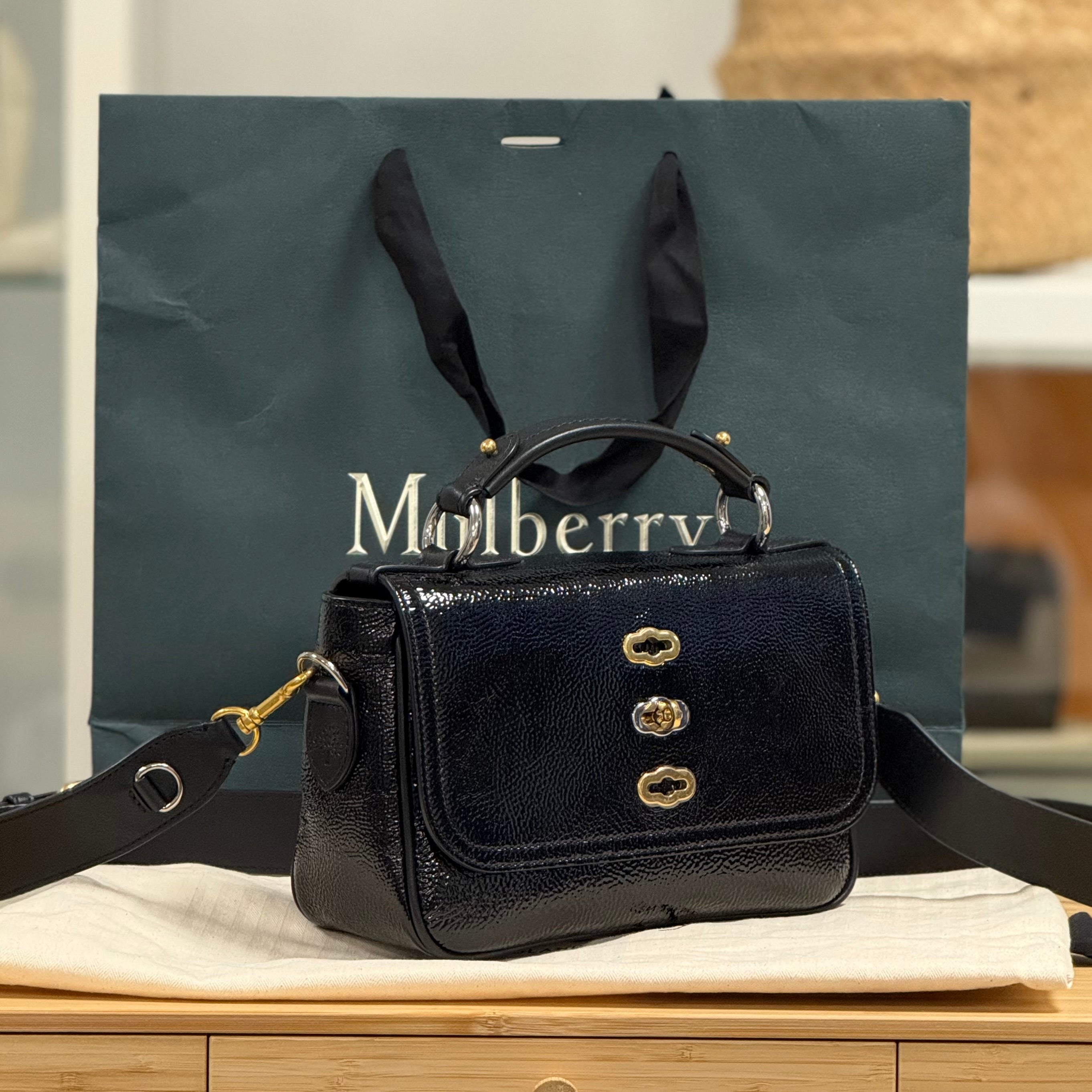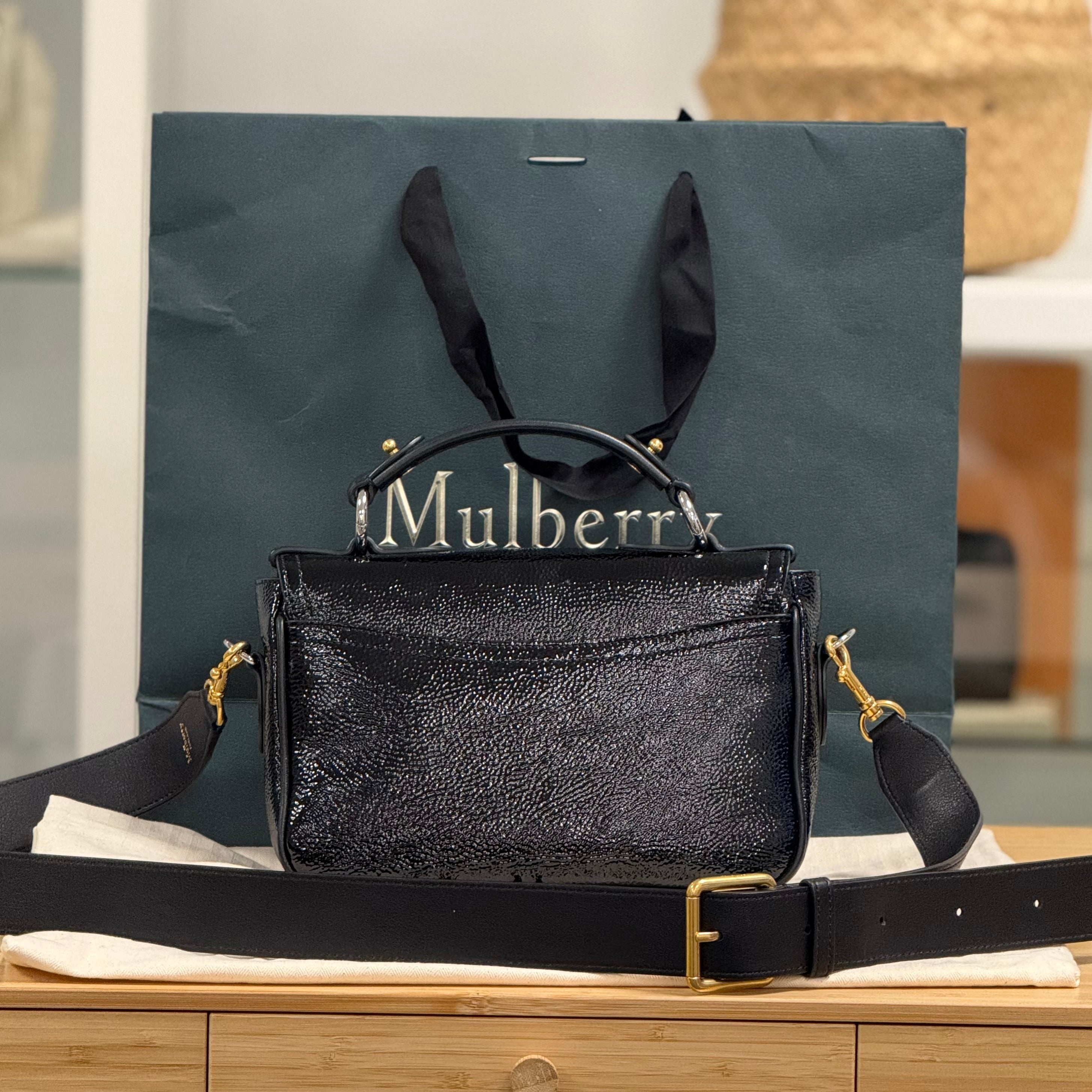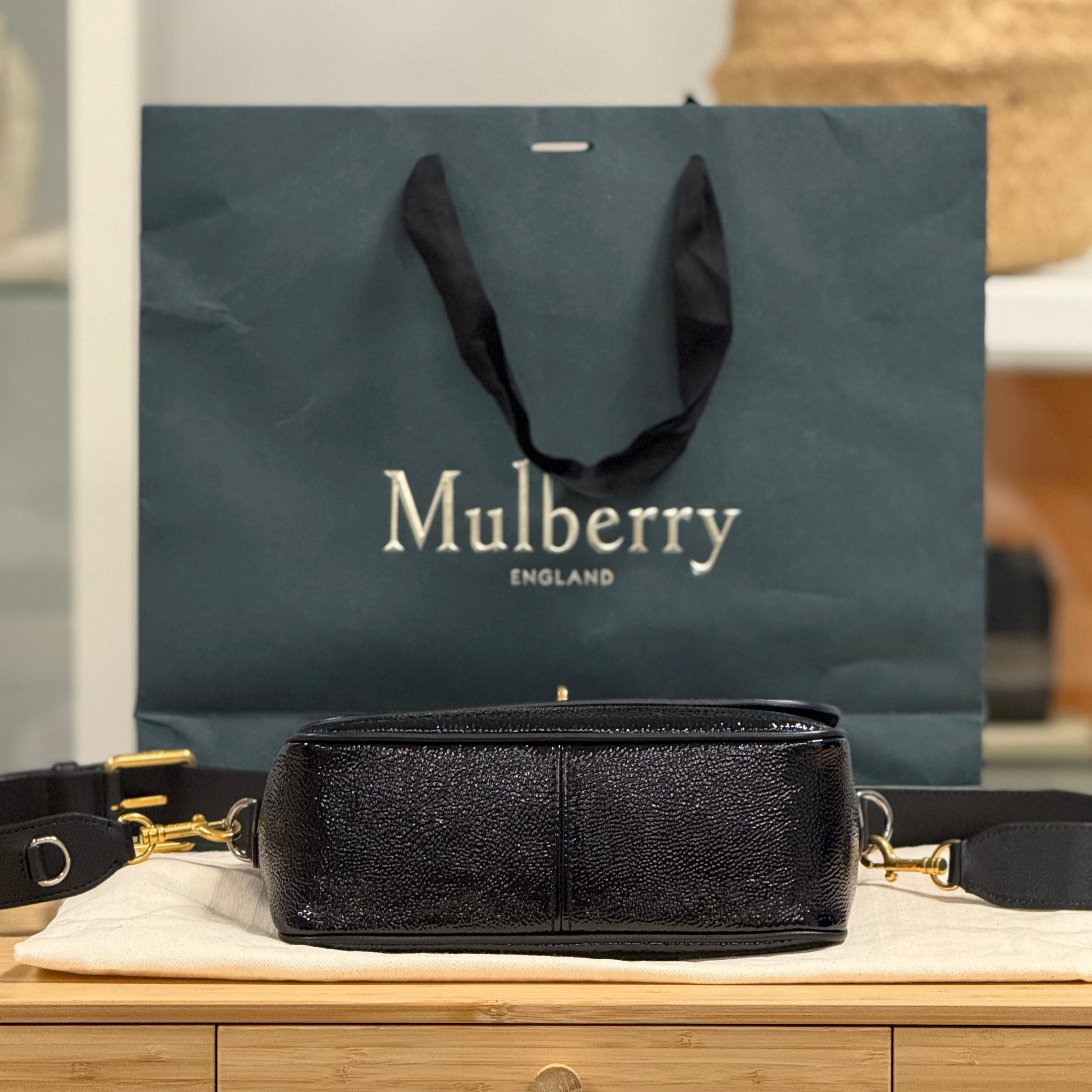 Description: This Mulberry Patent Bryn in size small has a top handle and a removable & adjustable strap. It has a flap closure with 3 turn-lock fastens. Inside there is 1 flat pocket.