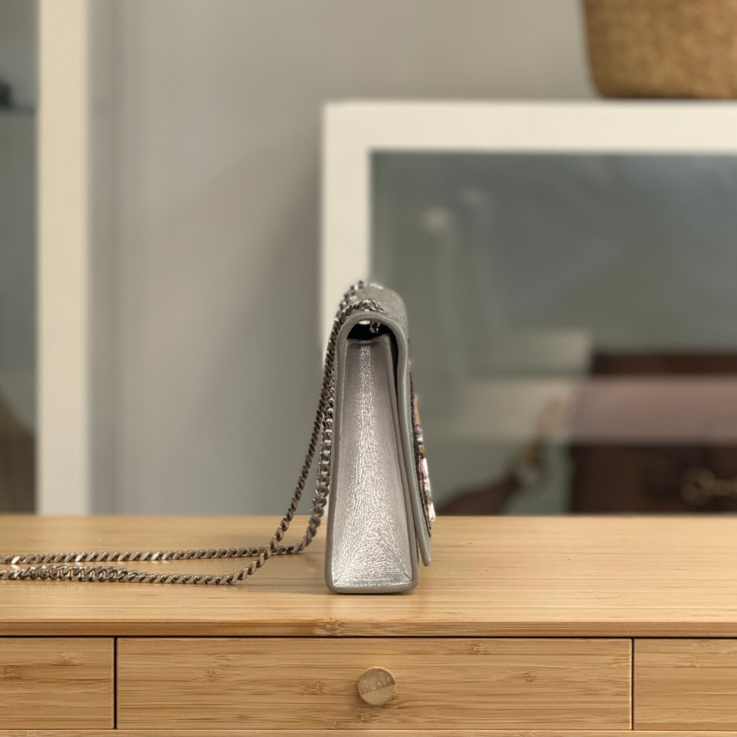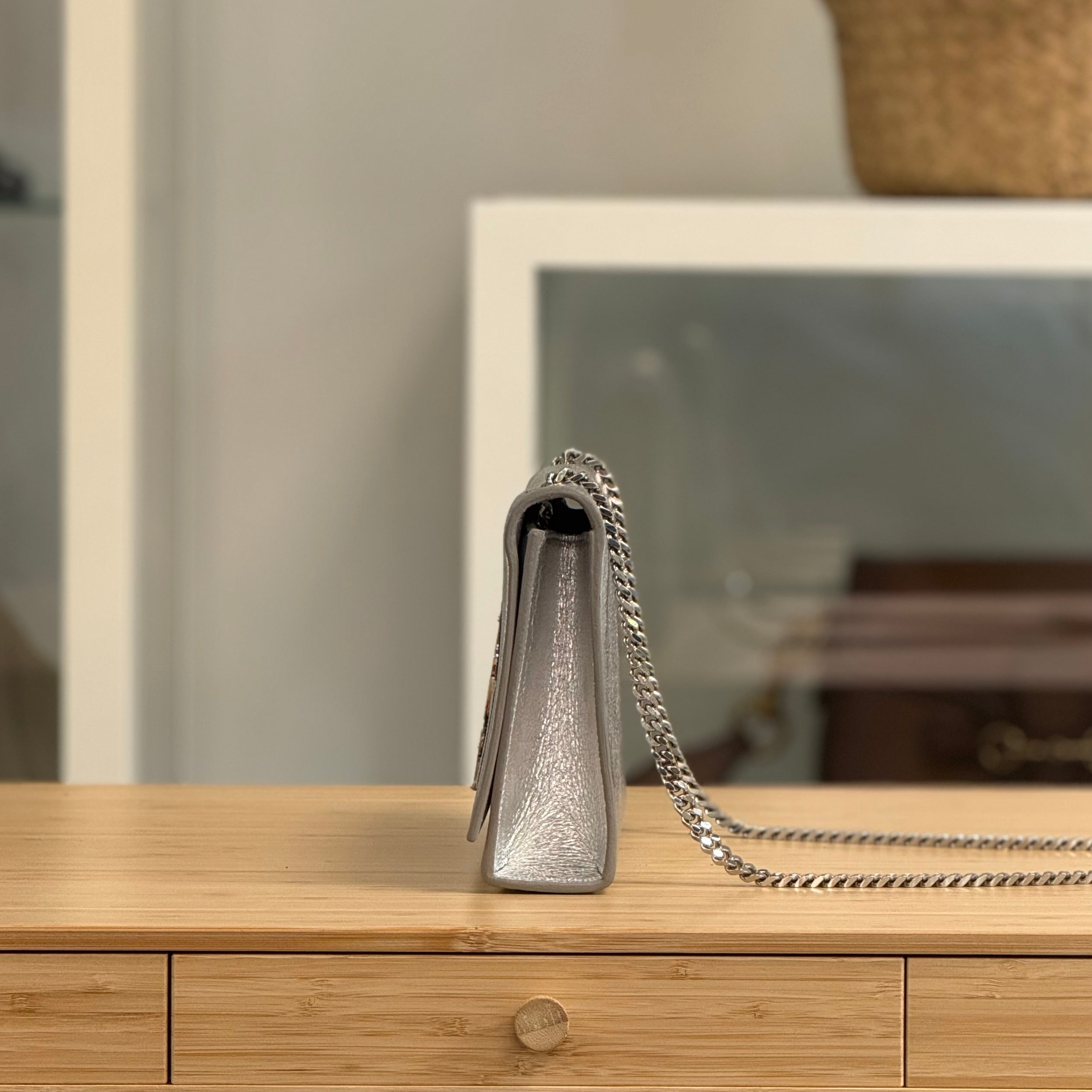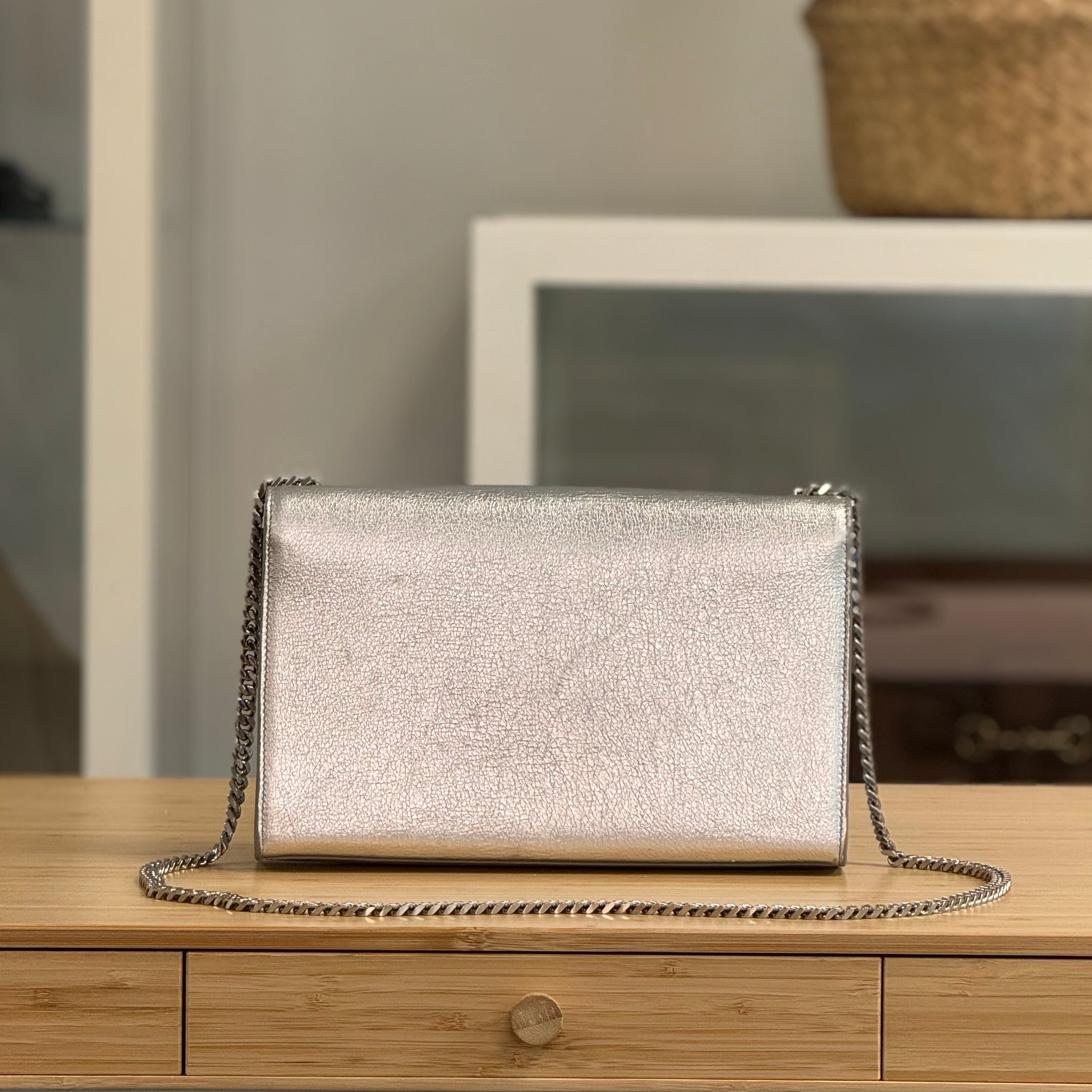 Description: This Saint Laurent Cloud Star Monogram Kate Flap has a long chain strap. It has a flap closure with a magnetic press-stud fasten. Inside there is 1 flat pocket.