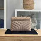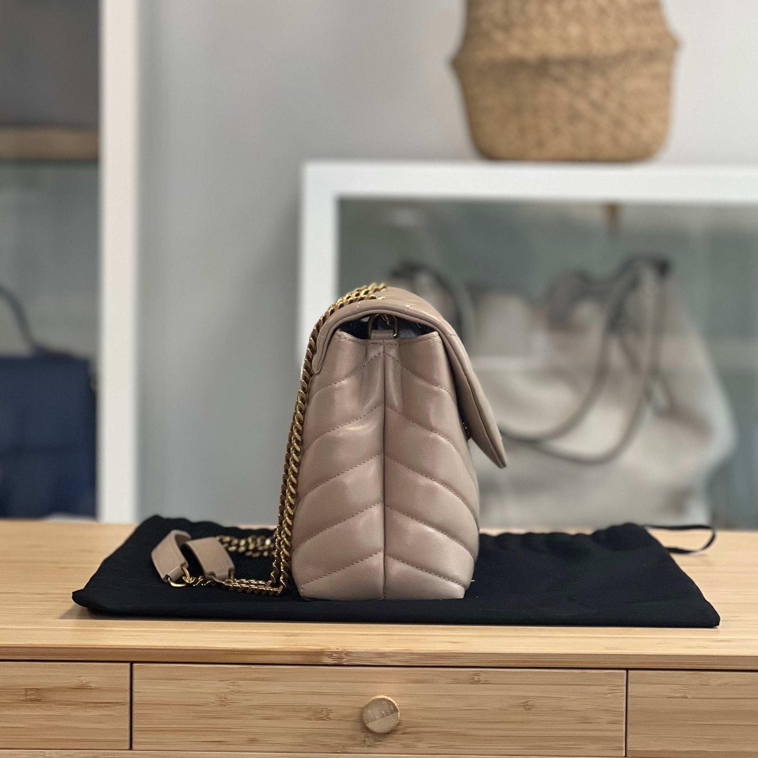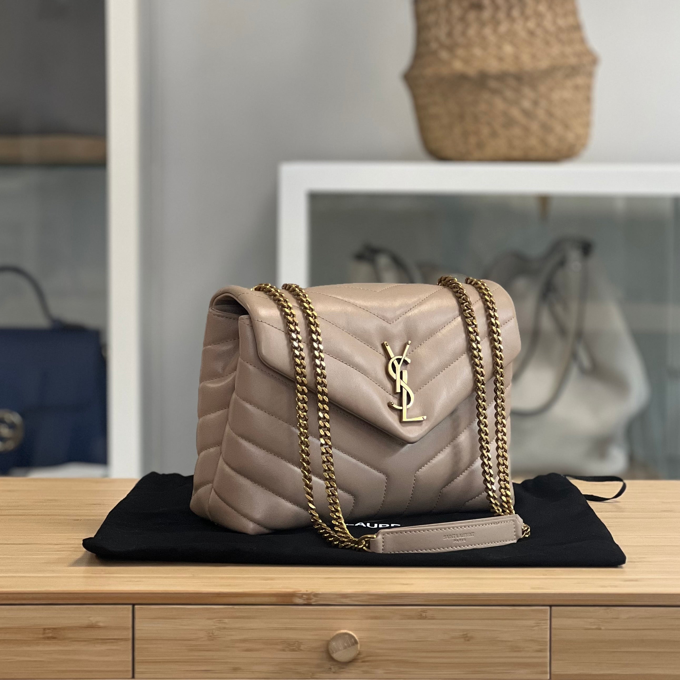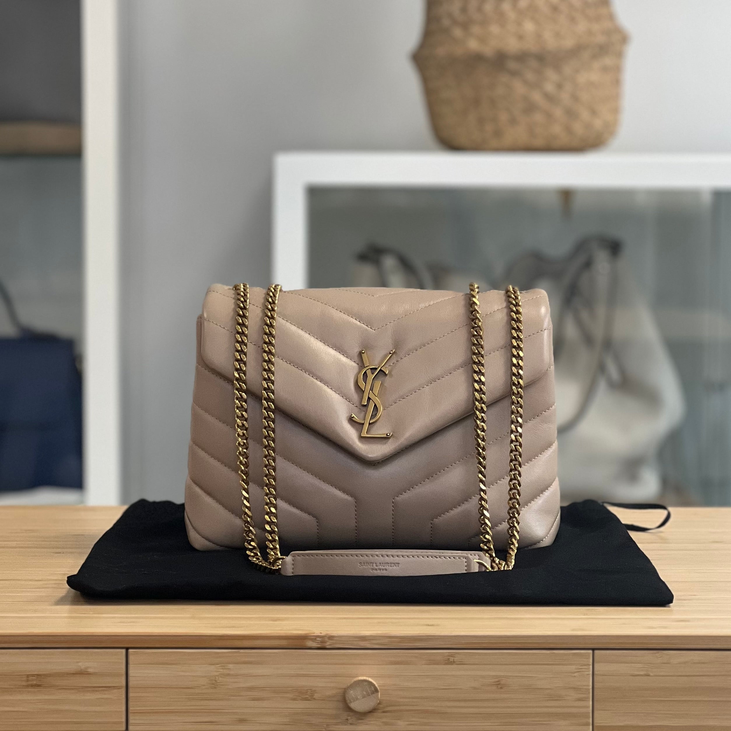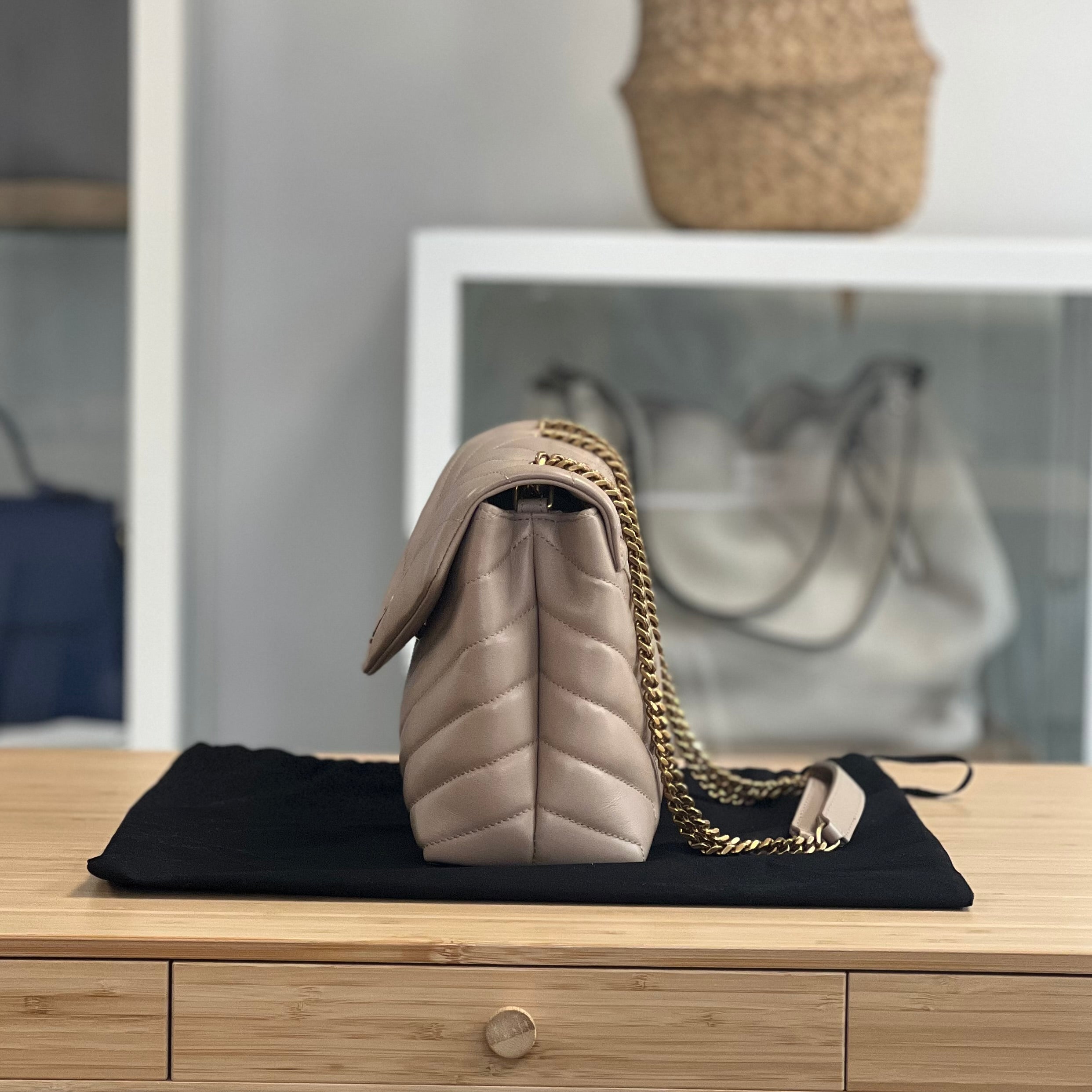 Description: This Saint Laurent Loulou has an adjustable strap and a flap closure with a magnetic press-stud fasten. Inside there are 2 compartments divided by a central zipped pocket. In the back compartment there is 1 flat pocket.