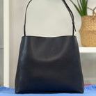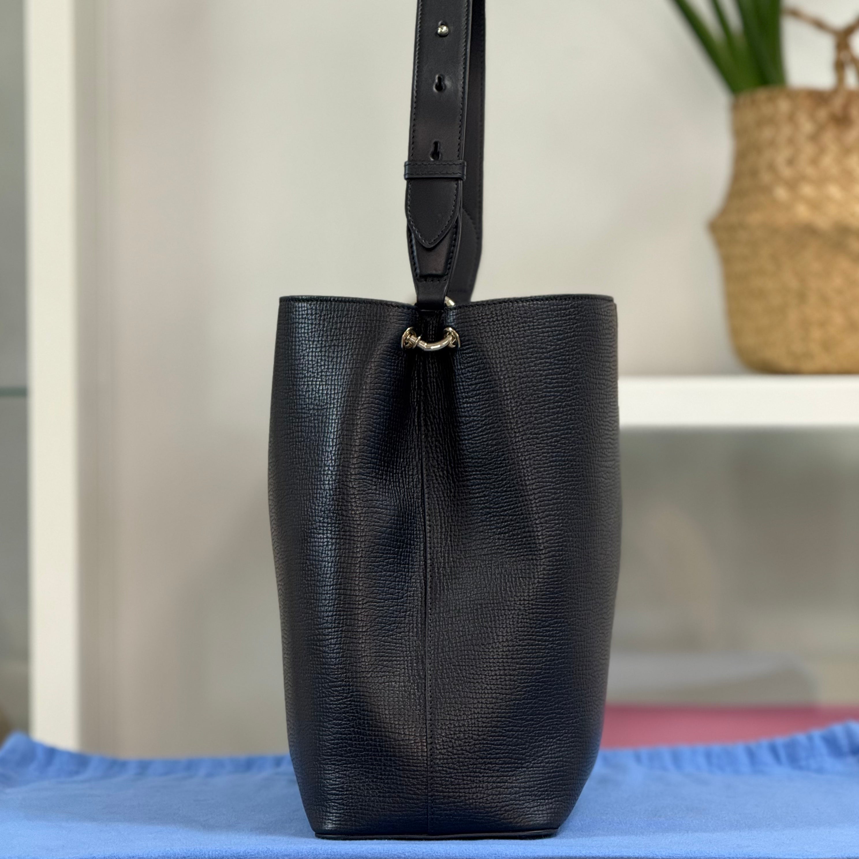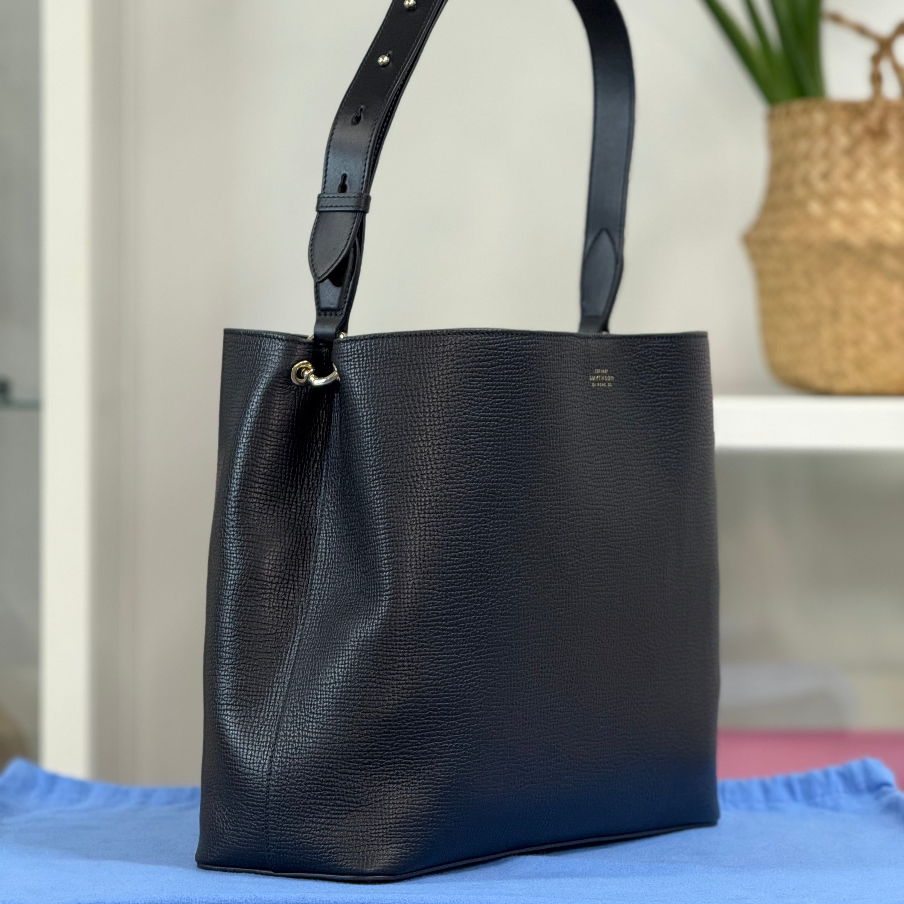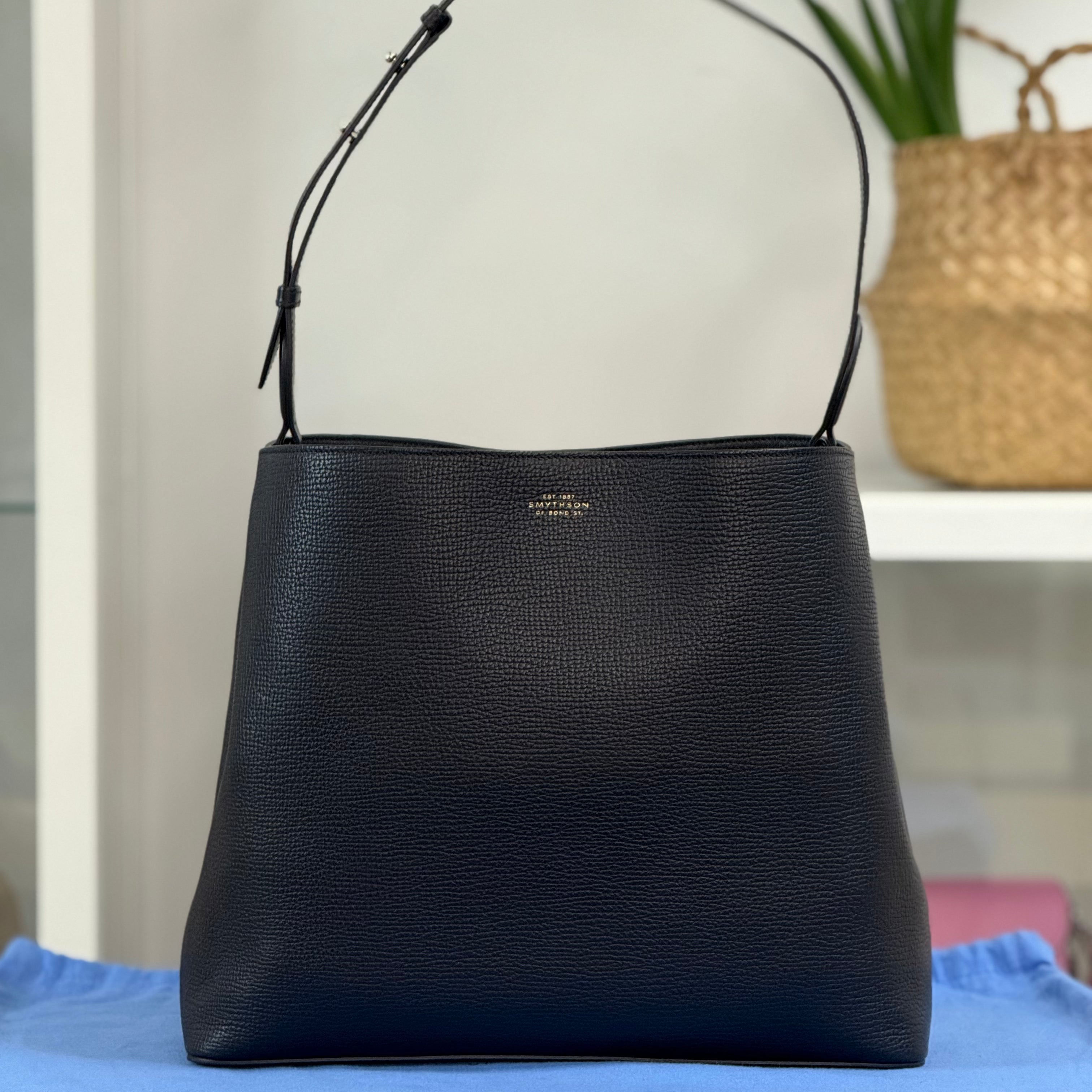 Description: This Smythson Ludlow Shoulder has an adjustable top handle. It has 4 base studs. It has a magnetic stud closure. Inside it has a central zipped section.
