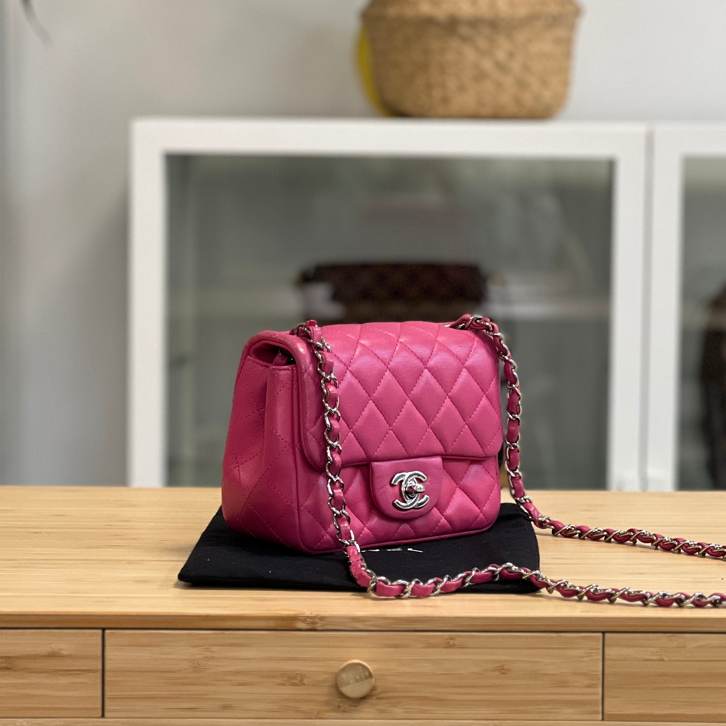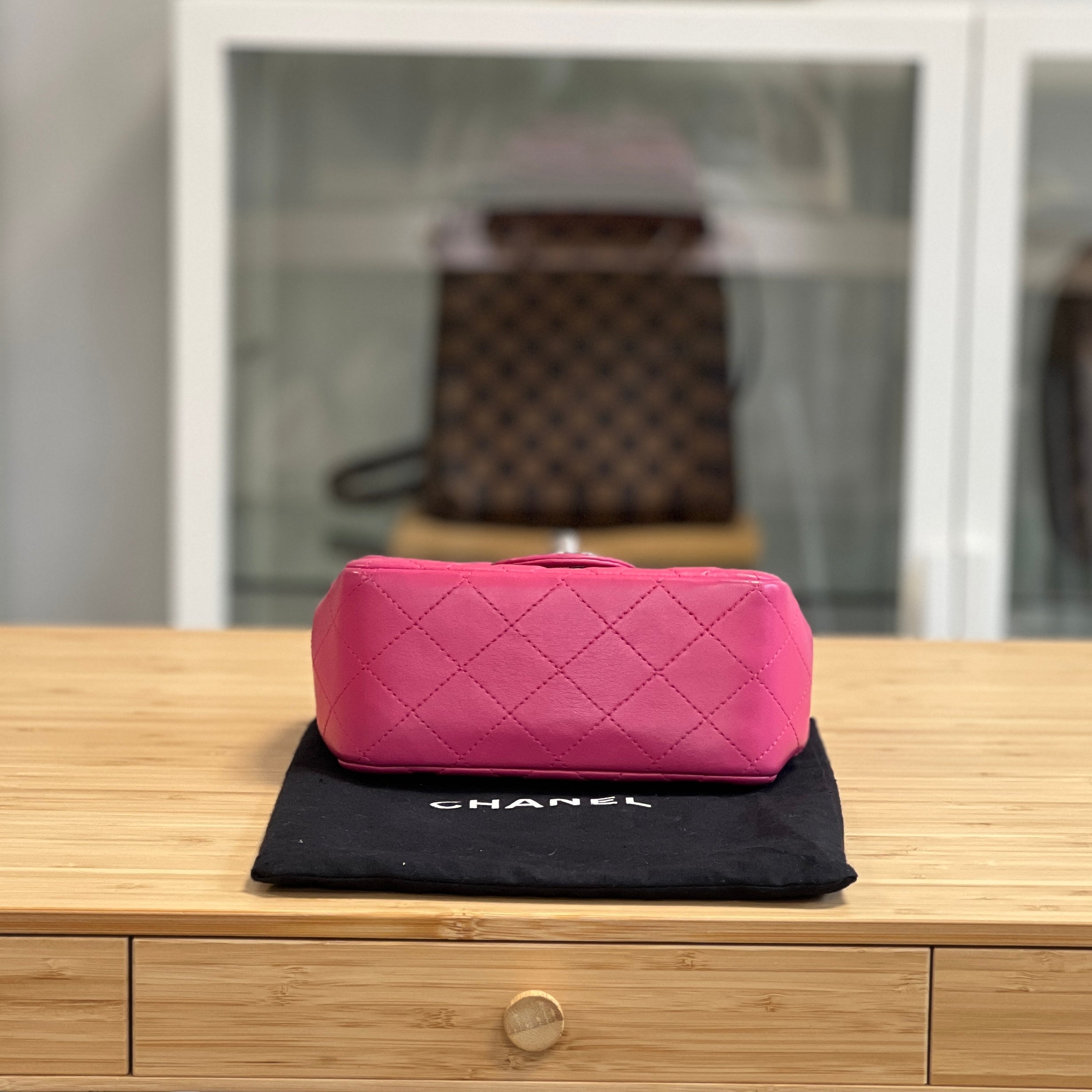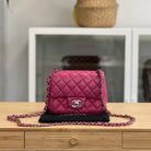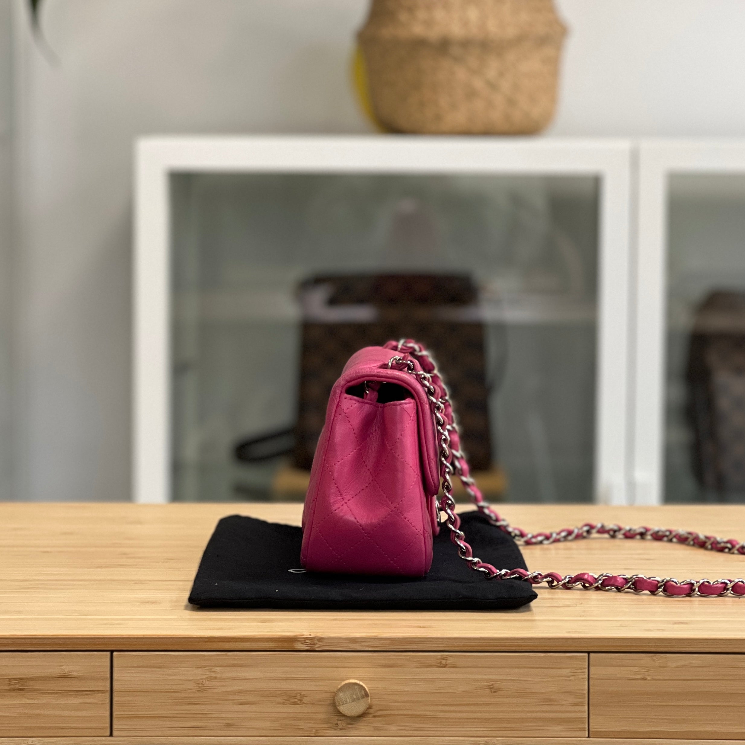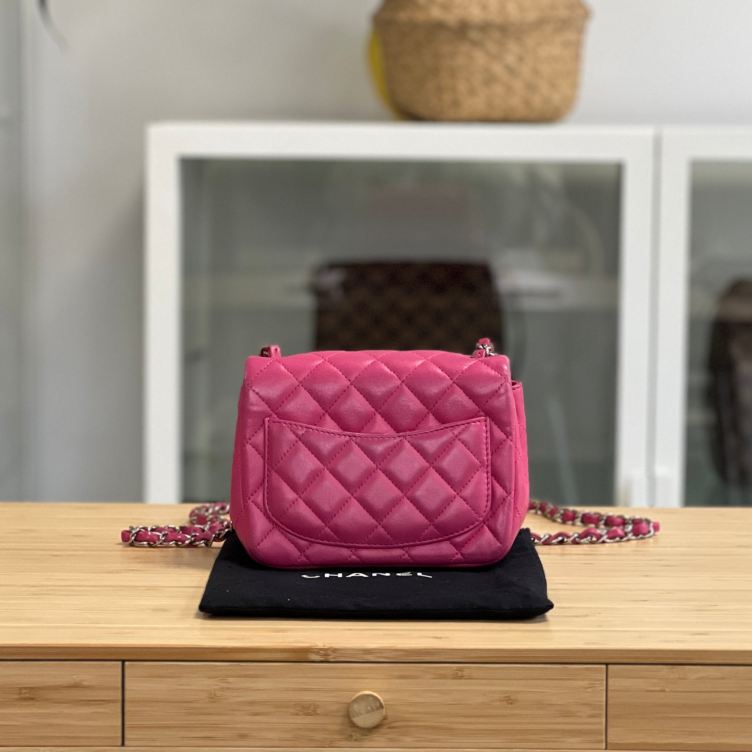 Description: This Chanel Mini Flap has a leather & chain strap. It has an exterior flat pocket on the back of the bag. It has a flap closure with CC turn-lock fasten. Inside there is 1 flat pocket and 1 zipped pocket. The date code begins 19 so it is from 2014.
