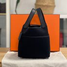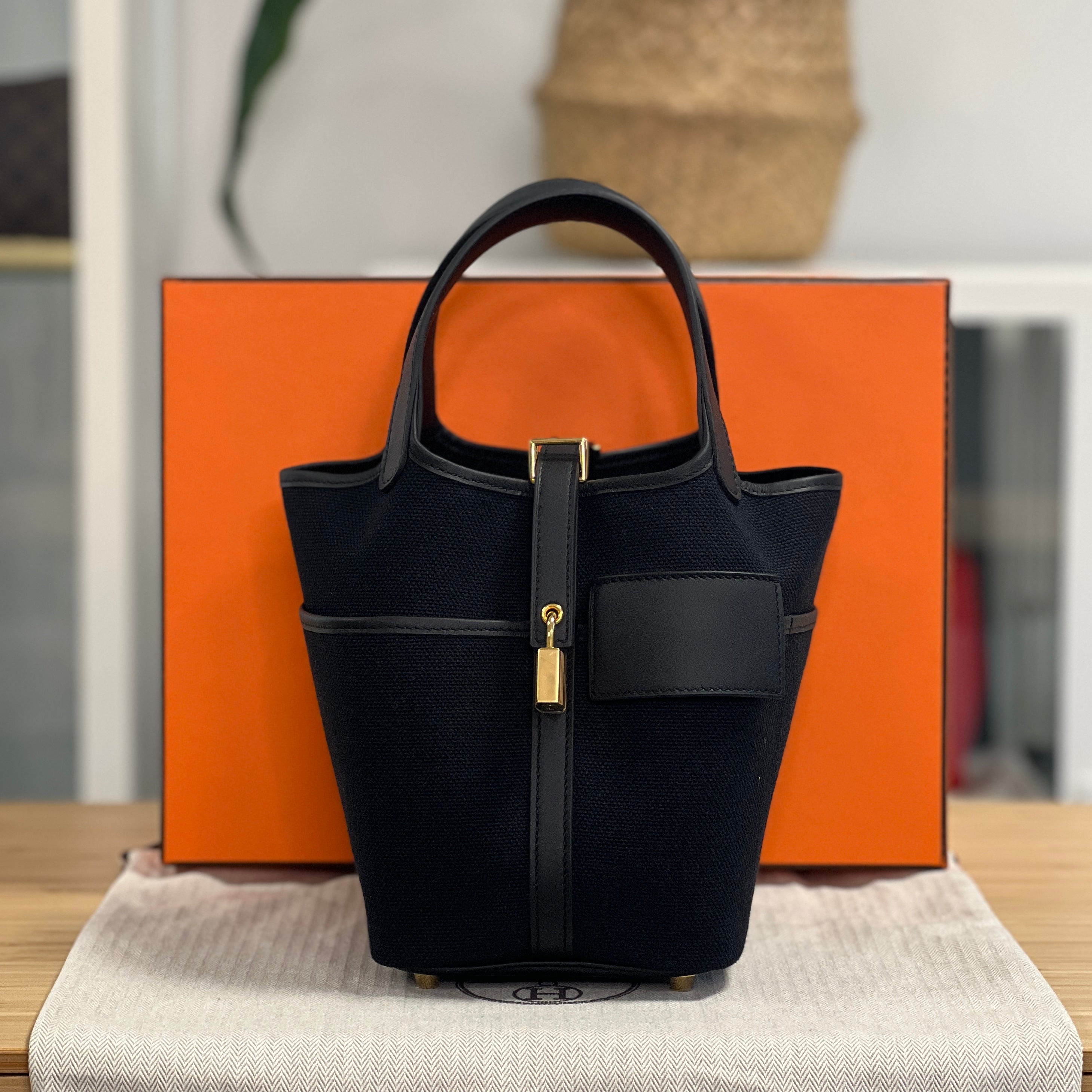 Description: This Hermès Picotin Cargo has double top handles and 4 base studs. It has 4 exterior flat pockets, one with a flap closure. It has a belt closure with a padlock fasten. The blind stamp is a ‘B’ with no surrounding shape, so it is from 2023.