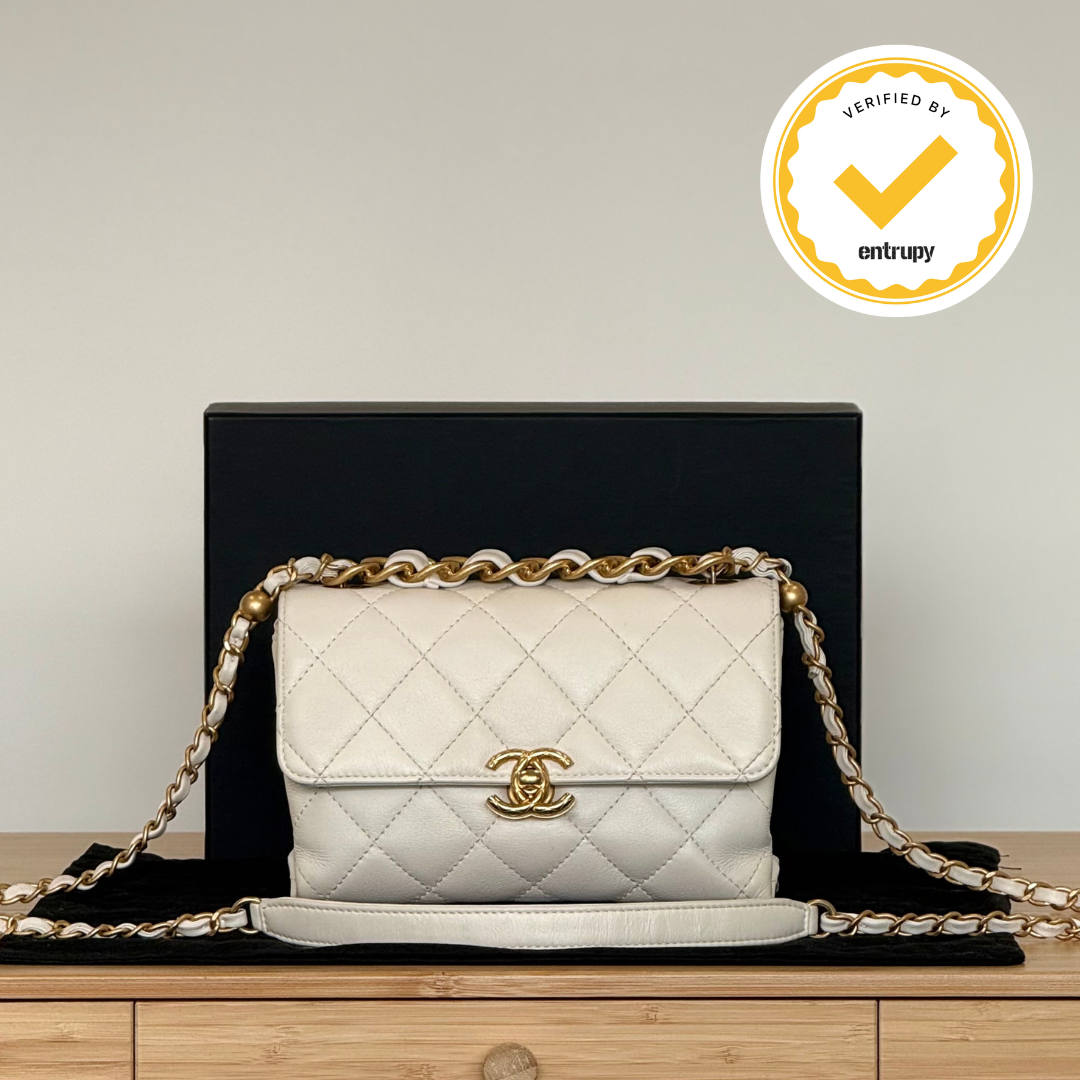 Description: This Chanel 22S Chain Top Handle has a top handle, a long strap and a flap closure with a CC turn-lock. It has an external flat pocket on the back of the bag. Inside There is 1 flat pocket. Verified with Entrupy Authentication.