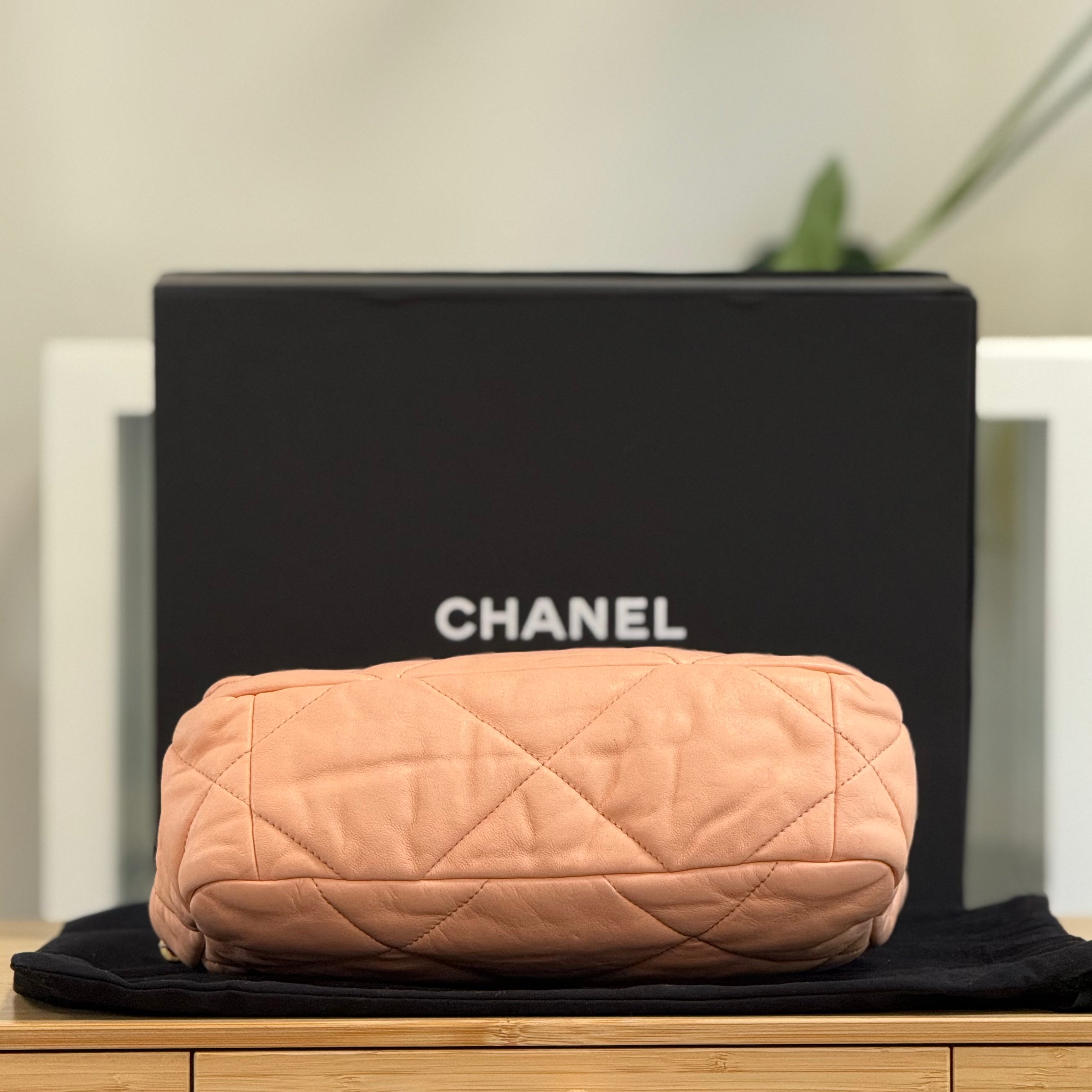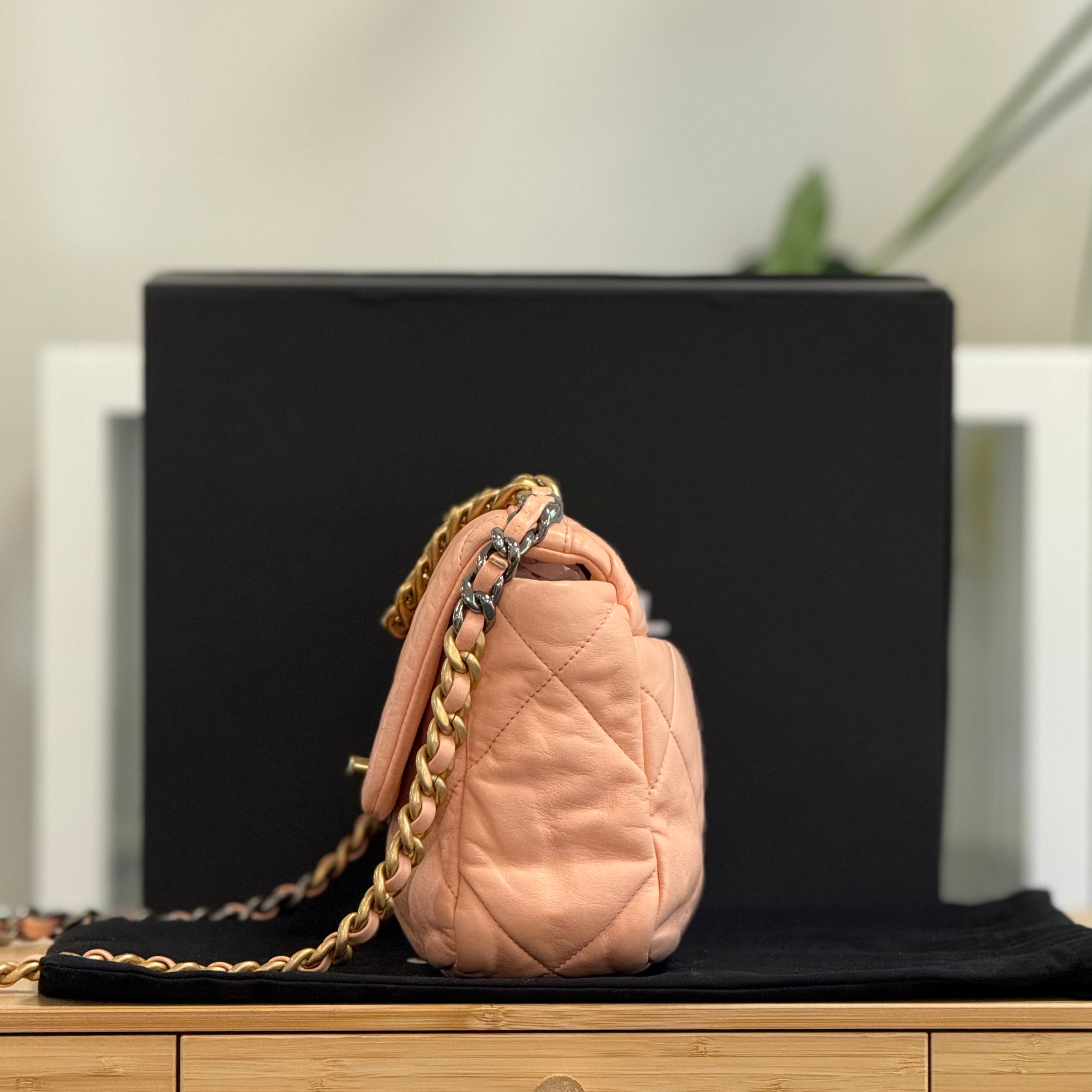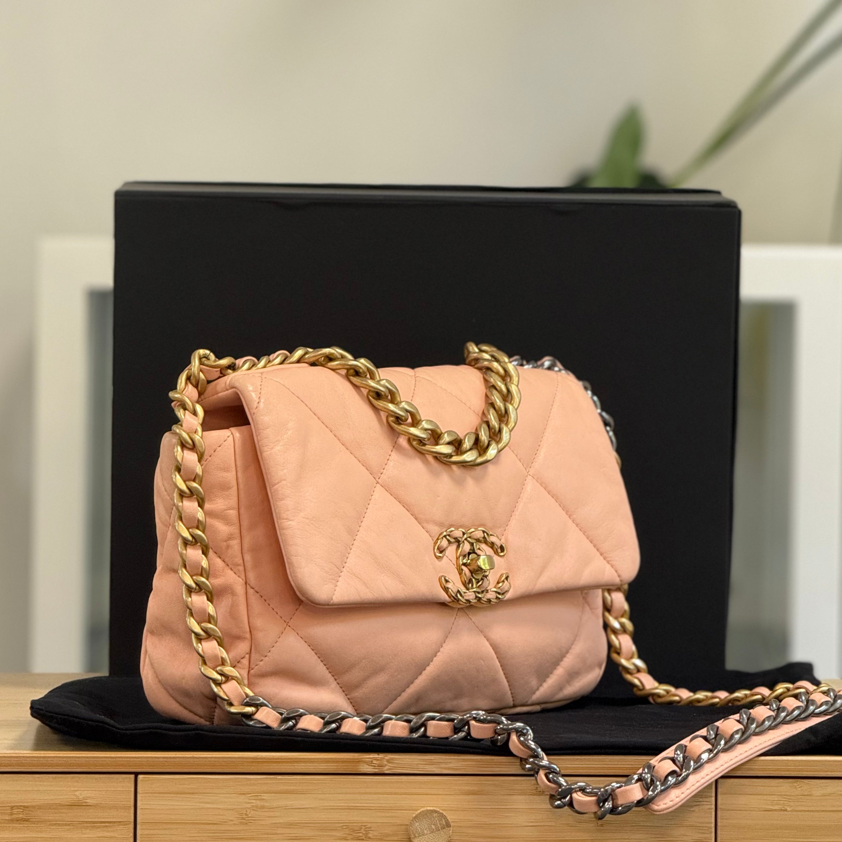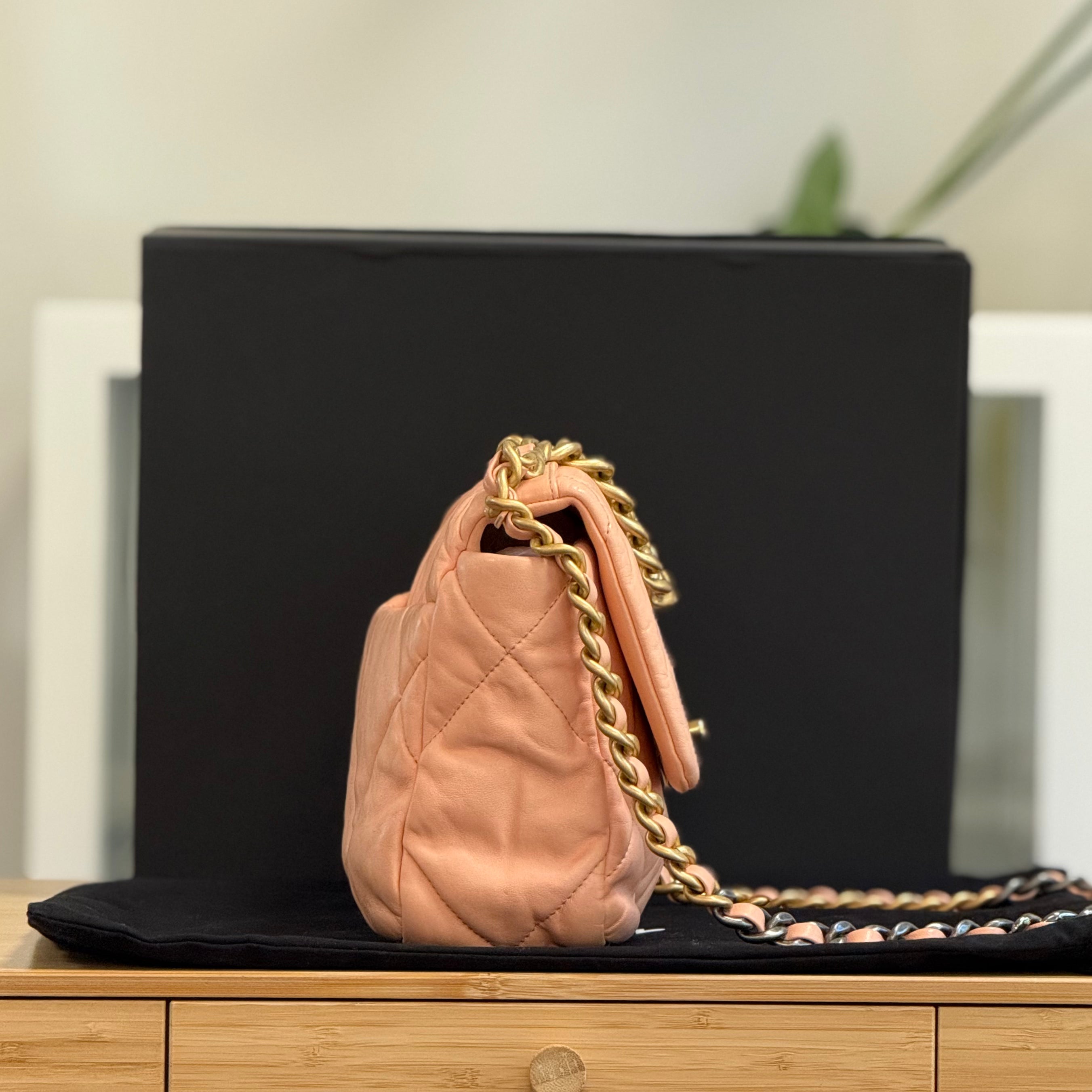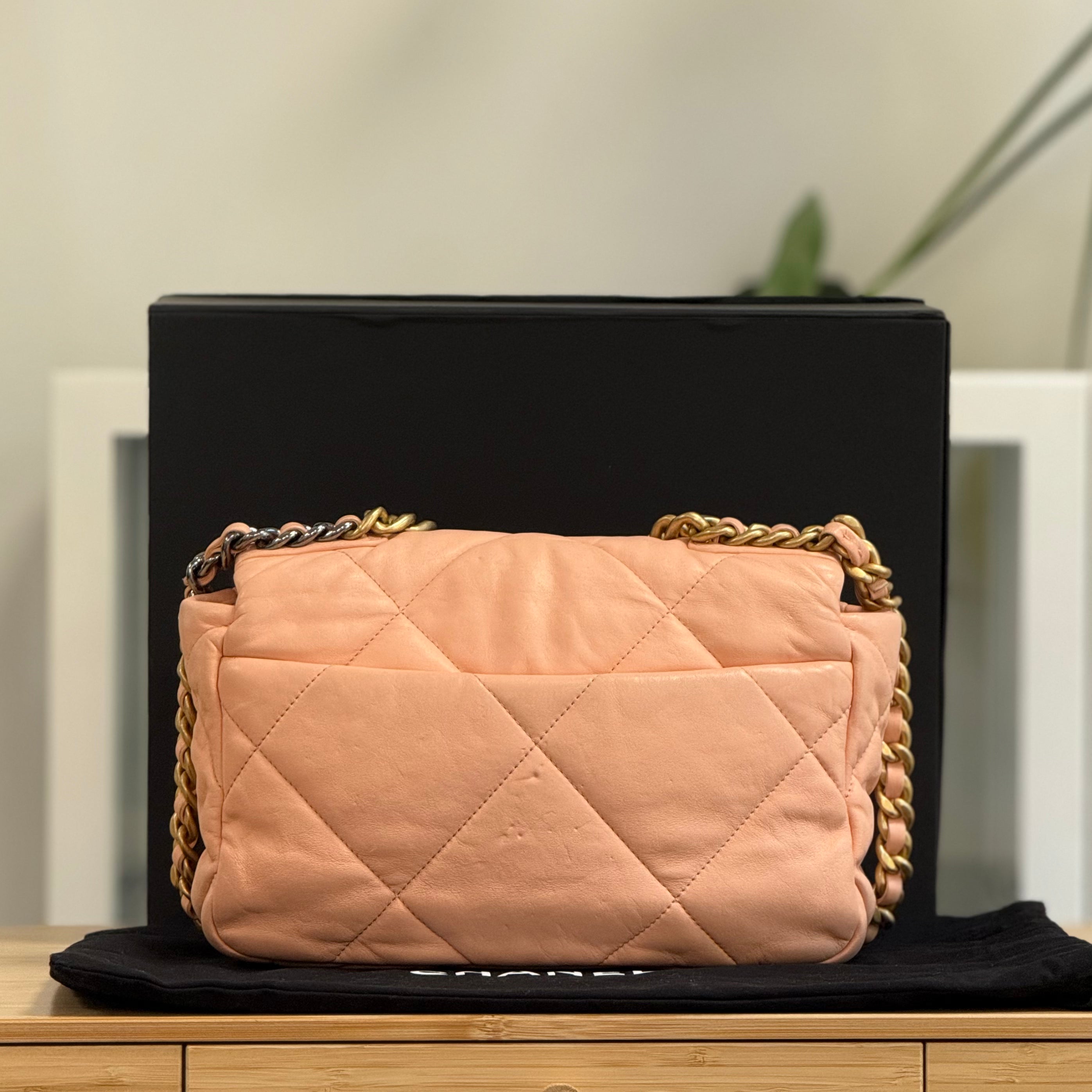 Description: This Chanel 19 has a top handle and a long strap. It has an exterior flat pocket with a magnetic press-stud fasten on the back of the bag. Inside there is one main compartment and a zipped pocket.