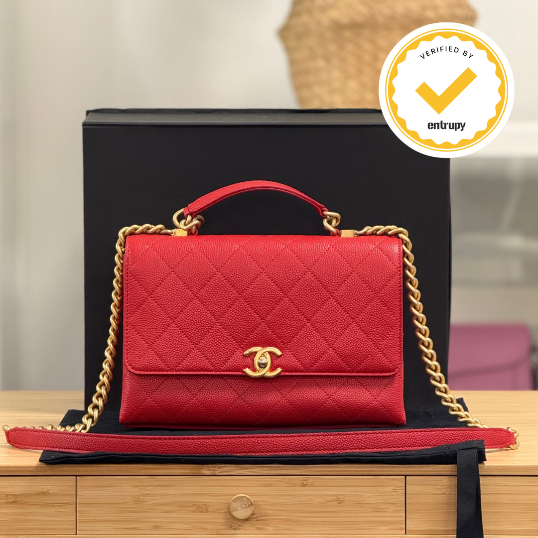 Description: This Chanel Chic Affinity Top Handle Bag has a top handle and a long strap. It has an exterior flat pocket on the back of the bag. It has a flap closure with a CC turn-lock. Inside there are 2 compartments divided by a central zipped pocket. In the back compartment there is 1 zipped pocket. This is a 27 series Chanel so it is from 2019.