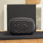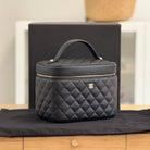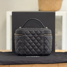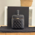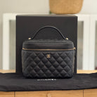 Description: This Chanel Vanity has 1 top handle. It has a lid closure with a zip-around fasten. Inside it has 1 mirror which is attached to the interior by a chain with a press-stud. It has 1 flat pocket and 2 elasticated flat pockets.