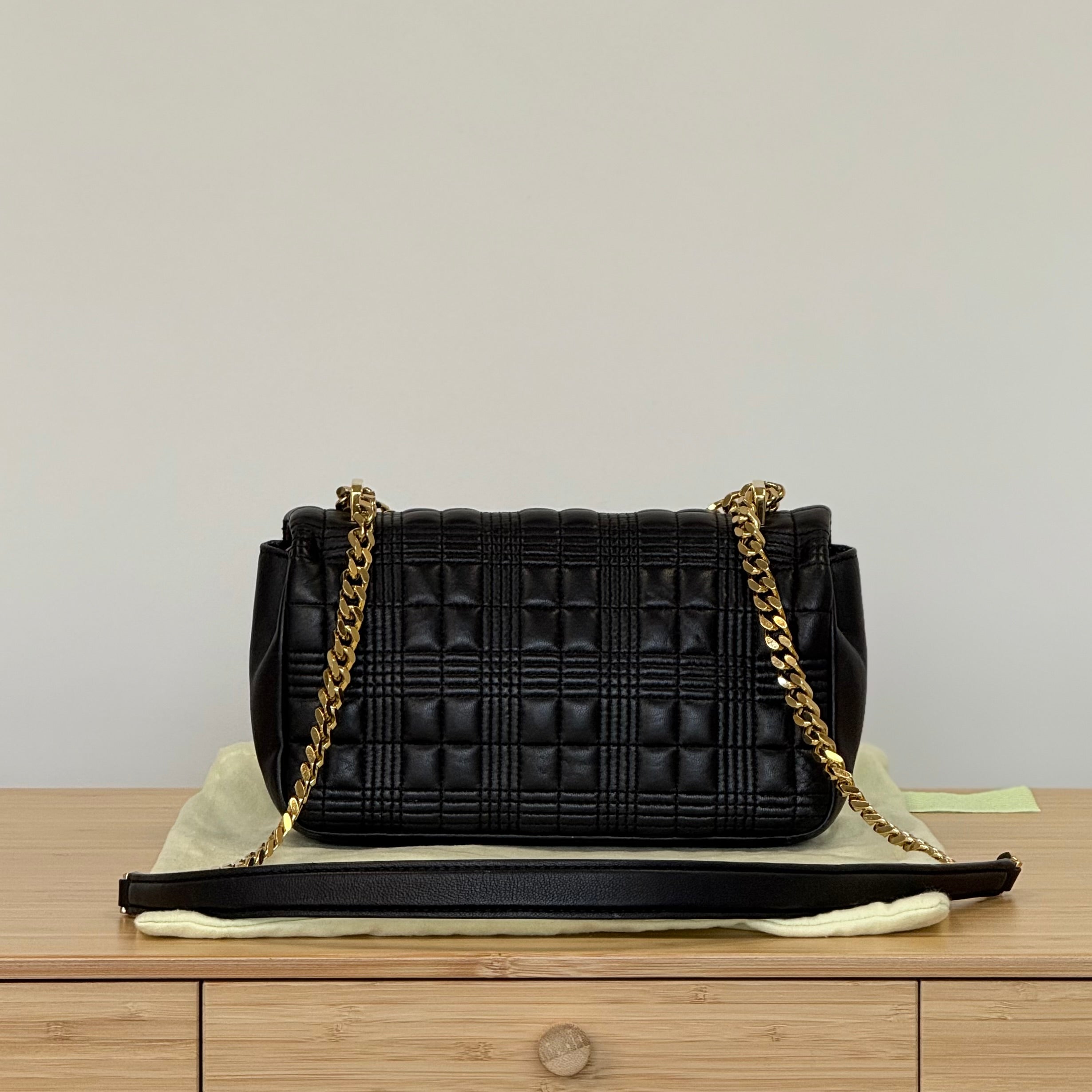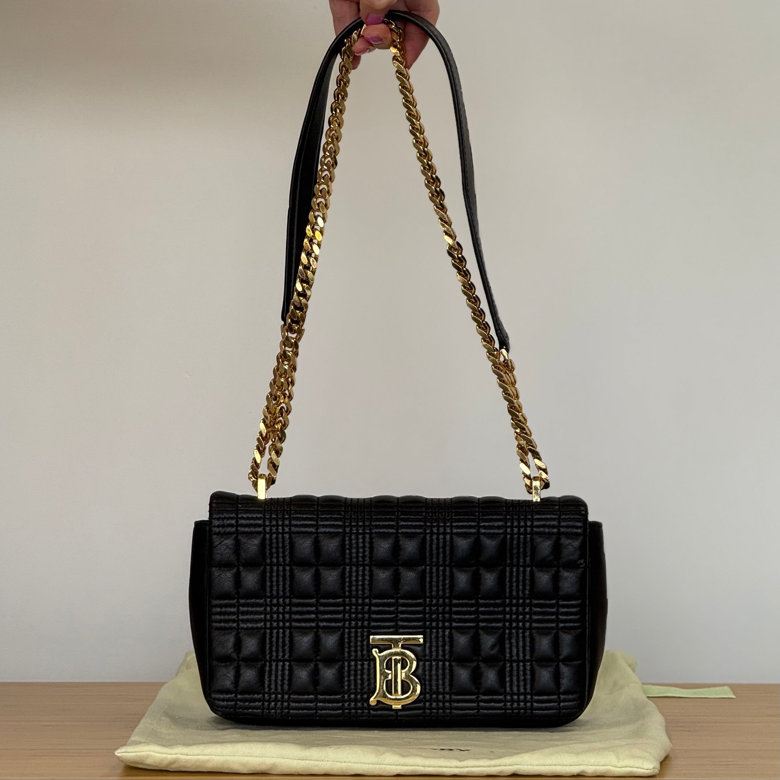 Description: This Burberry Lola in size small has a long adjustable strap, and a flap closure with a press-stud fasten. Inside there is 1 flat pocket.