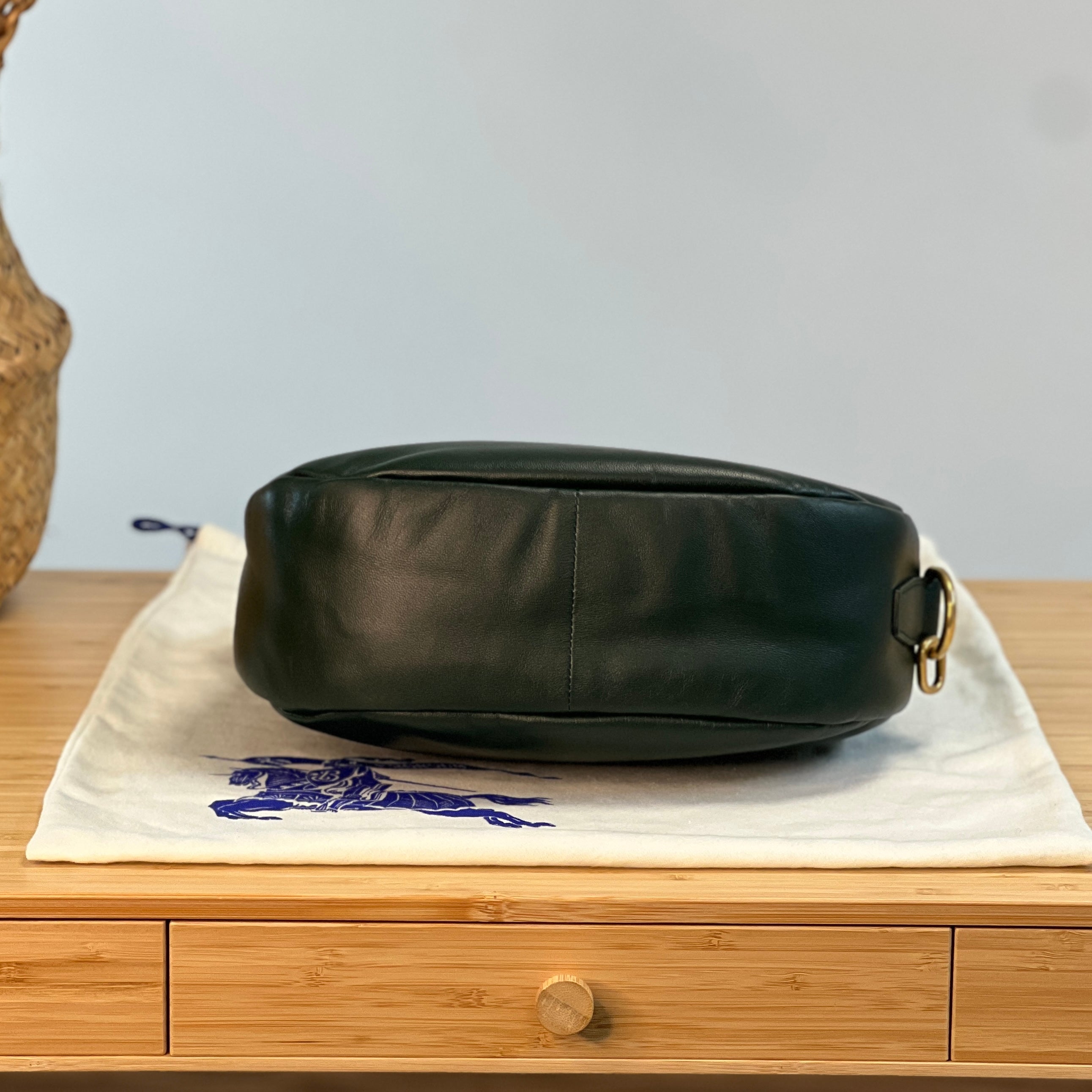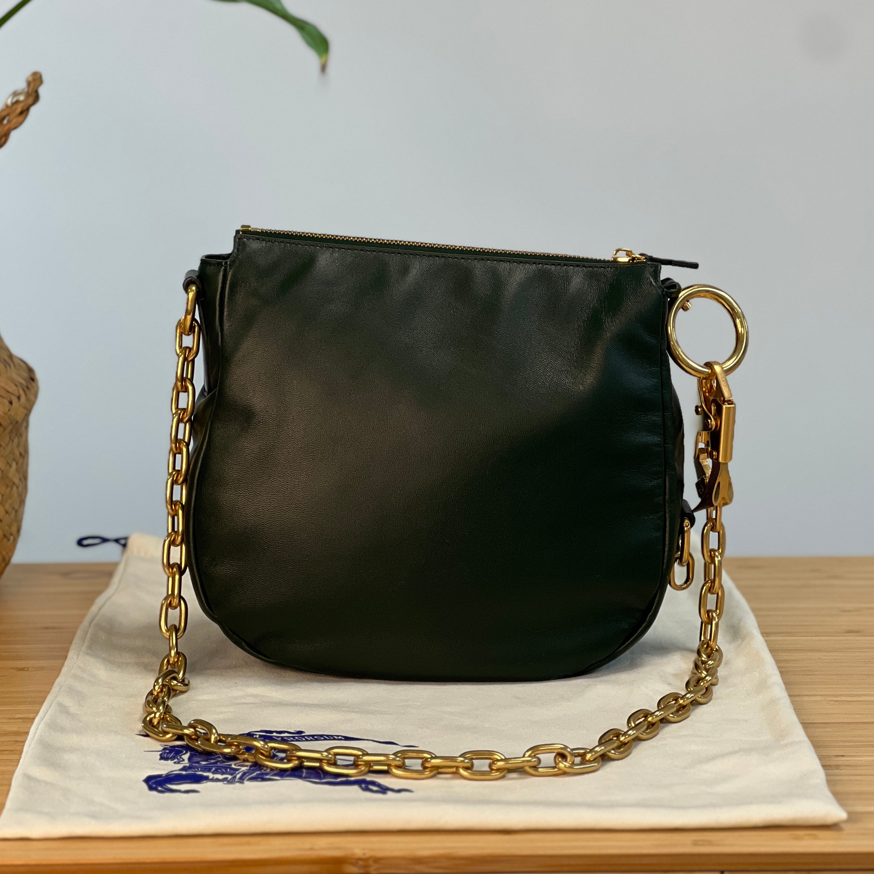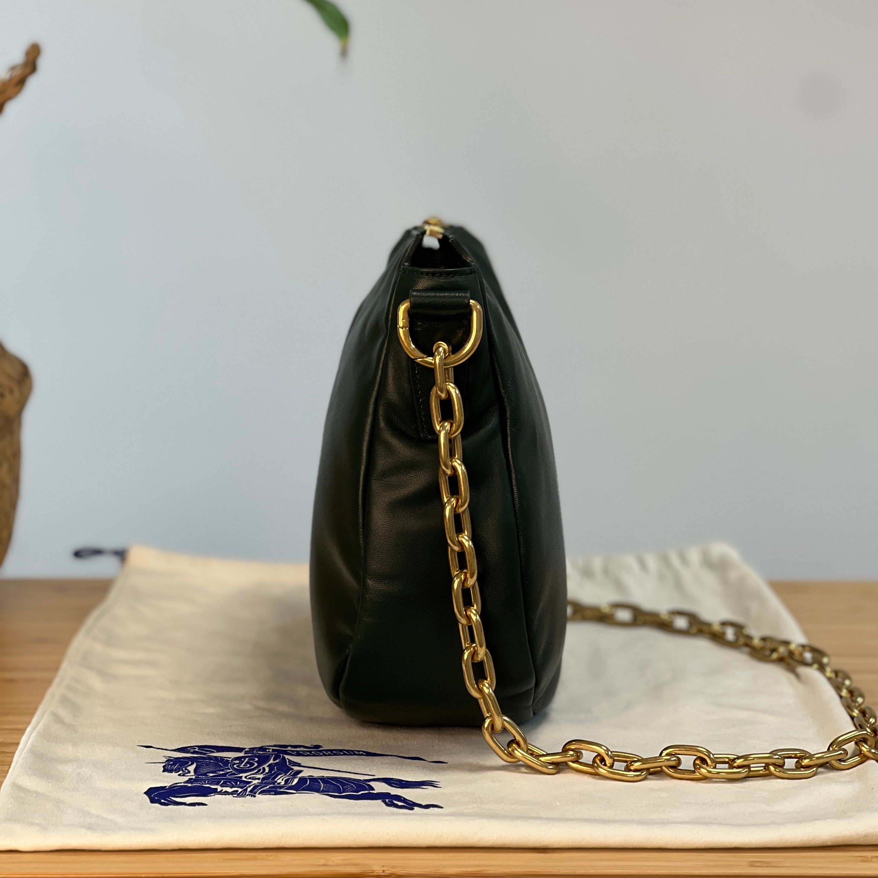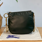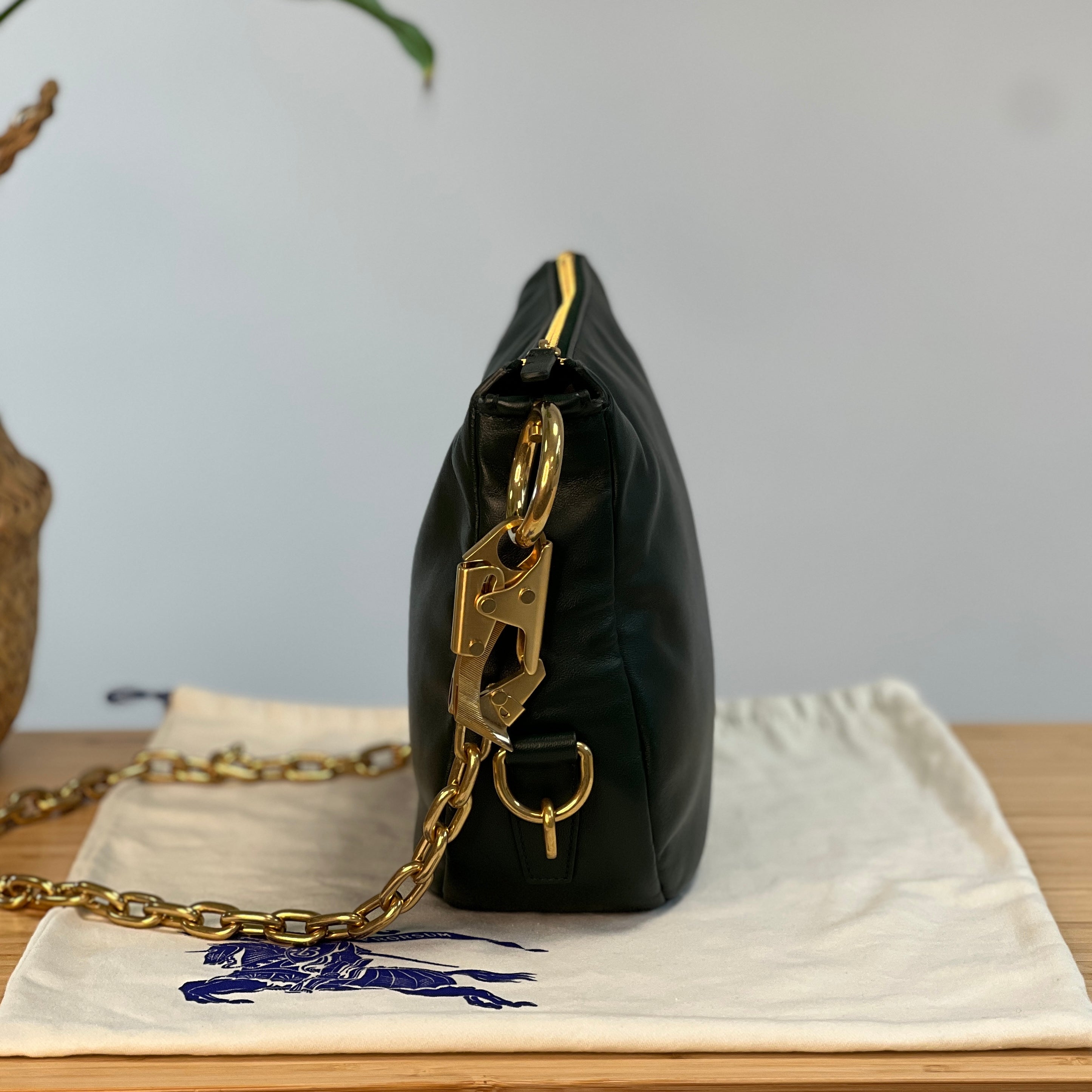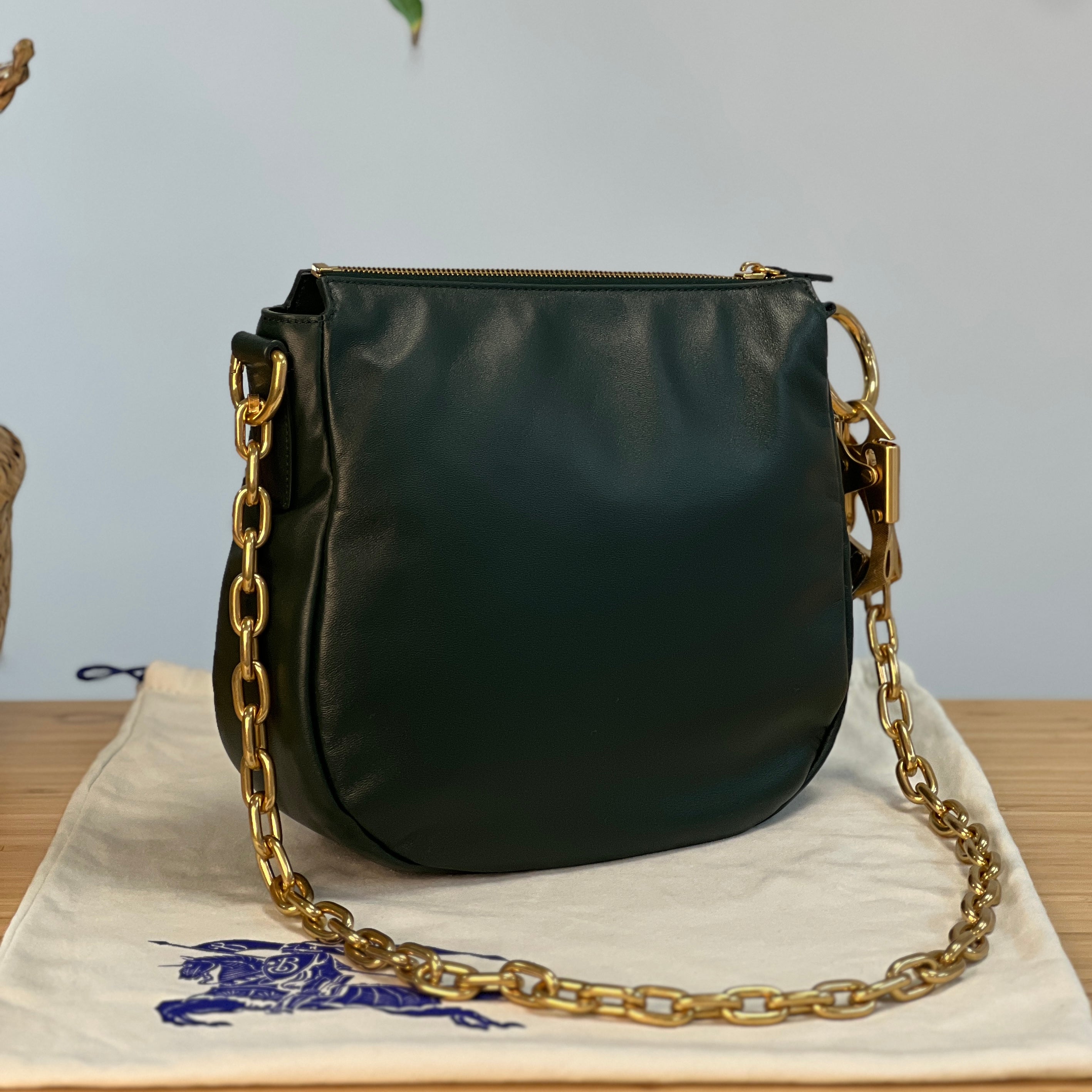 Description: This Burberry The Knight had a chain strap with 2 positions. It has a zip top closure.