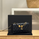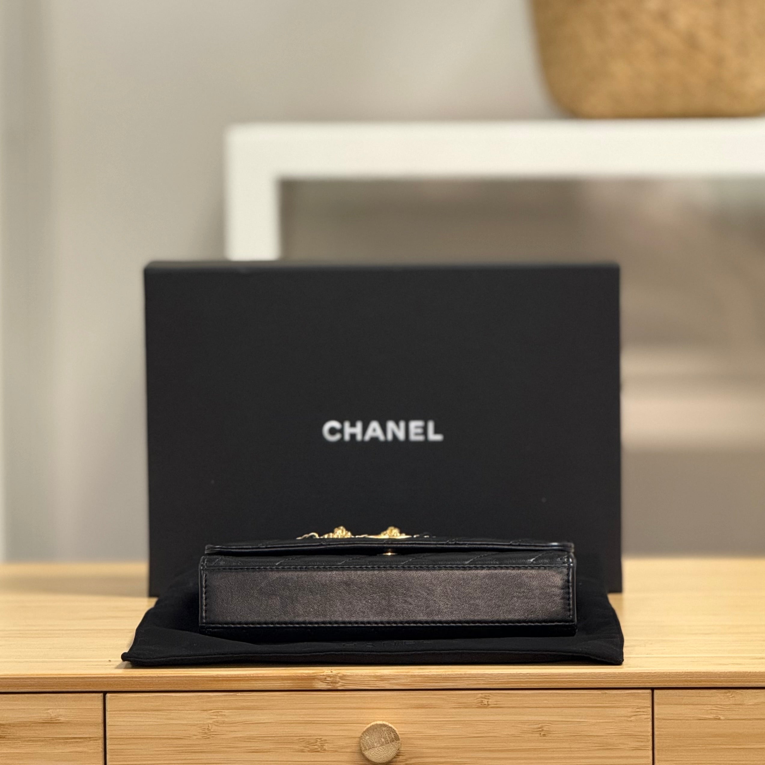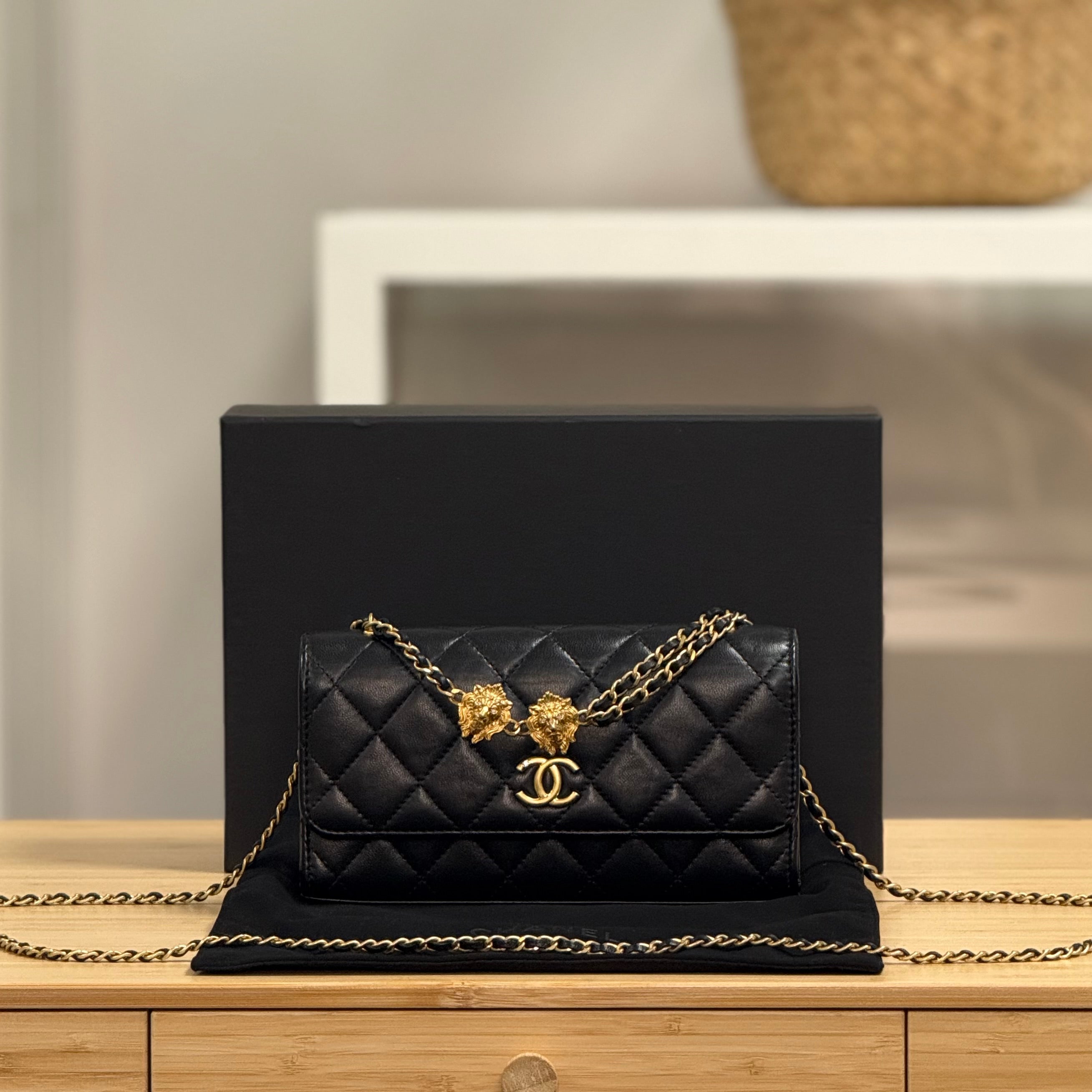 Description: This Chanel 23A Lion WOC has a long leather & chain strap and a leather & chain top handle with lion crystal embellished charms. It has a flap closure with press-stud fasten. It has an exterior flat pocket on the back of the bag. Inside there is 1 flat pocket and 2 card slots. It is from Chanel’s 2023 Autumn collection. (23A)