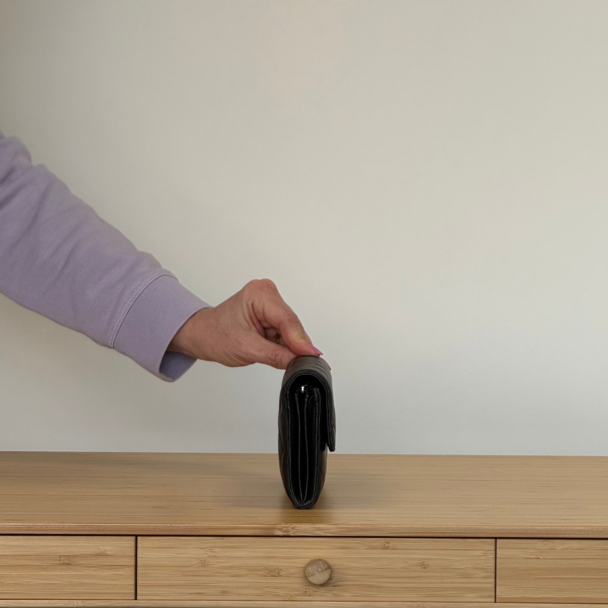 Description: This Chanel Long Classic Flap Wallet has a flap closure with a press-stud fasten. Inside there are 2 flat pockets, 6 card slots and 1 zipped pocket. It’s a 22 series Chanel so it is from 2016-17. Verified with Entrupy Authentication.