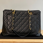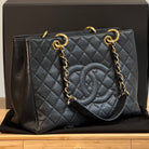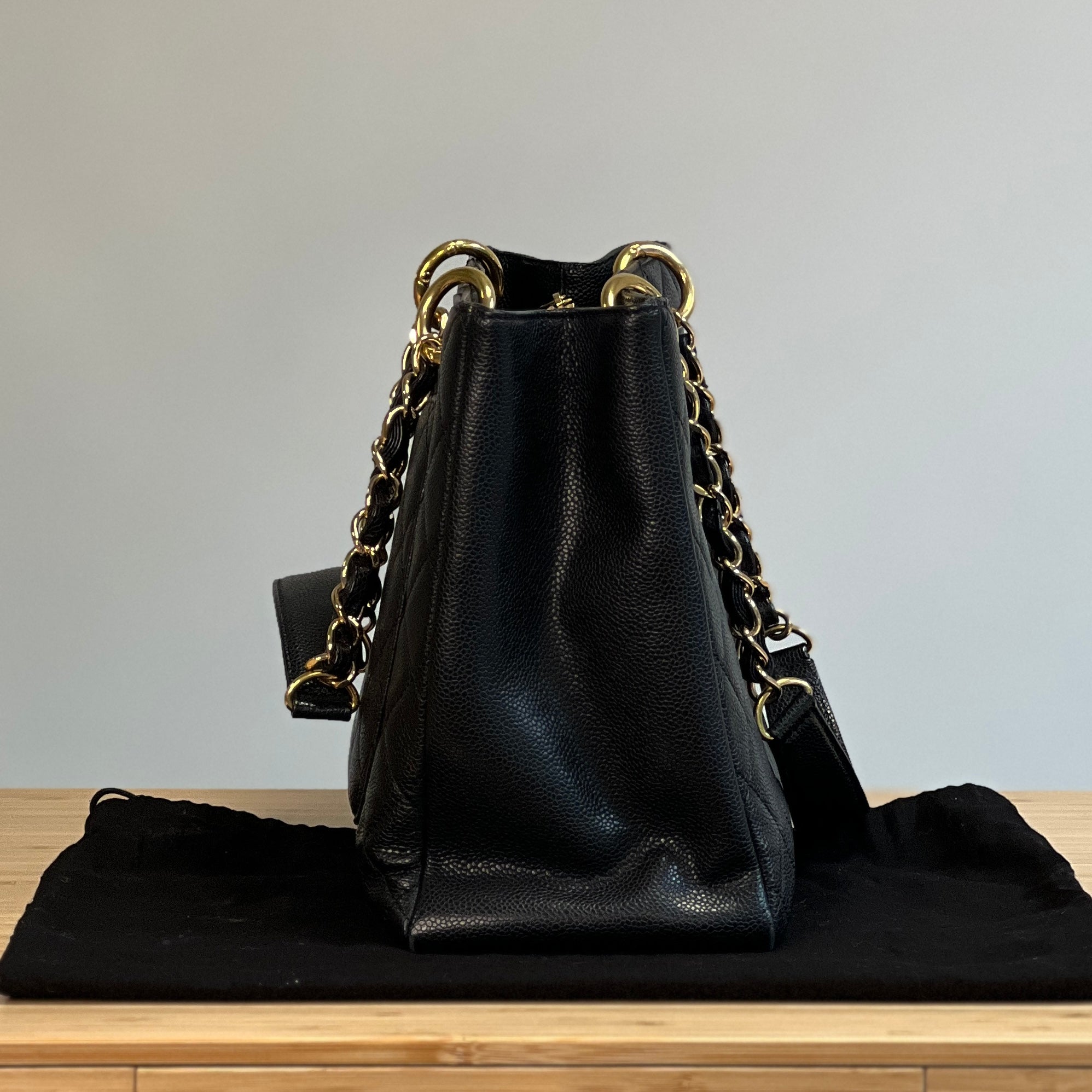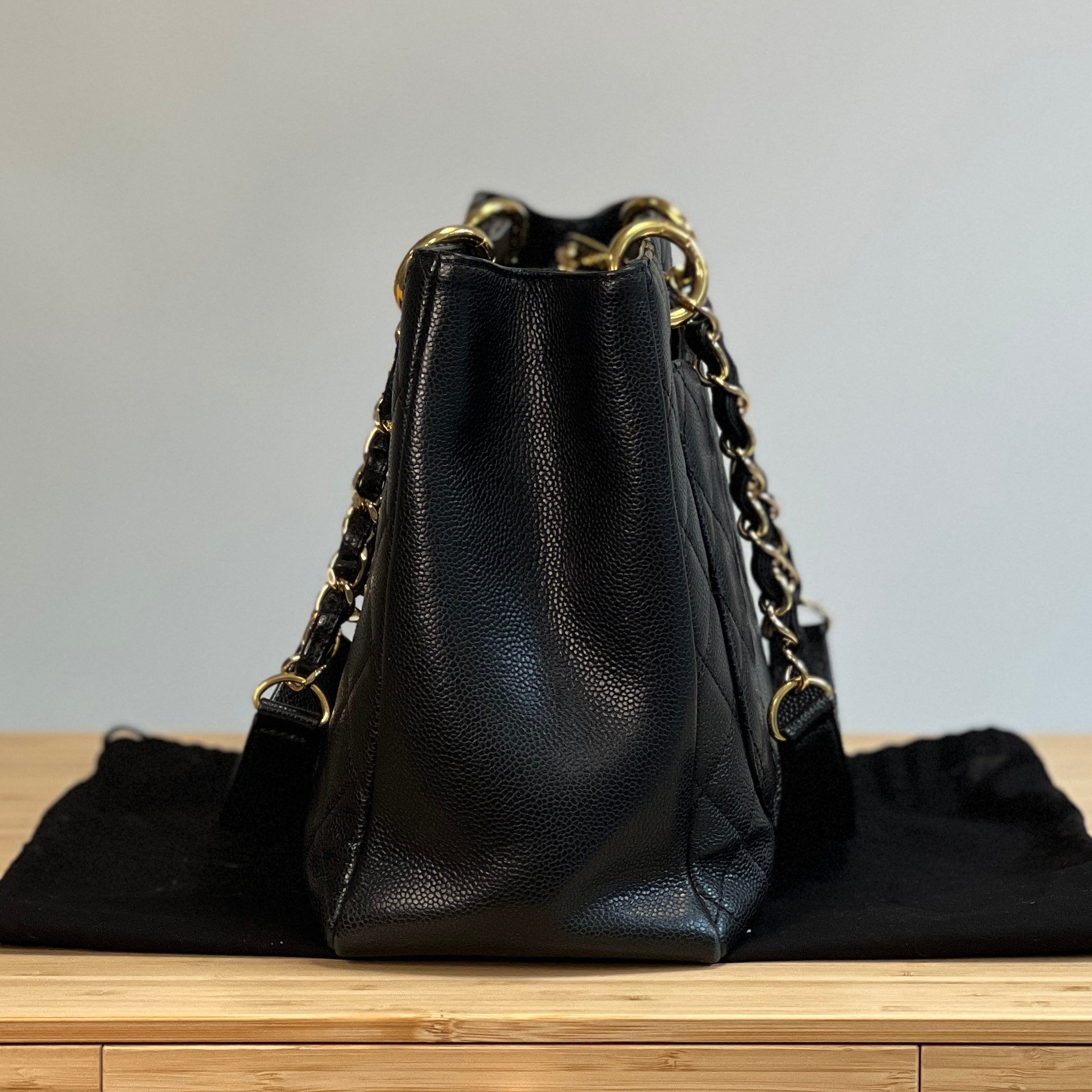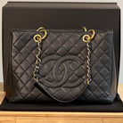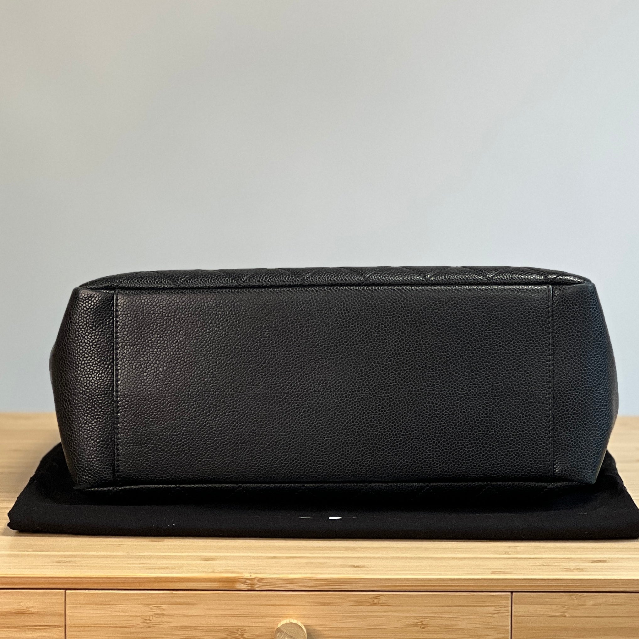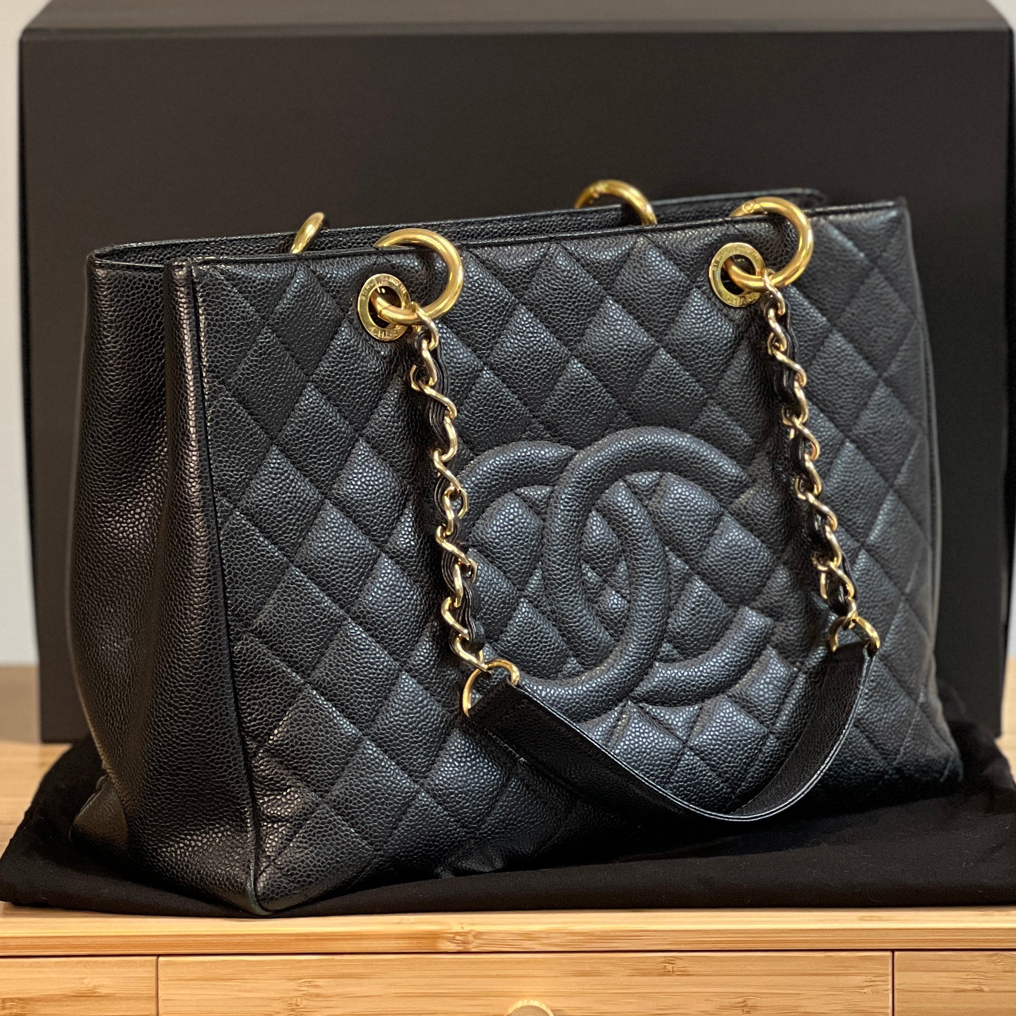 Description: This Chanel GST has double top handles and an exterior flat pocket. Inside there are 2 open compartments, and 1 central zipped compartment. In the back compartment, there is 1 zipped pocket. In the front compartment there is 1 flat pocket. The serial code begins 18, so it is from 2013-14.