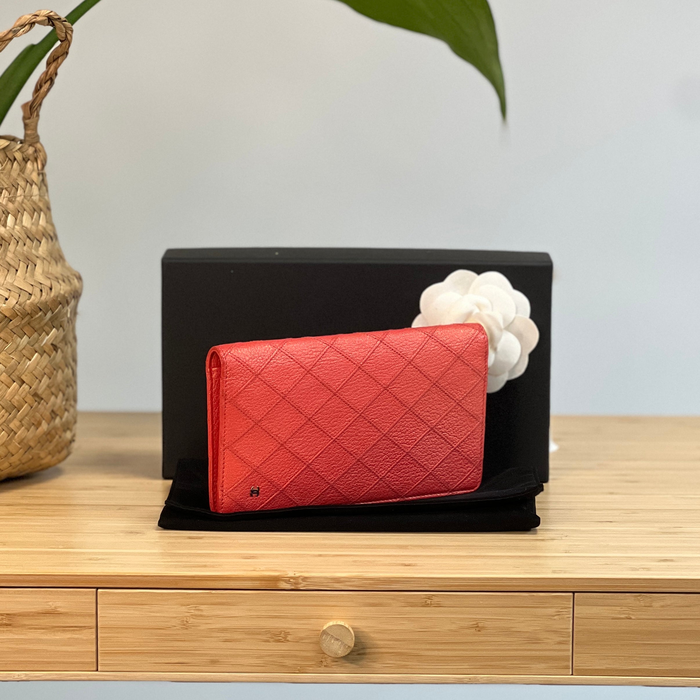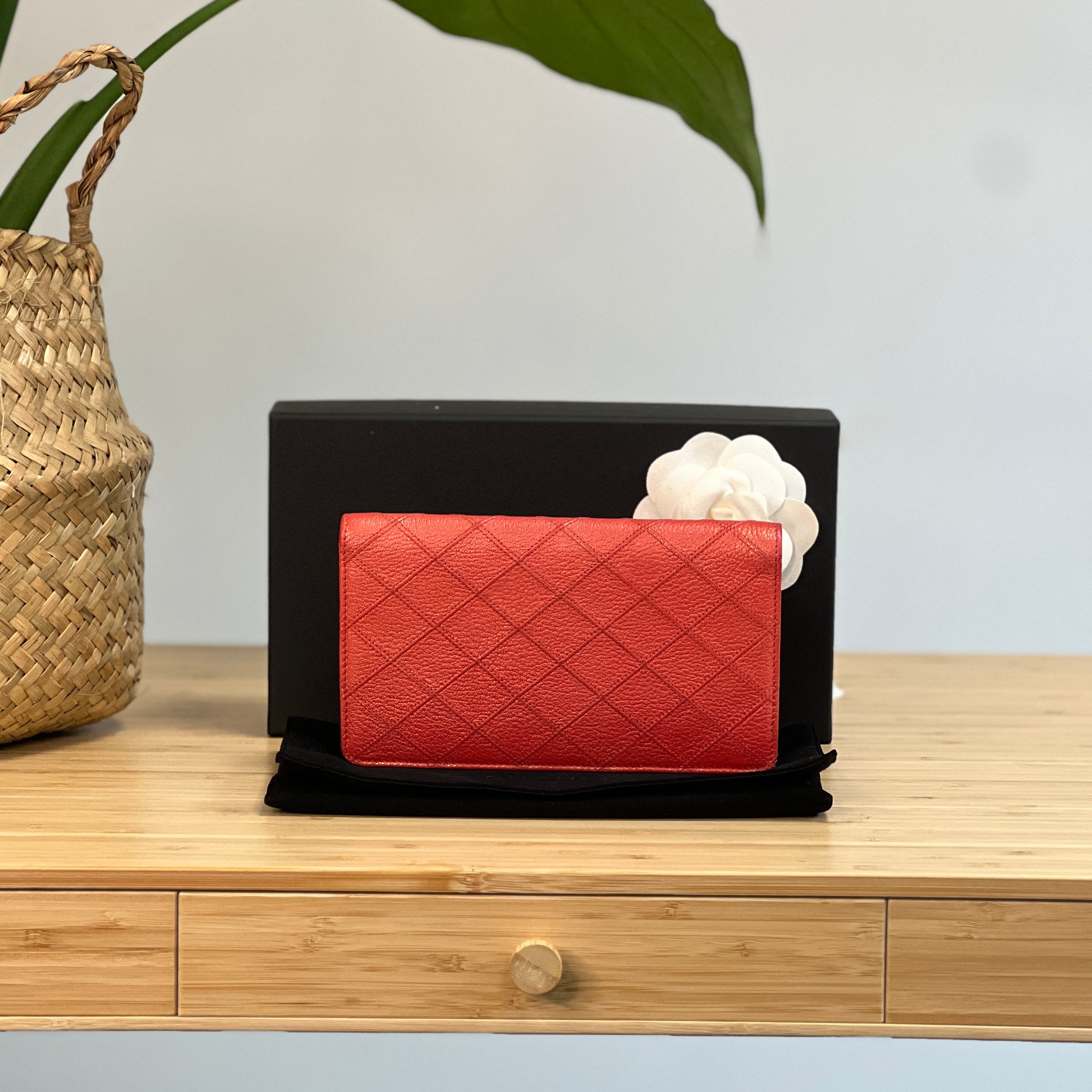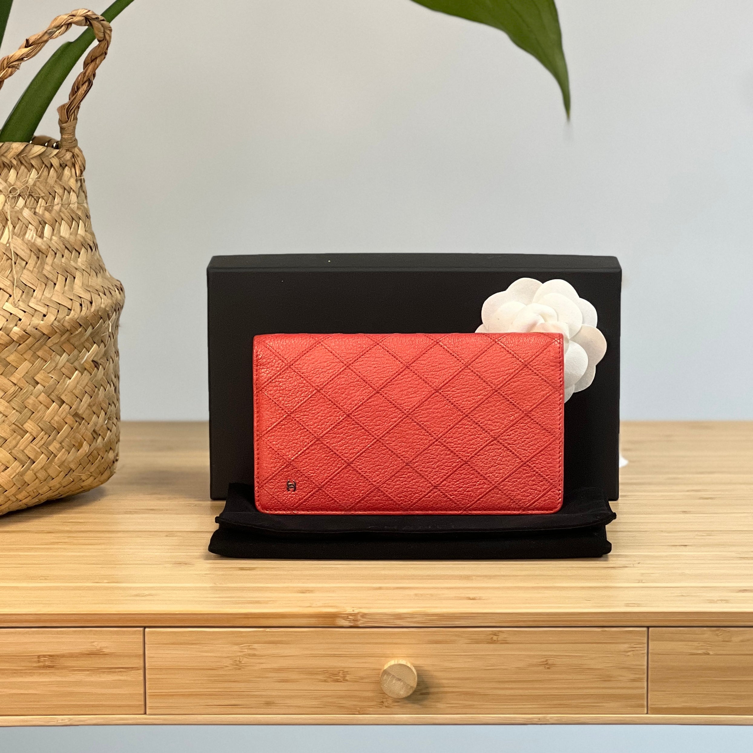 Description: This Chanel L Yen Wallet has a bifold opening. Inside there are 4 flat pockets, 1 zipped pocket, and 8 card slots. The serial number begins 17, so it is from 2015.