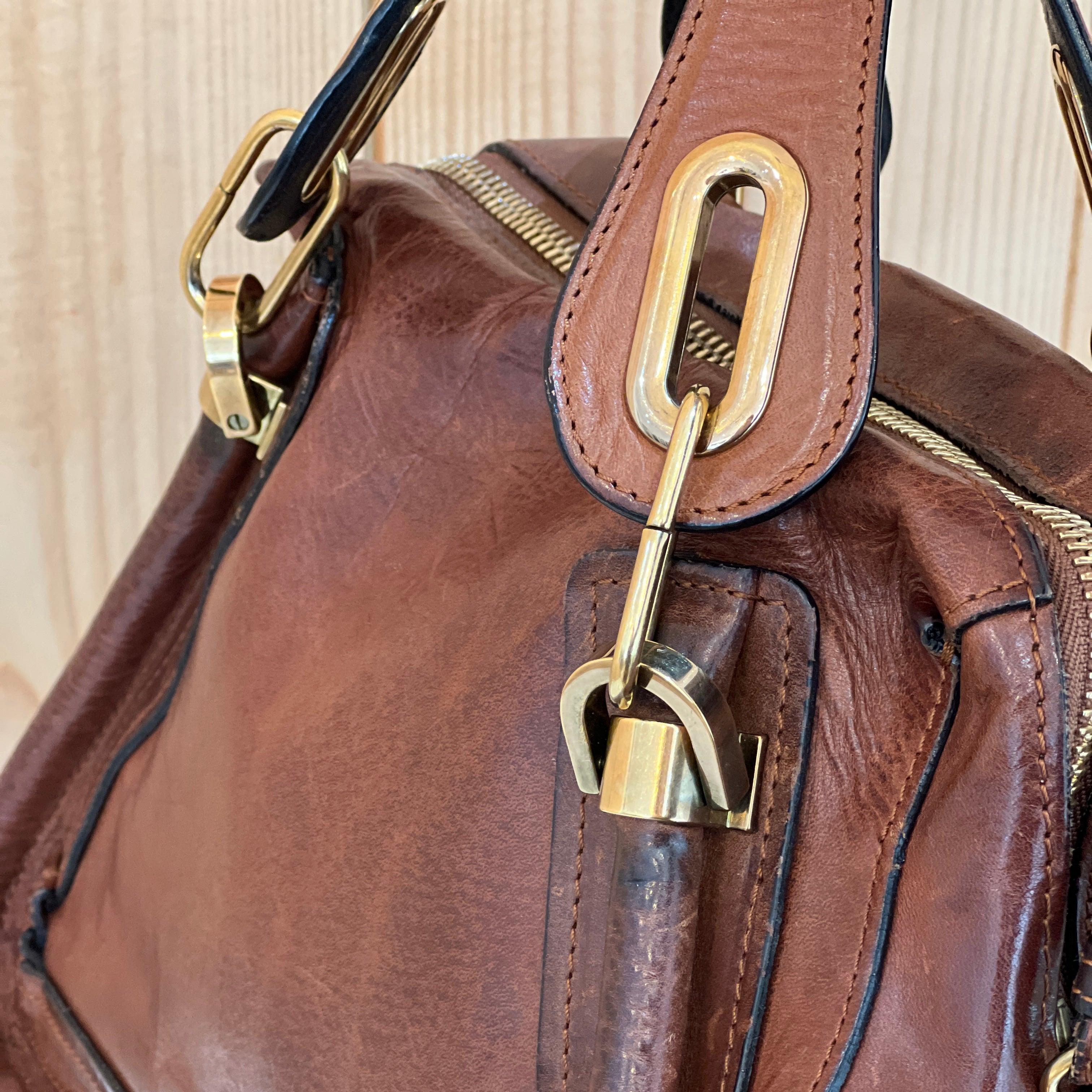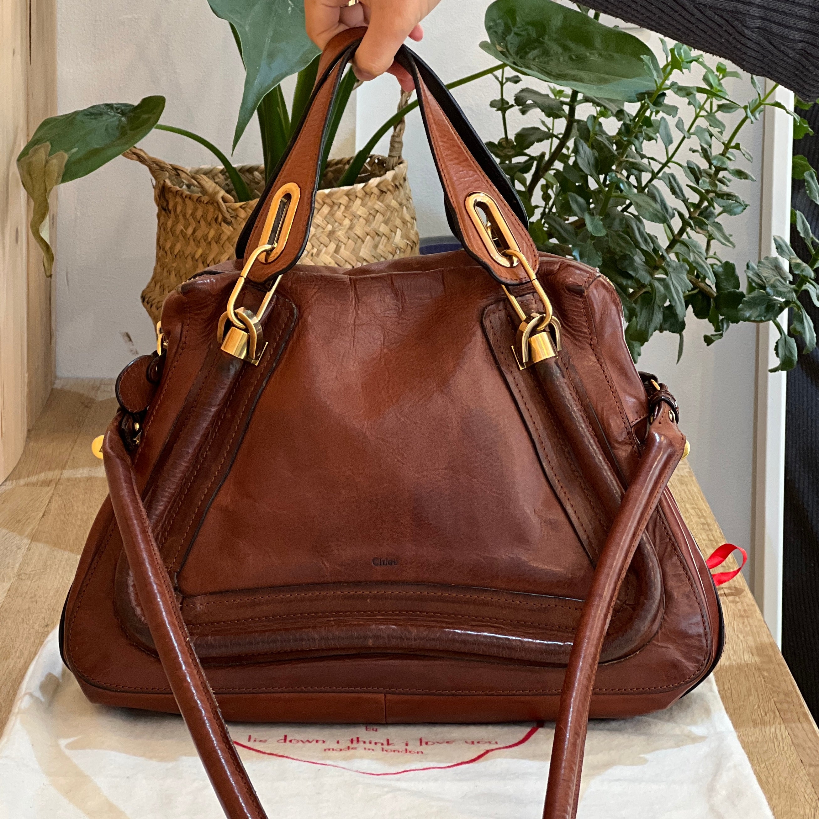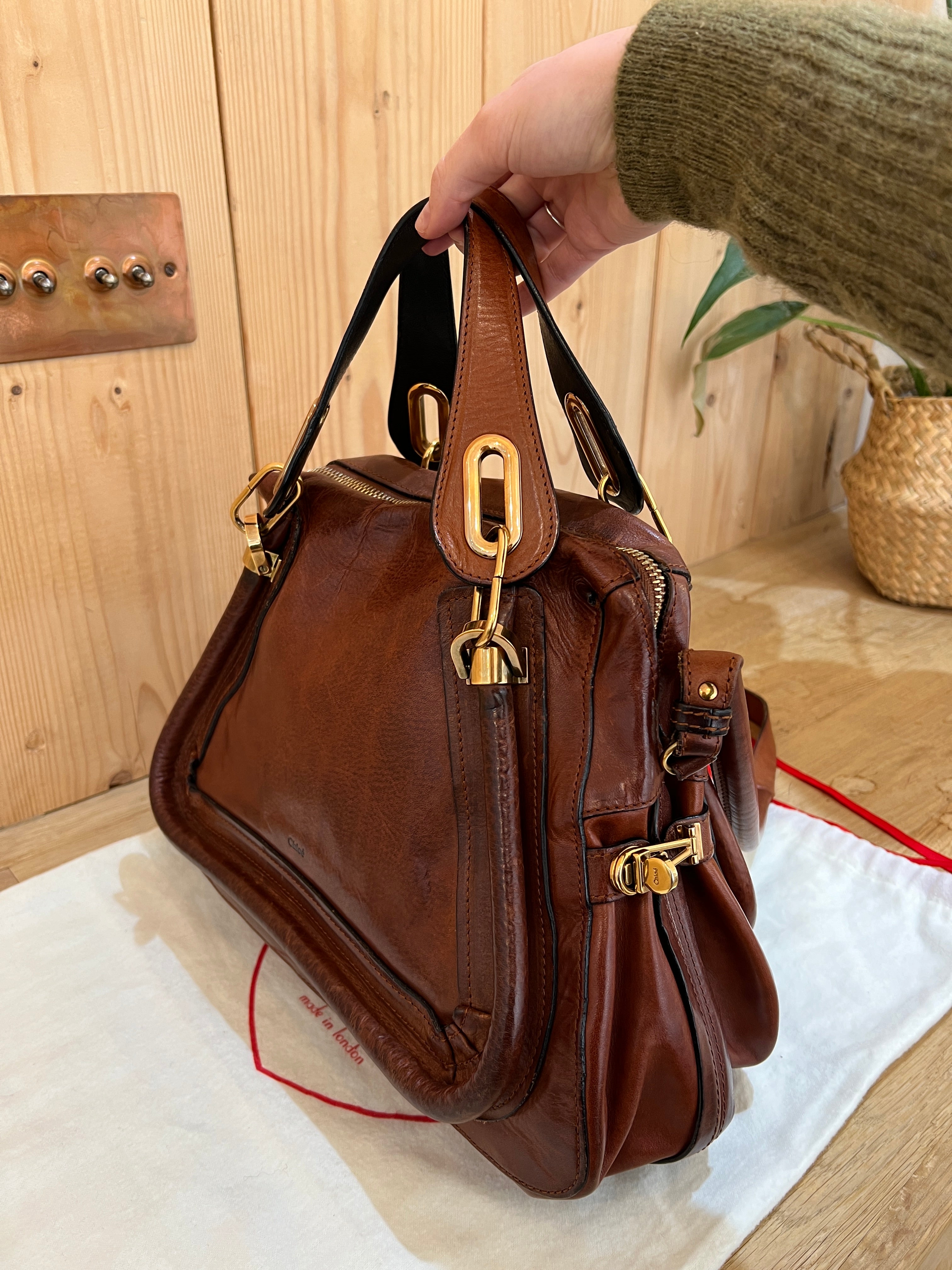 Description: This Chloé Paraty in size medium has double top handles and 1 shoulder strap. It has adjustable side gussets. It has a zip top fasten. Inside it has 1 zipped pocket and 1 flat pocket.