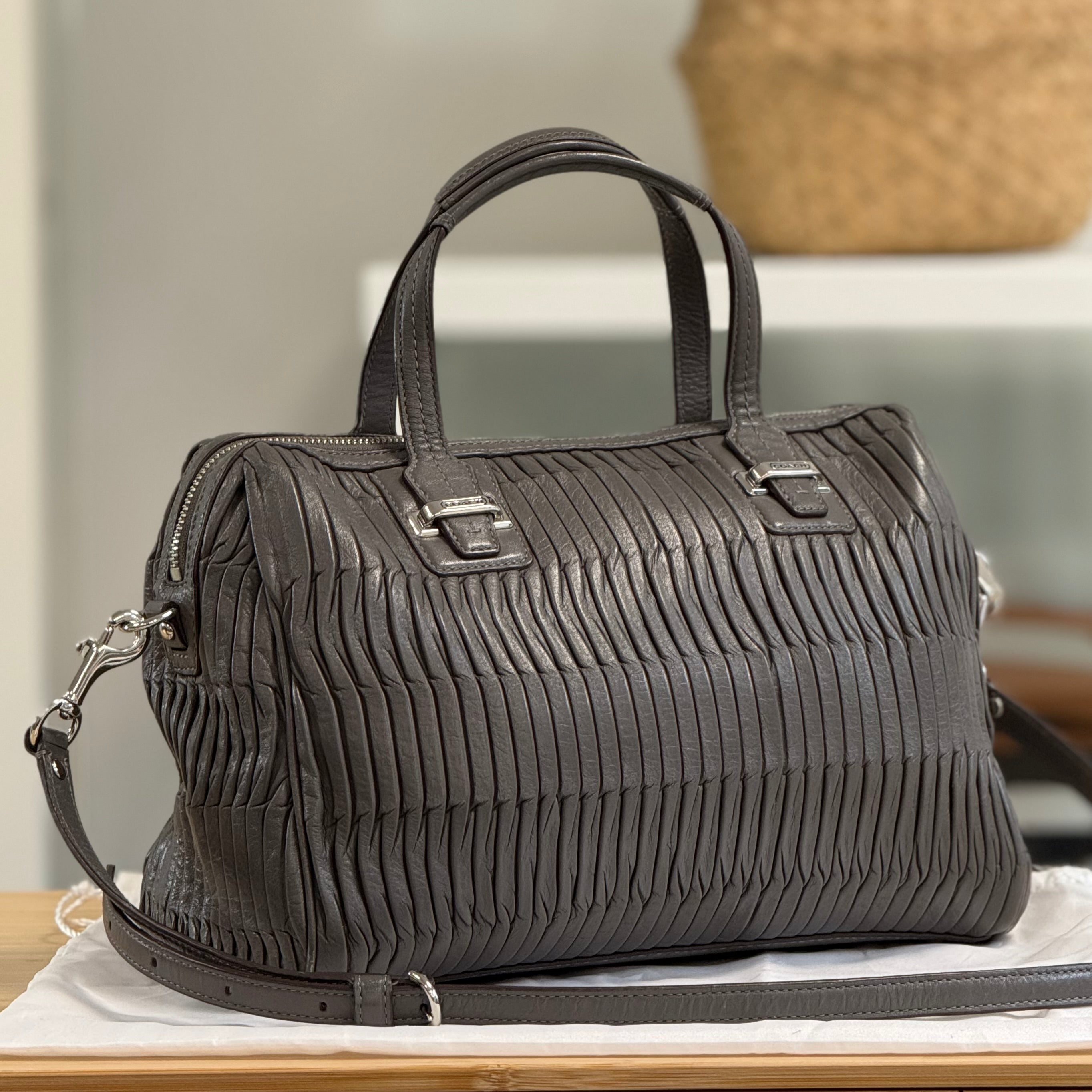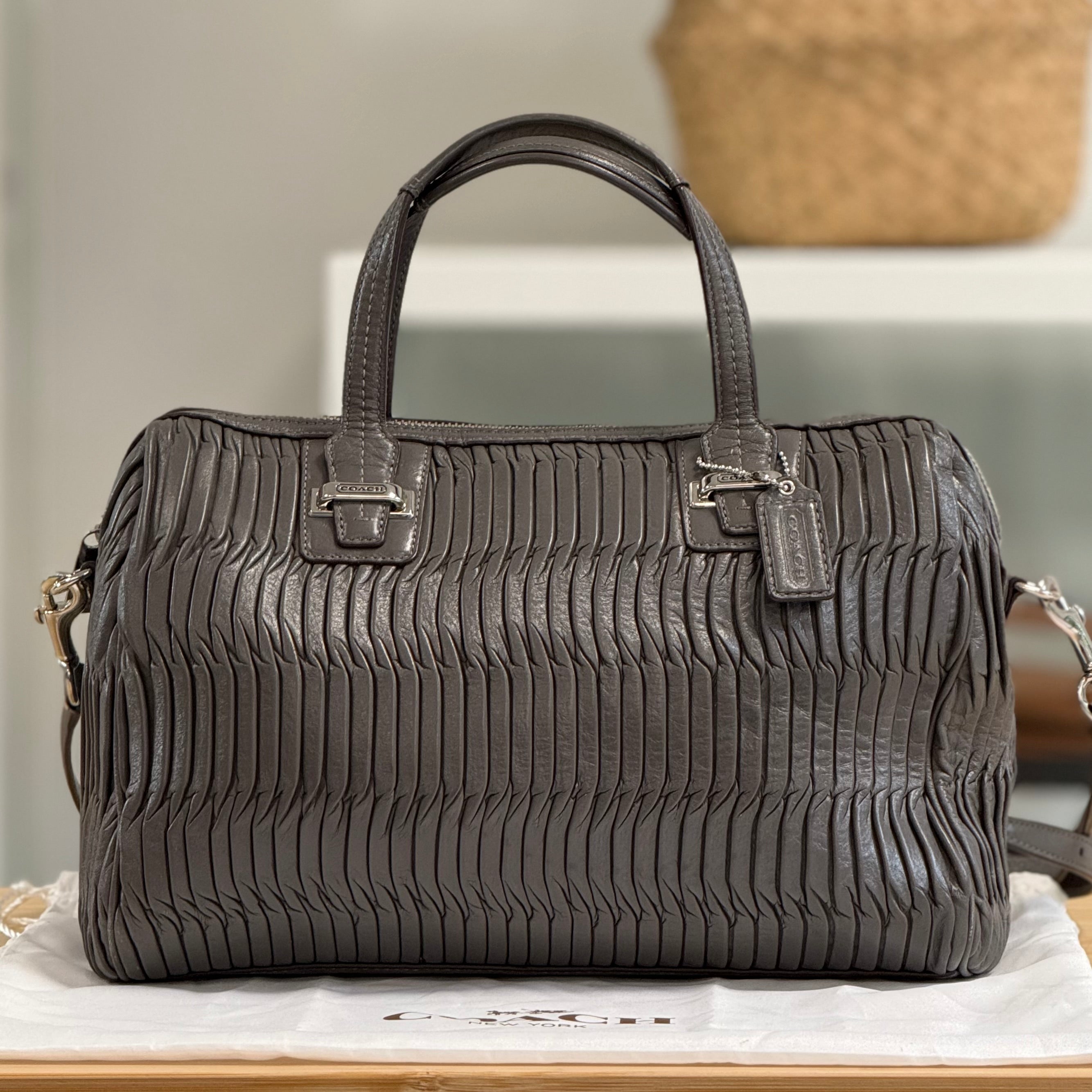 Description: This Coach Madison Gathered Tote has double top handles, and an adjustable, removable strap. It has 4 base studs. Inside there is one main compartment, one zipped pocket, and two flat pockets.