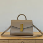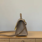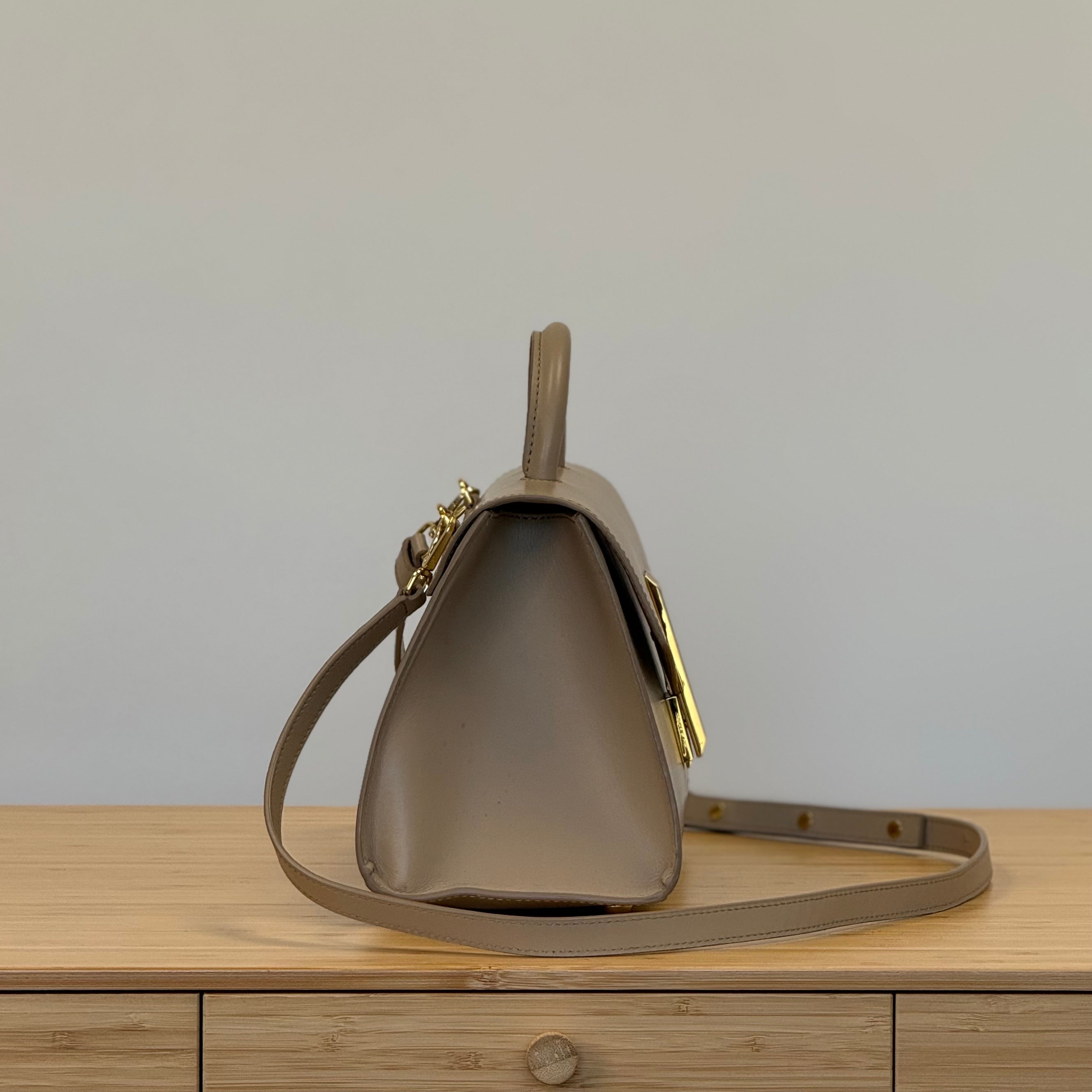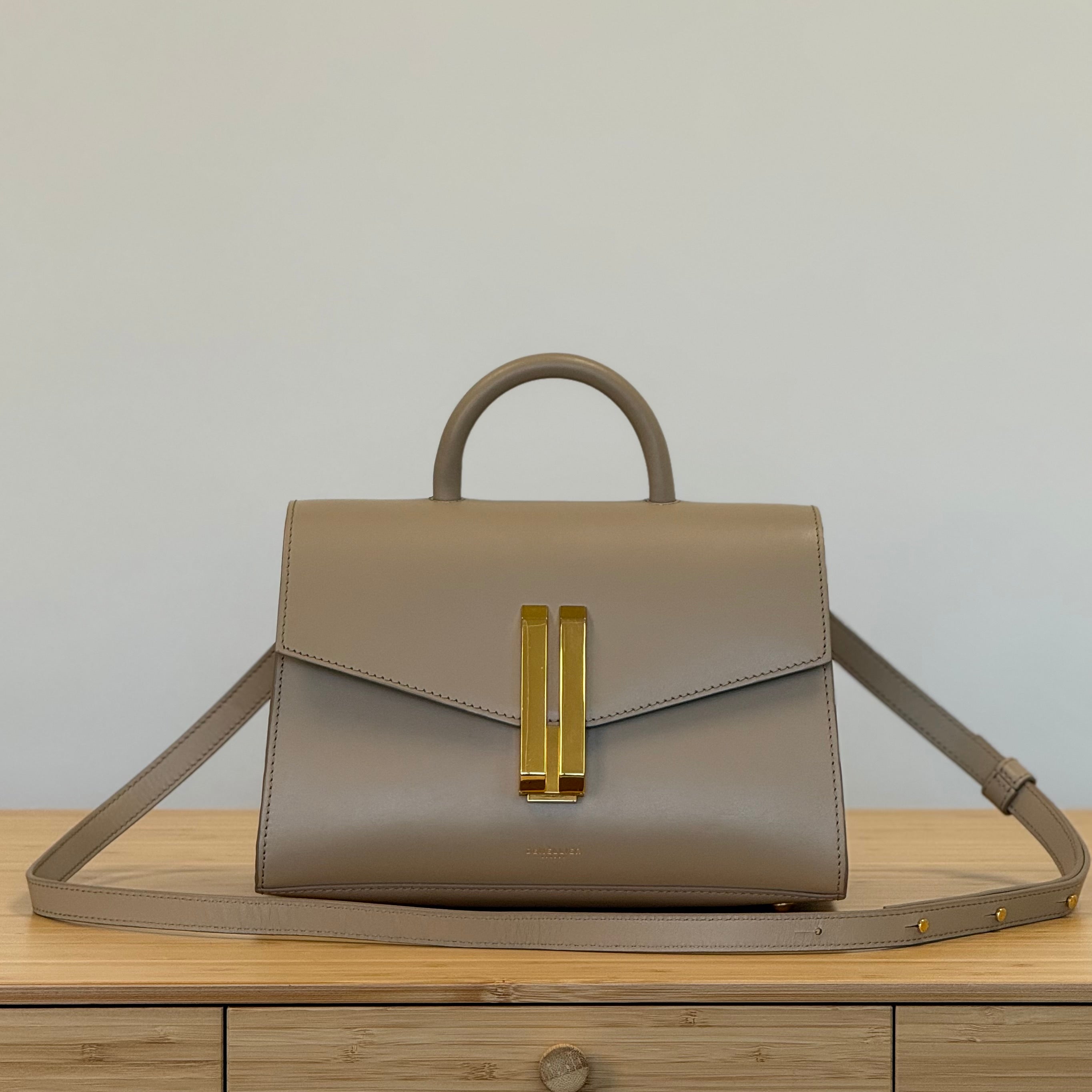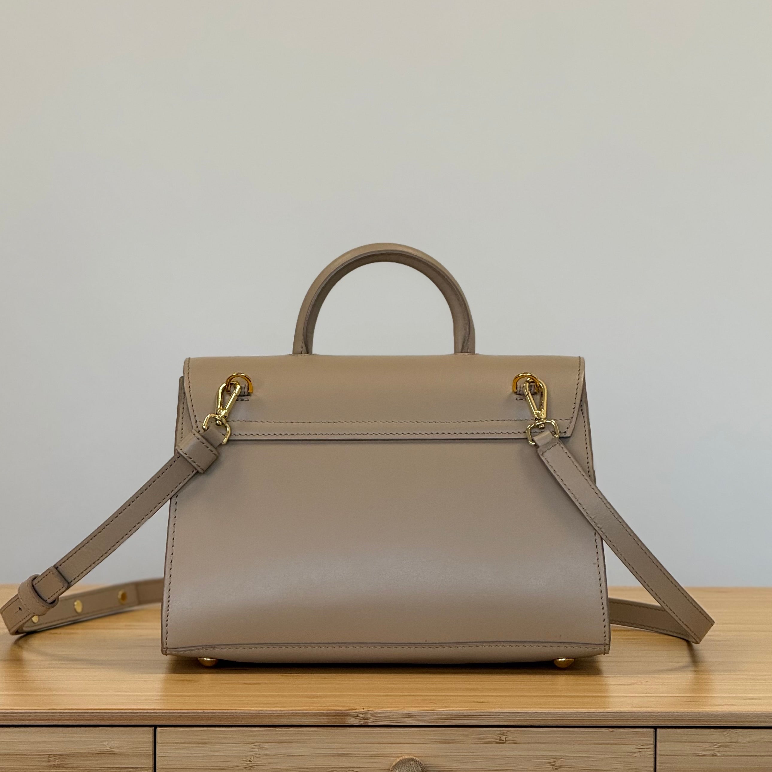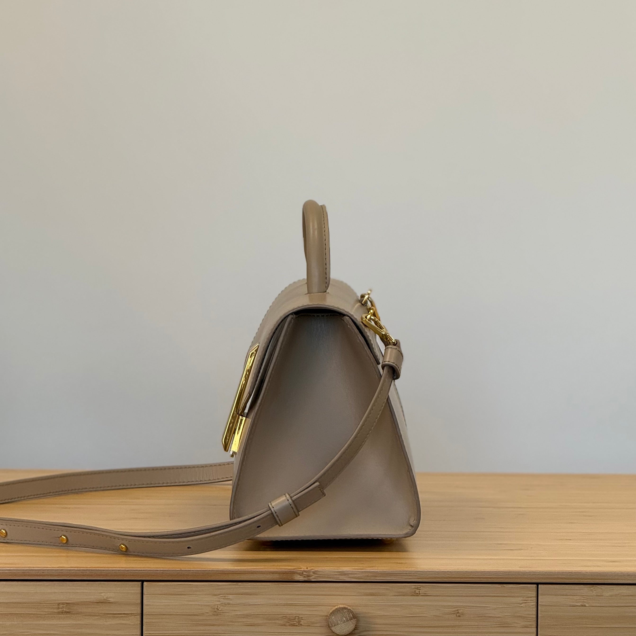 Description: This Demellier Montreal Top Handle Midi has a top handle and a removable & adjustable strap. It has 4 base studs. It has a flap closure with push lock closure fasten. Inside it has the main compartment with one zipped pocket.
