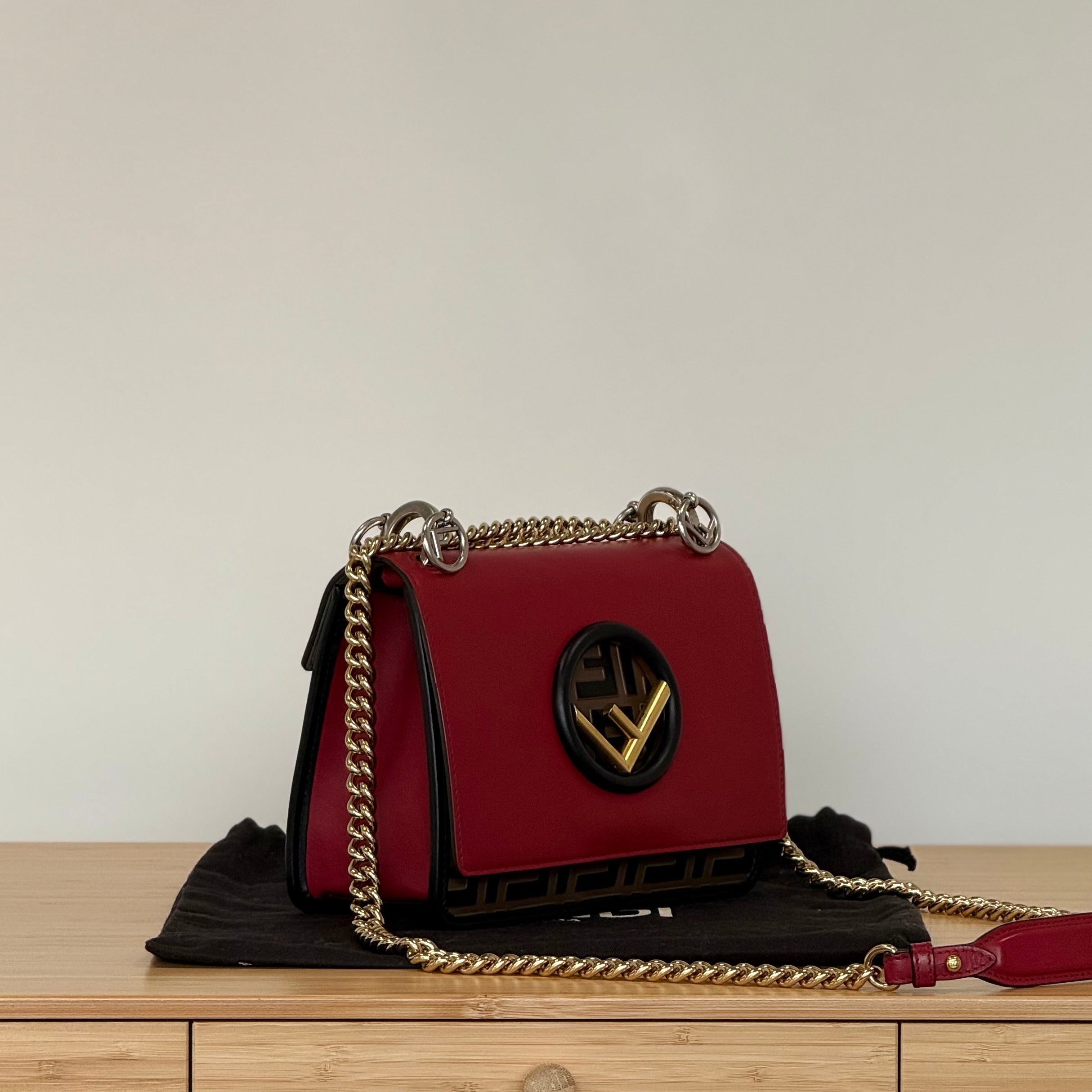 Colour: Bag-red/Fendi zucca (brown). Hardware-gold/silver