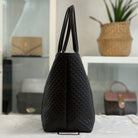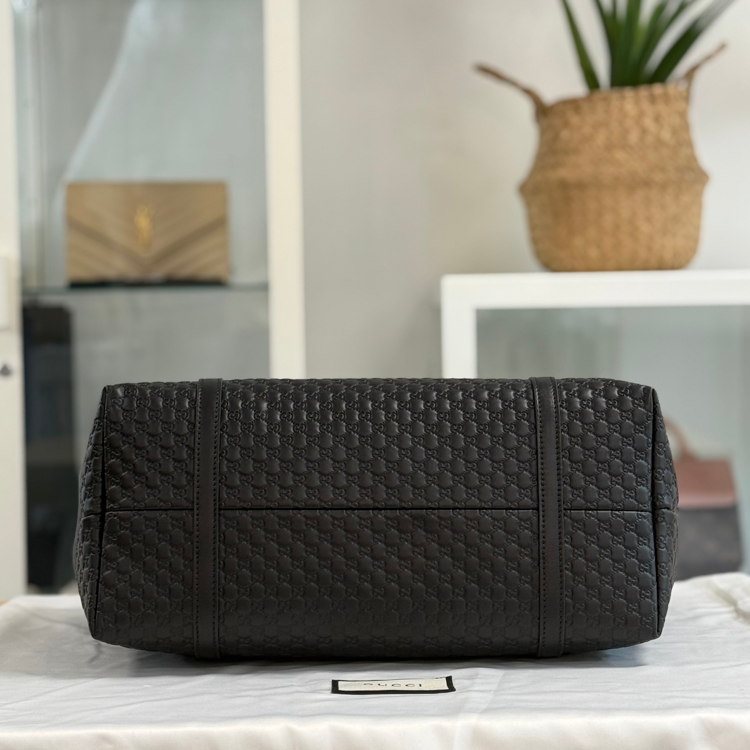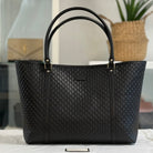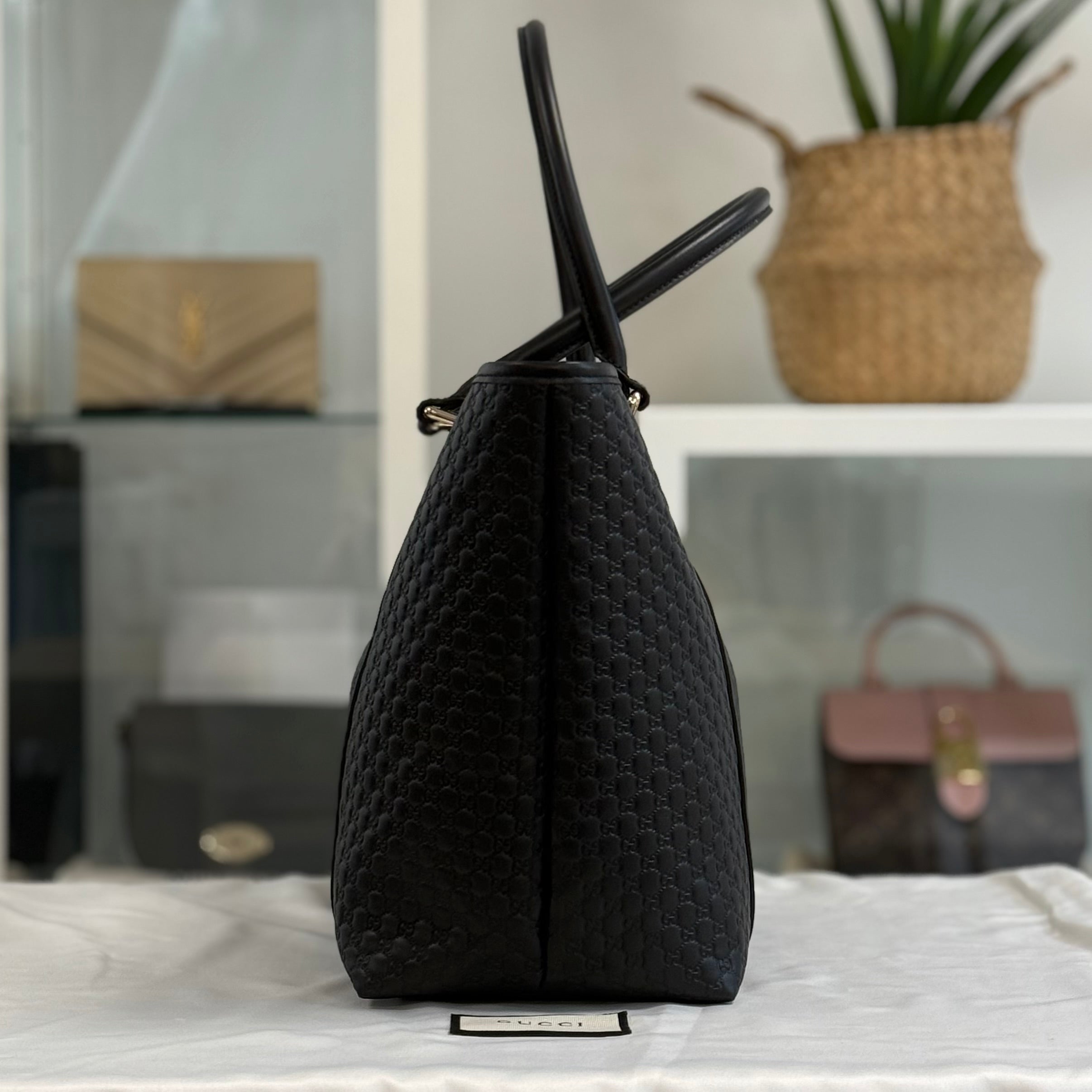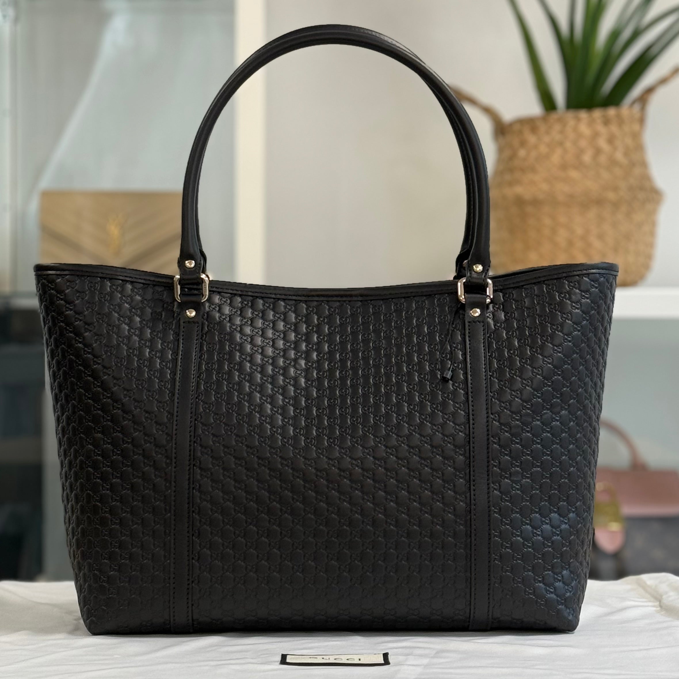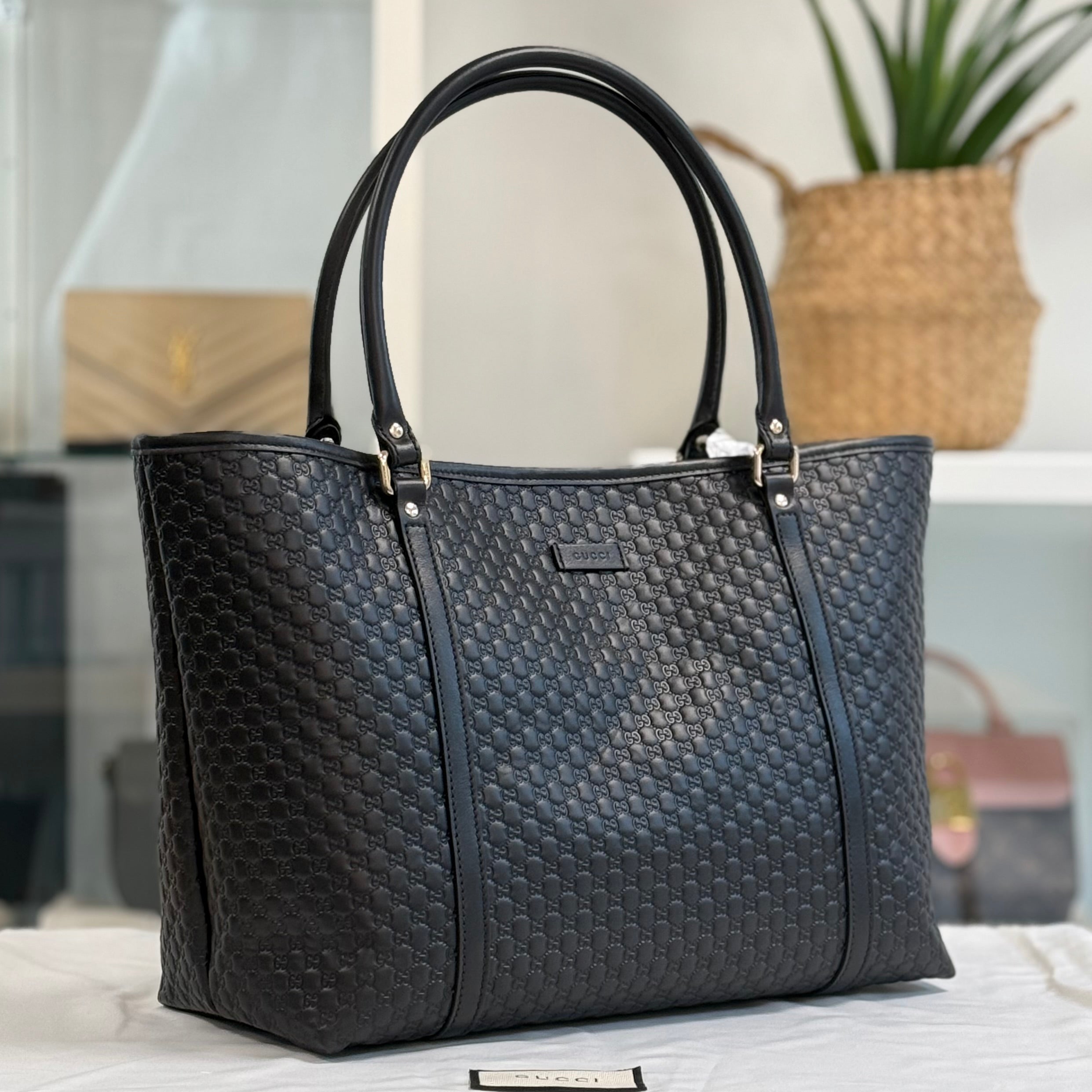 Description: This Gucci Guccissima Tote has double top handles. It has a top closure with magnetic press stud fasten. Inside it has 1 zipped pocket and 2 flat pockets.