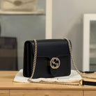 Description: This Gucci Interlocking G Chain Shoulder has a leather & chain strap. It has a flap closure with flip lock fasten. Inside it has 2 compartments.