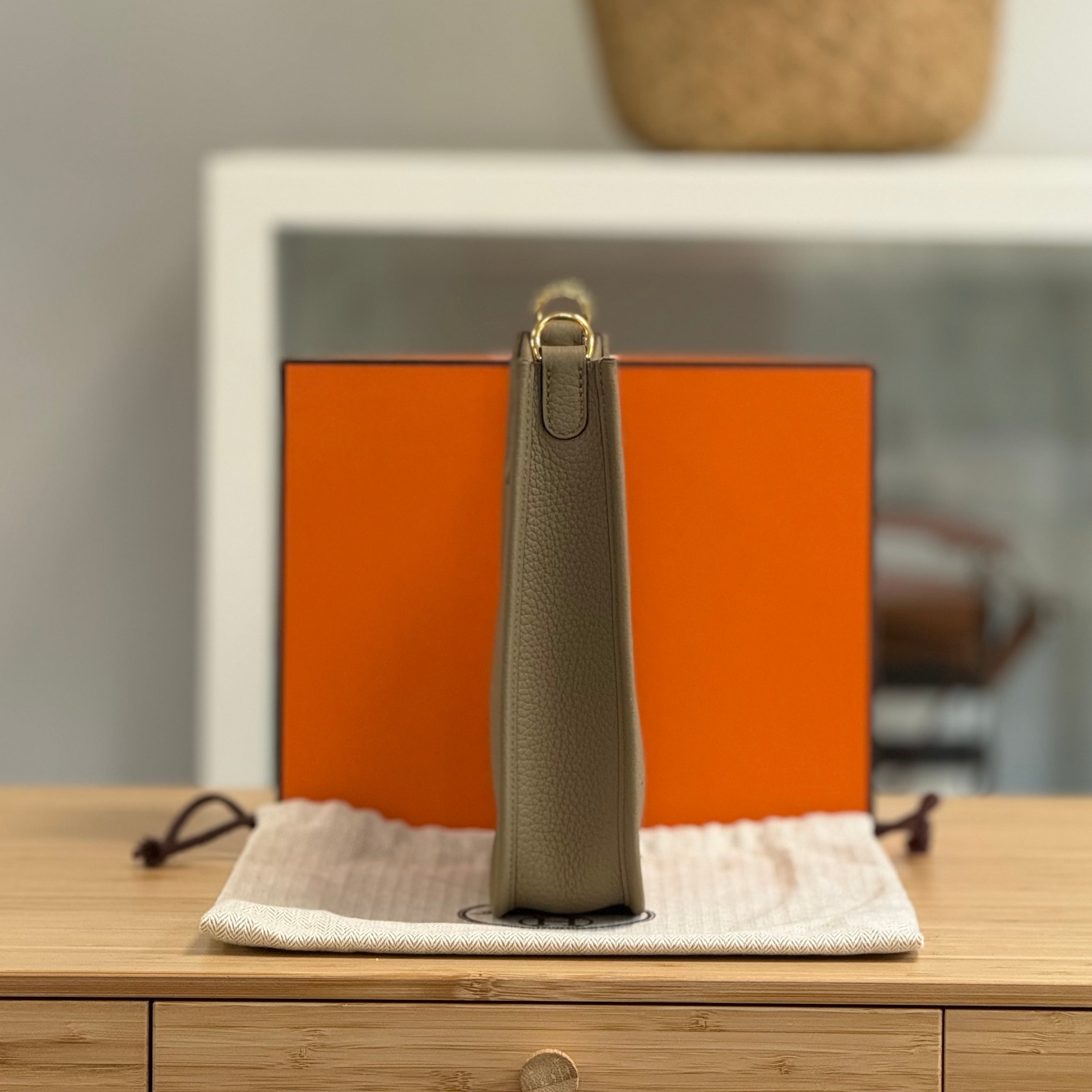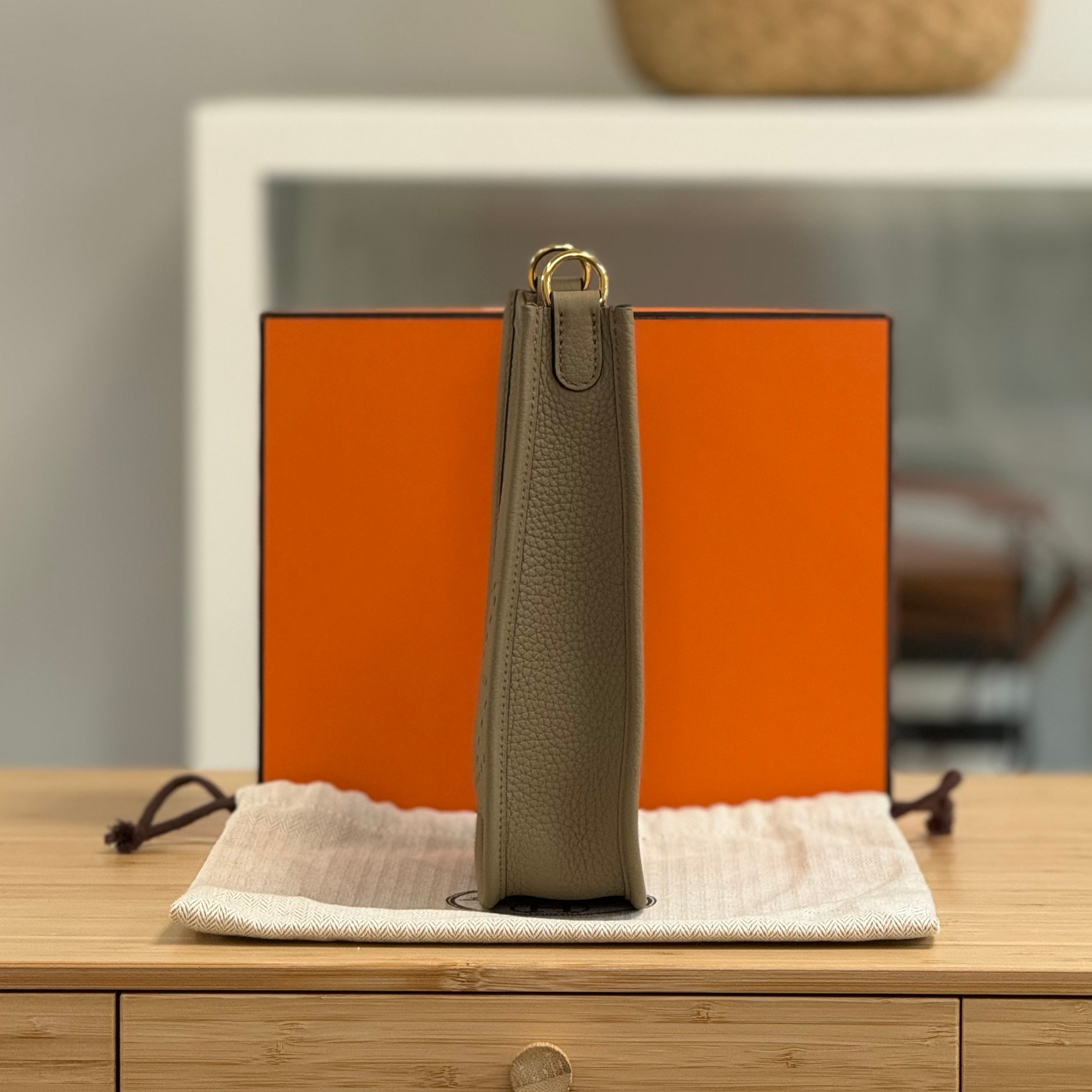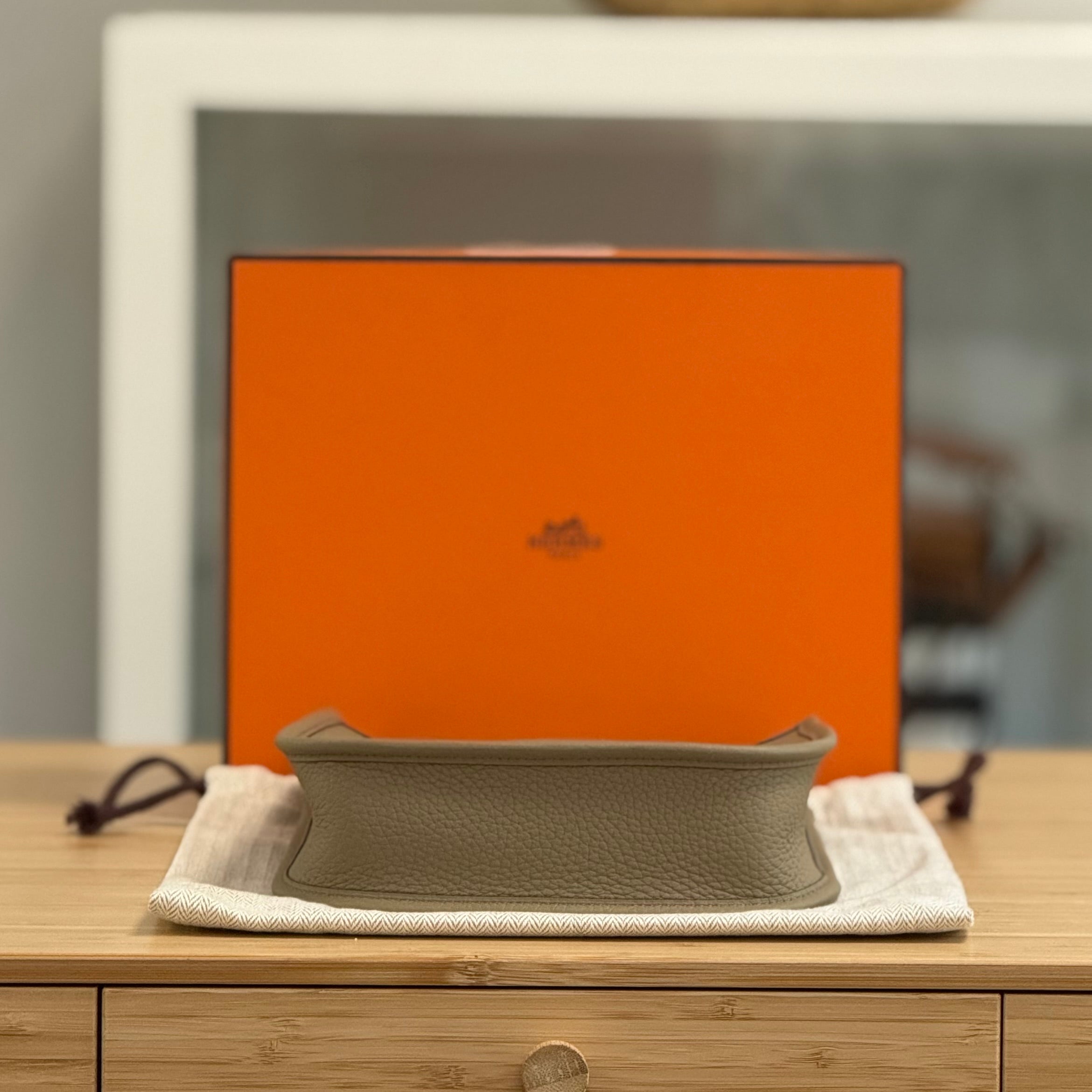 Description: This Hermès Evelyne TPM has a removable strap and a press-stud belt fasten. The blind stamp is ‘W’ with no surrounding shape, so it is from 2024.