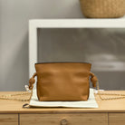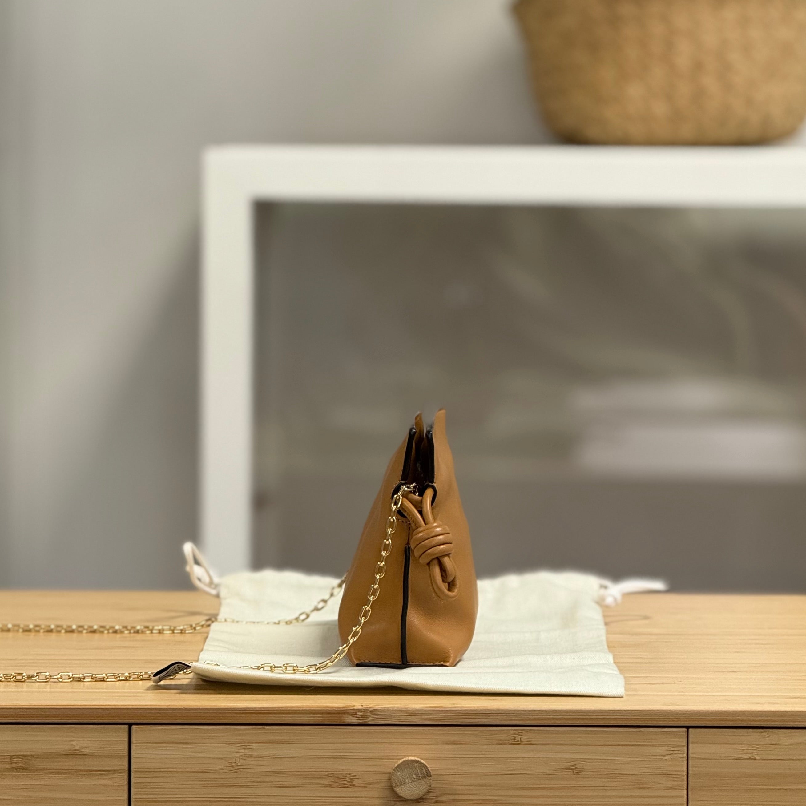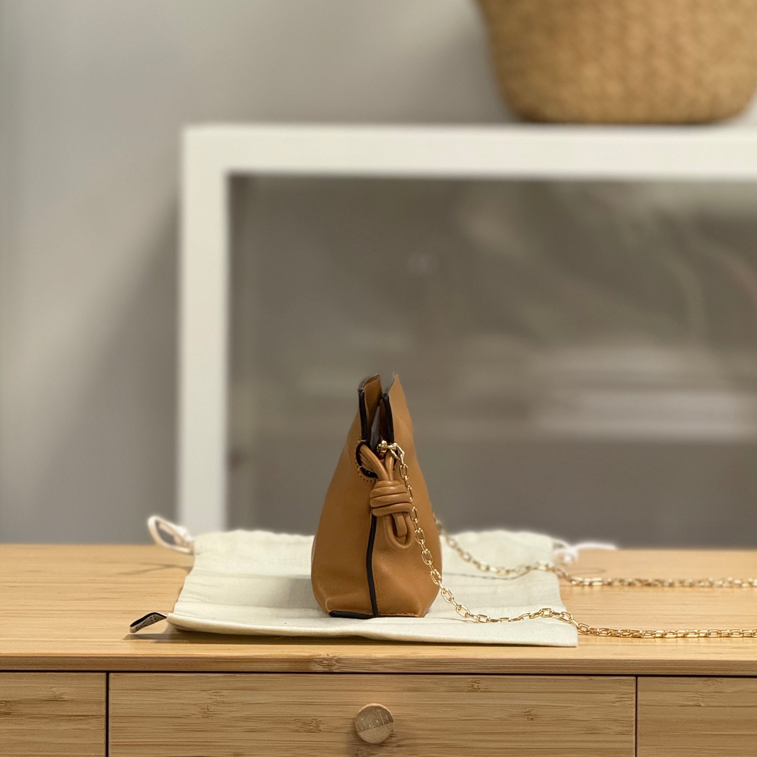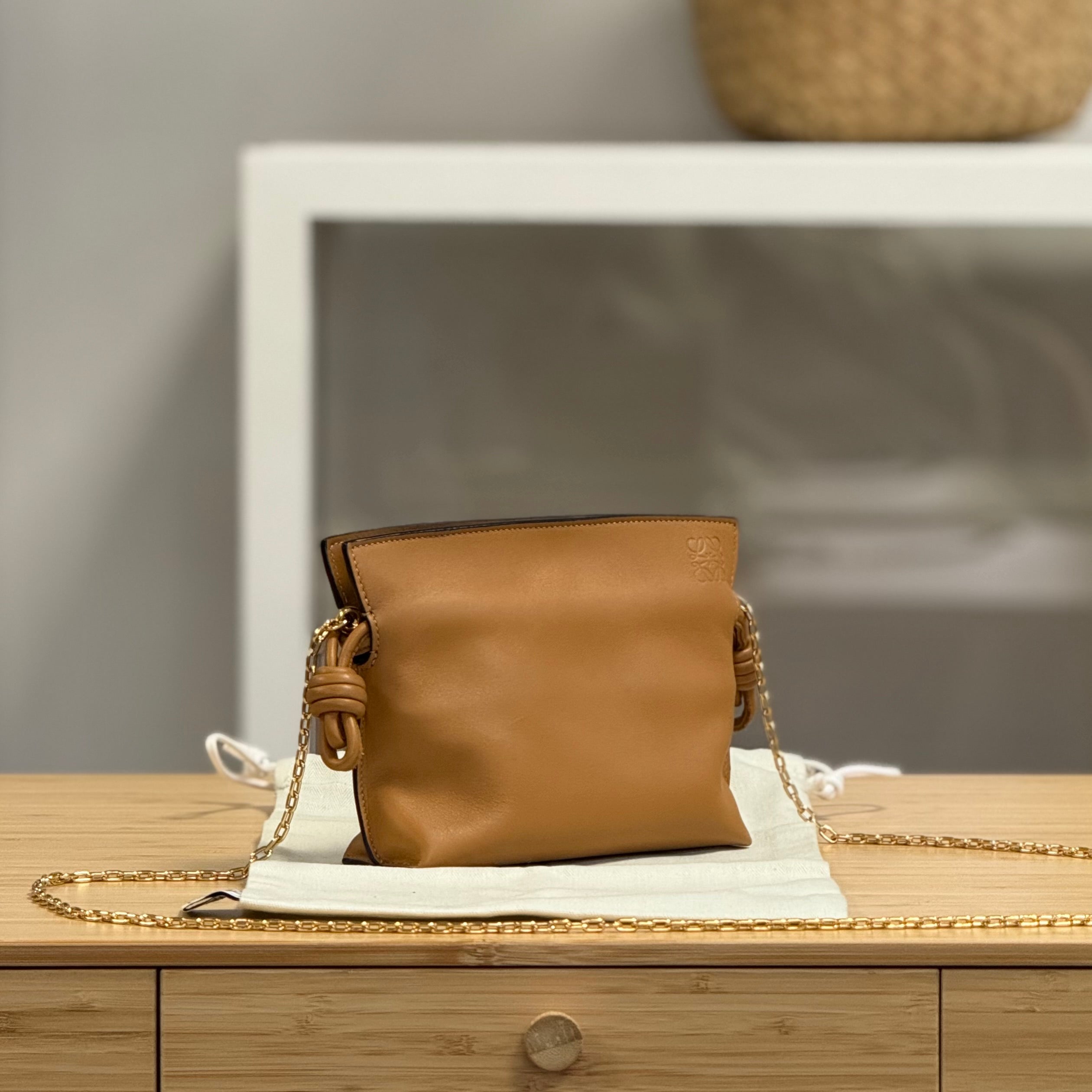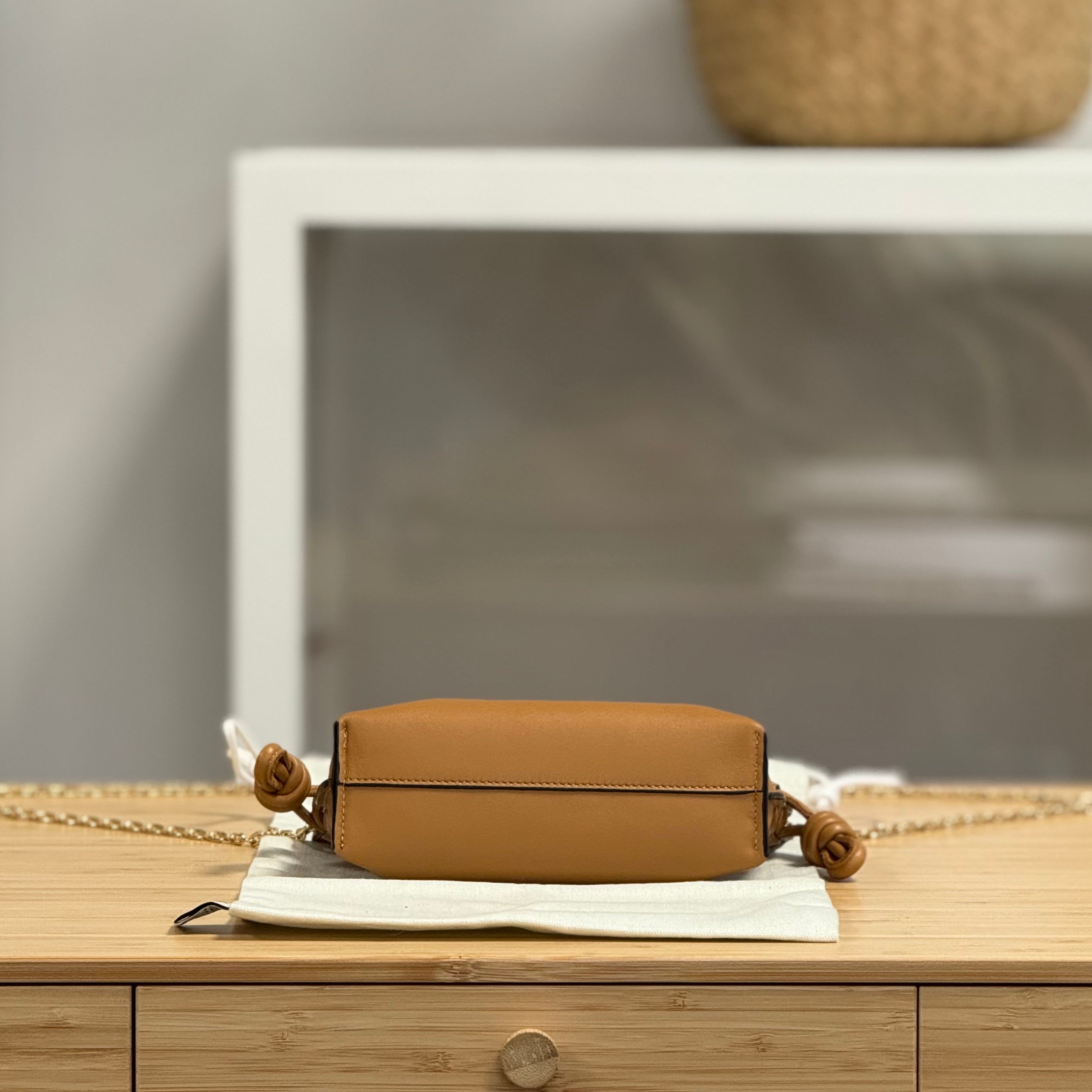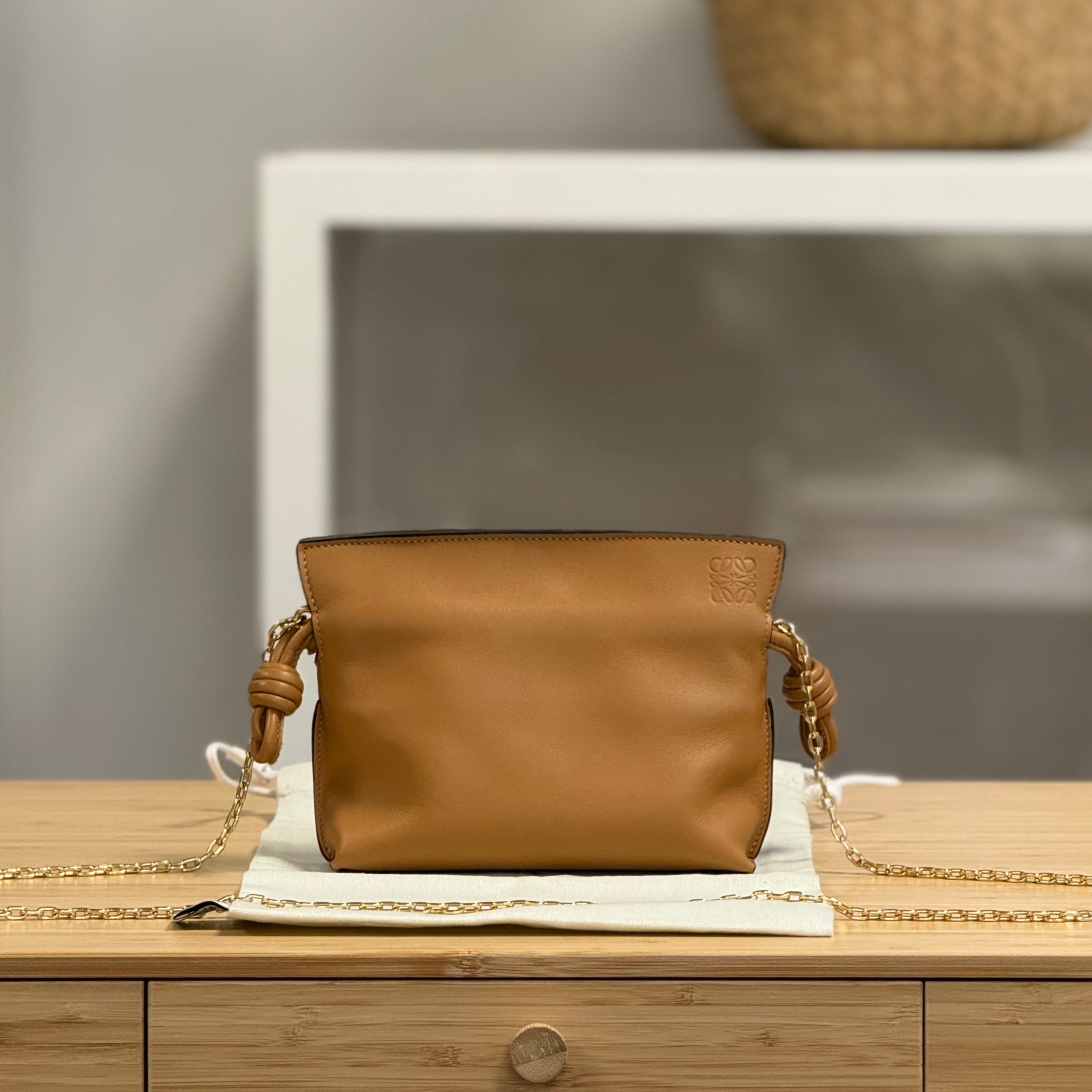 Description: This Loewe Nano Flamenco has a removable crossbody strap. It has drawstring knotted ties on each side of the bag. It has a magnetic closure and one main compartment inside.