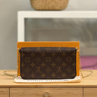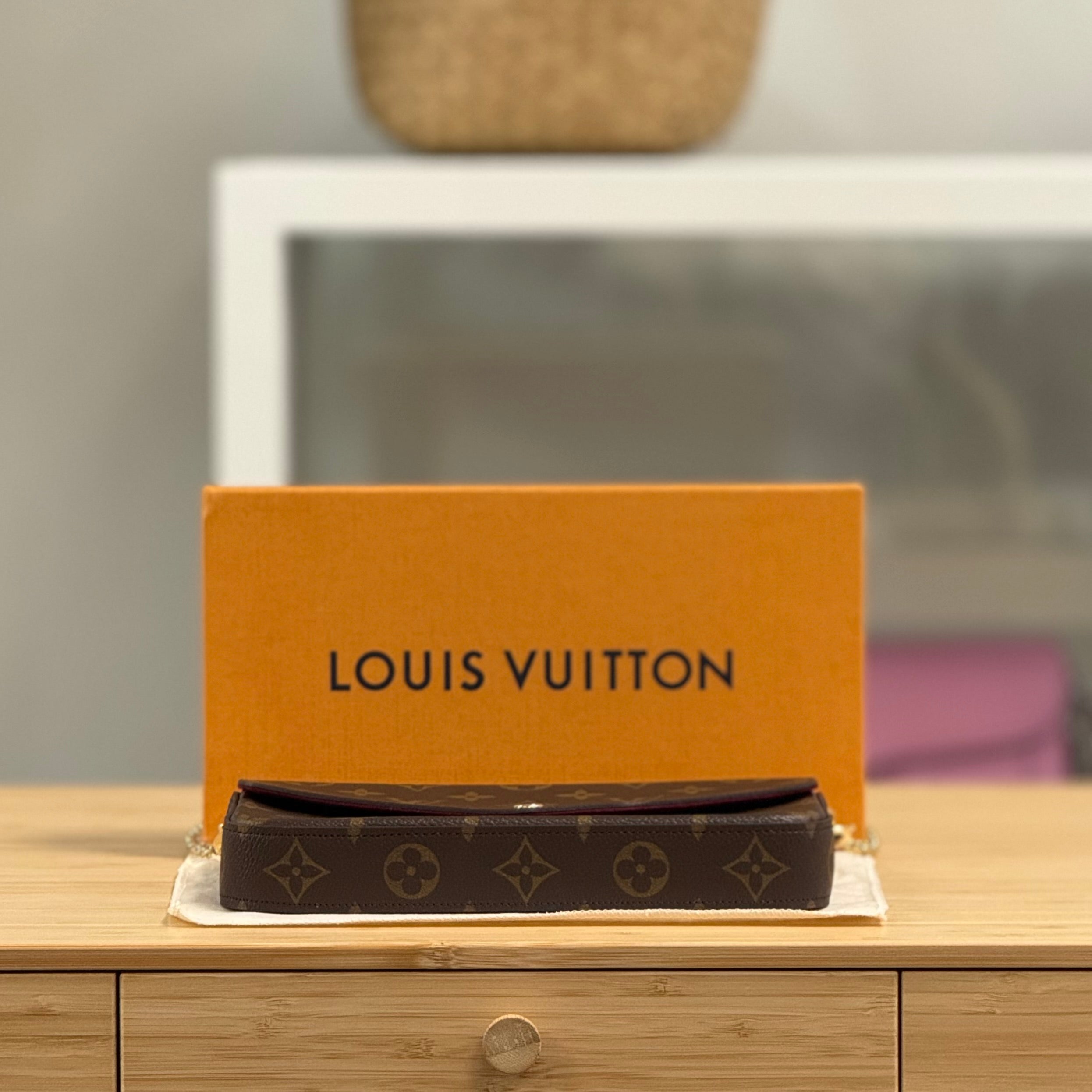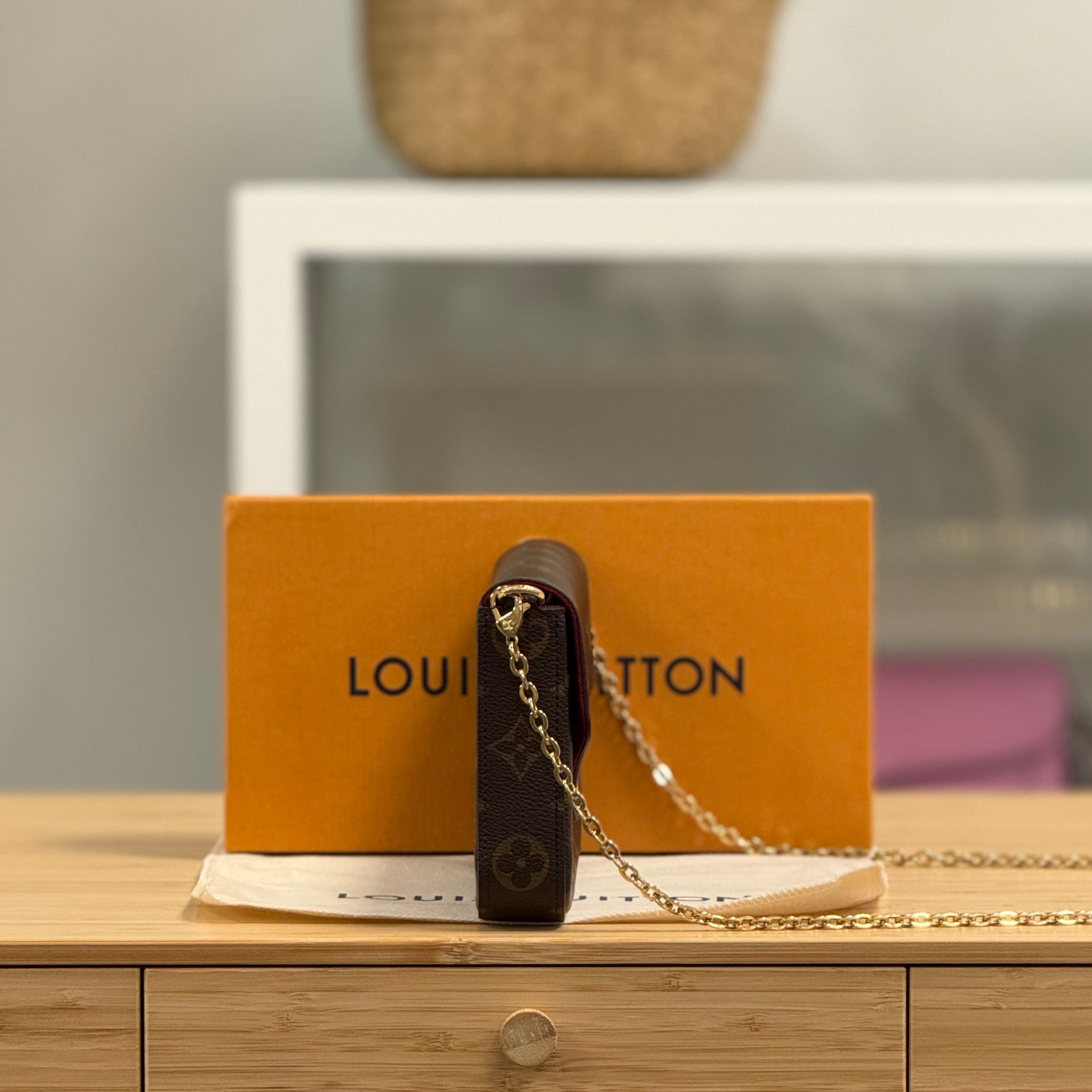 Description: This Louis Vuitton Felicie Pochette has a removable chain strap. The Felicie has a flap closure with a press stud fasten. Inside there are two removable pockets: a zipped pocket and a flat pocket with eight card slots. The main compartment of the bag features one flat pocket.