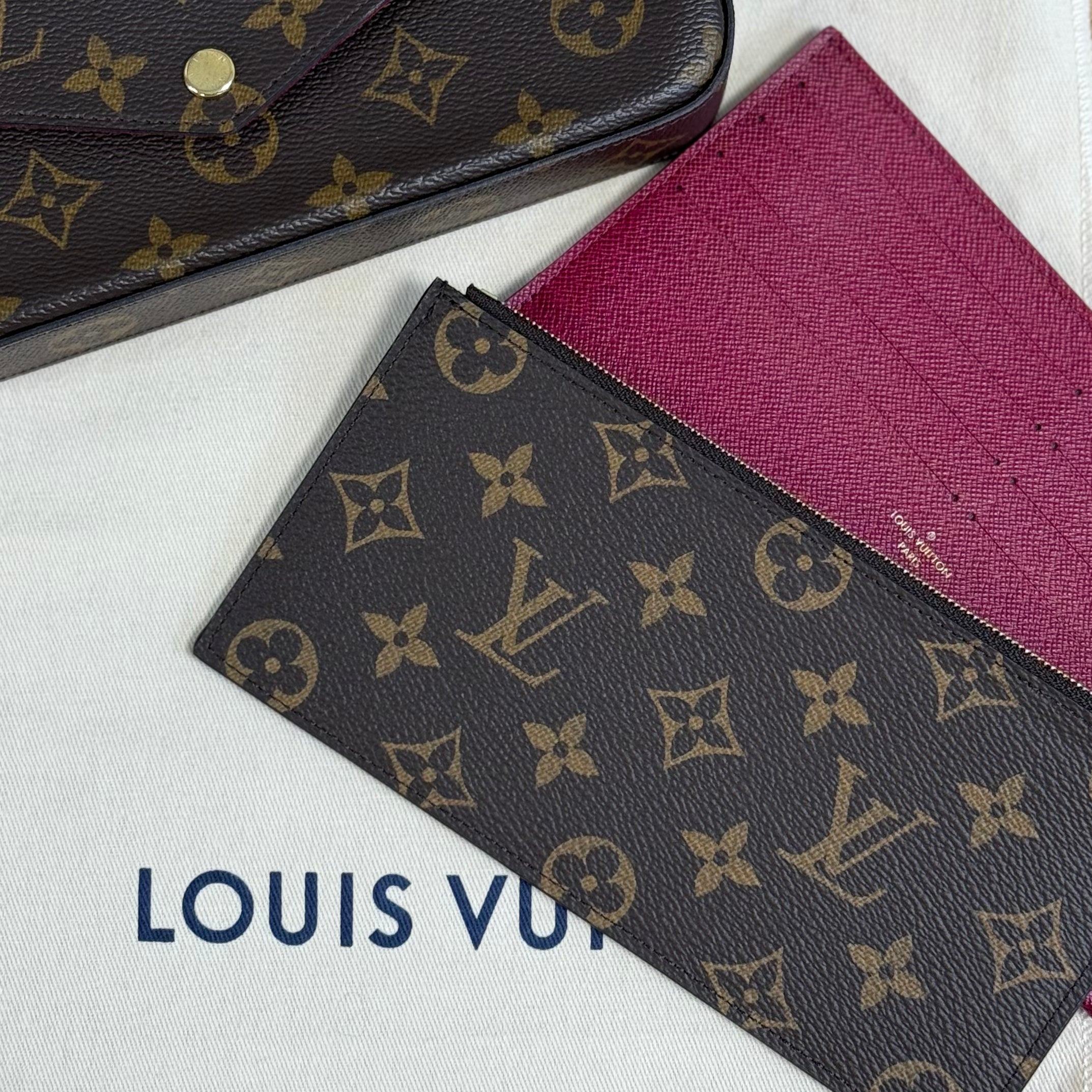 Included: LV box, LV ribbon, LV dust bag, LV envelope x2, LV compliments card, LV gift receipt, LV mini envelope, LV fabric card, two removable pockets: a zipped pocket and a flat pocket with eight card slots.