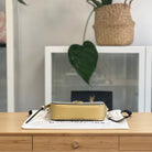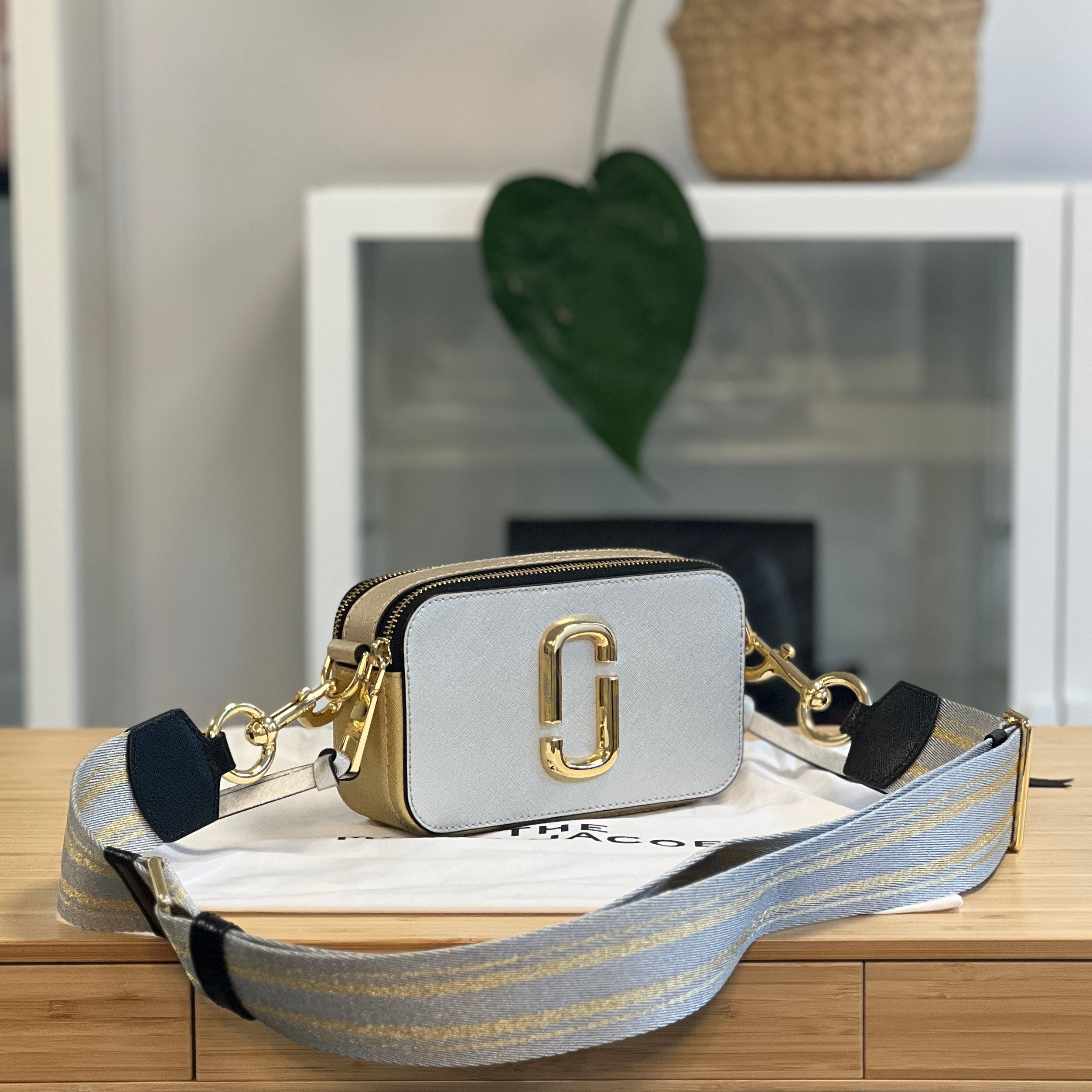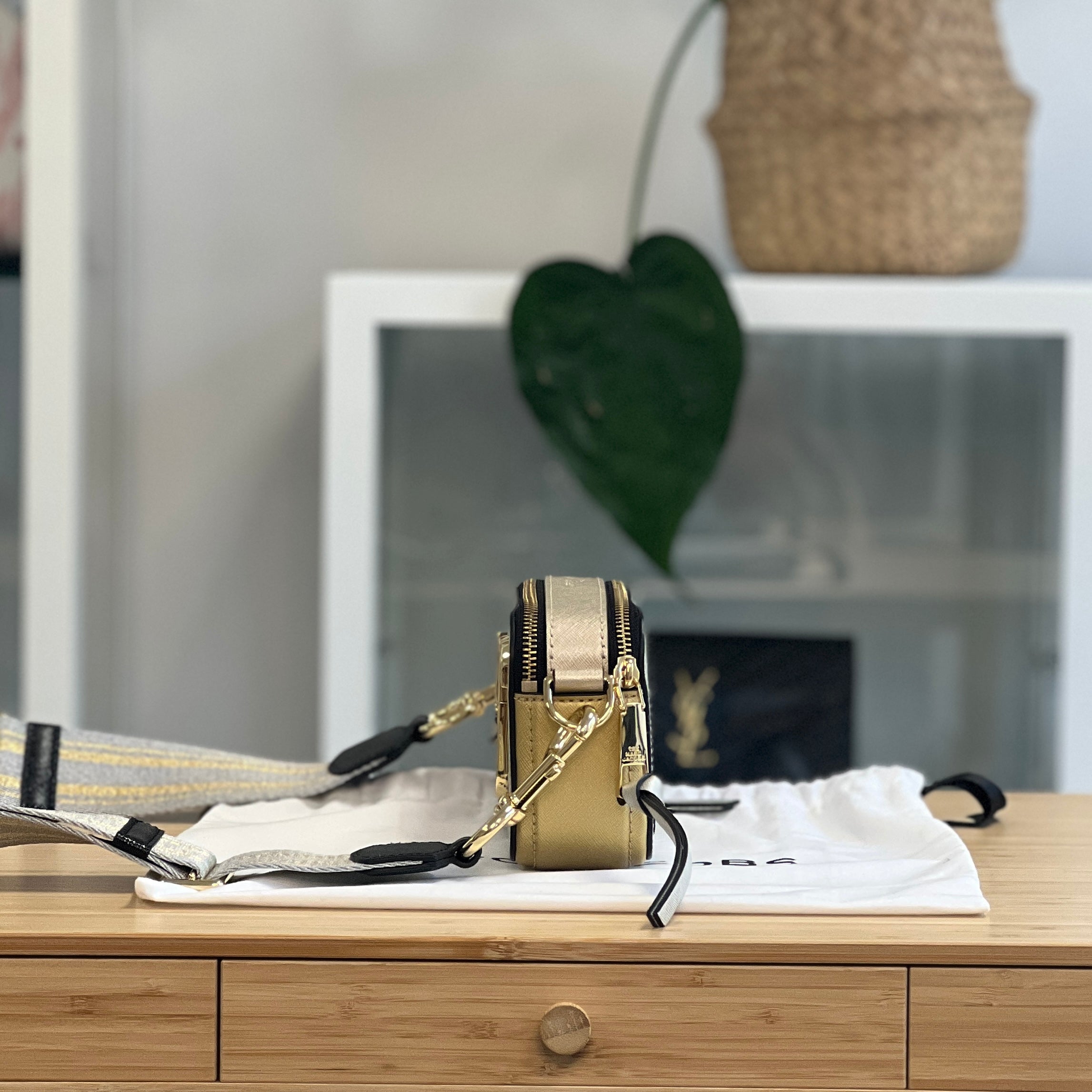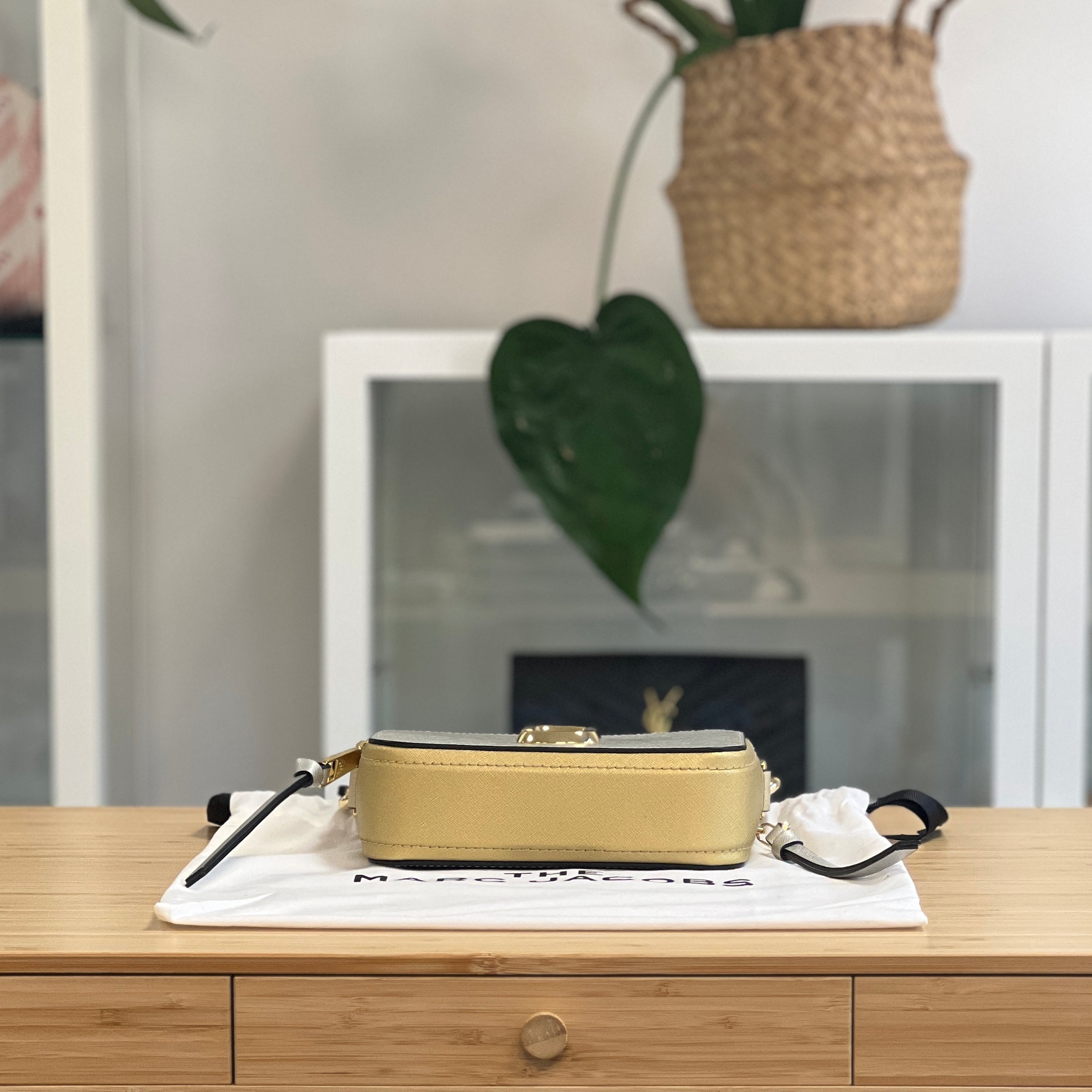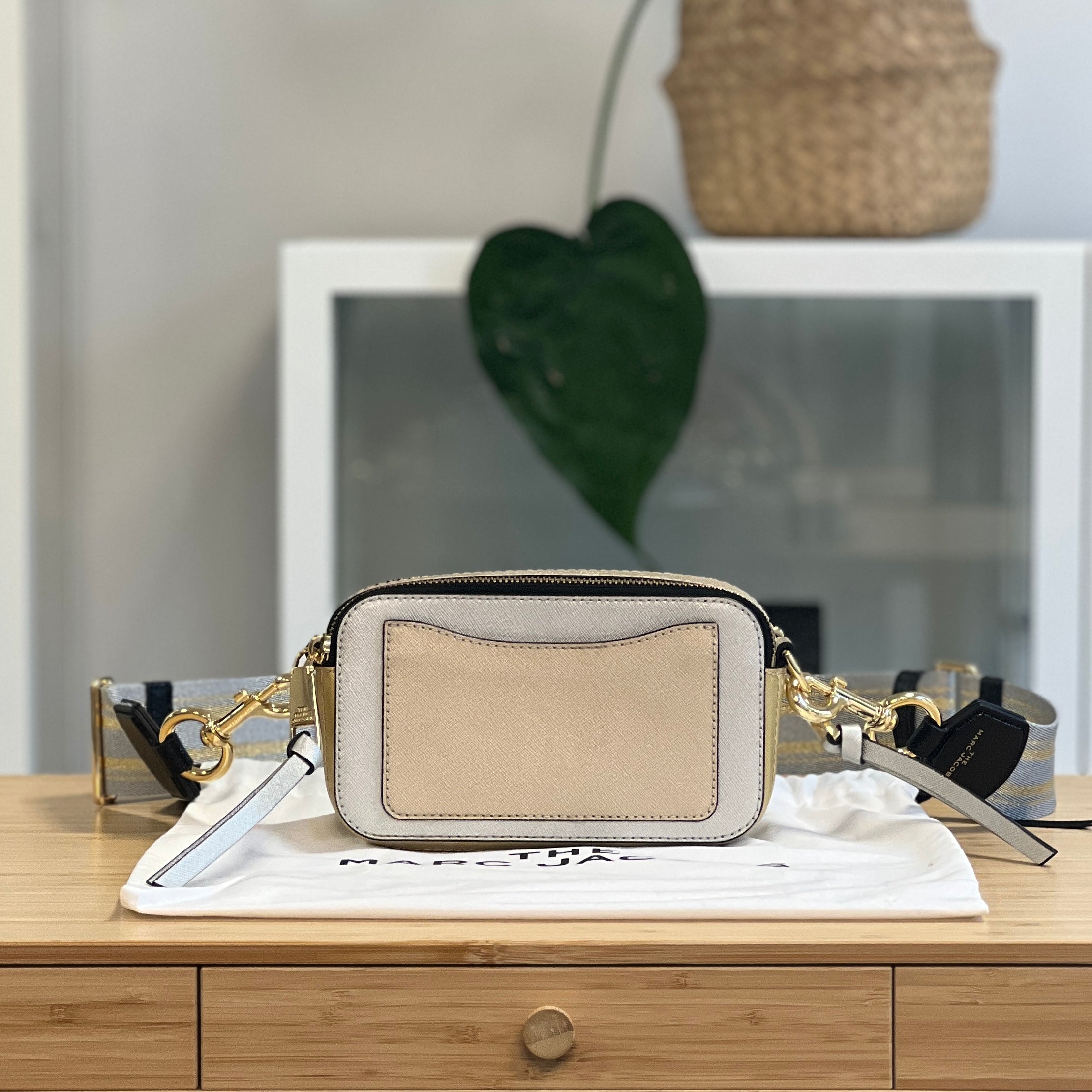 Description: This Marc Jacobs Snapshot has a removable & adjustable strap. It has an exterior flat pocket on the back. It has two compartments, and each has a zip-top closure. In the back compartment there is 1 zipped pocket.