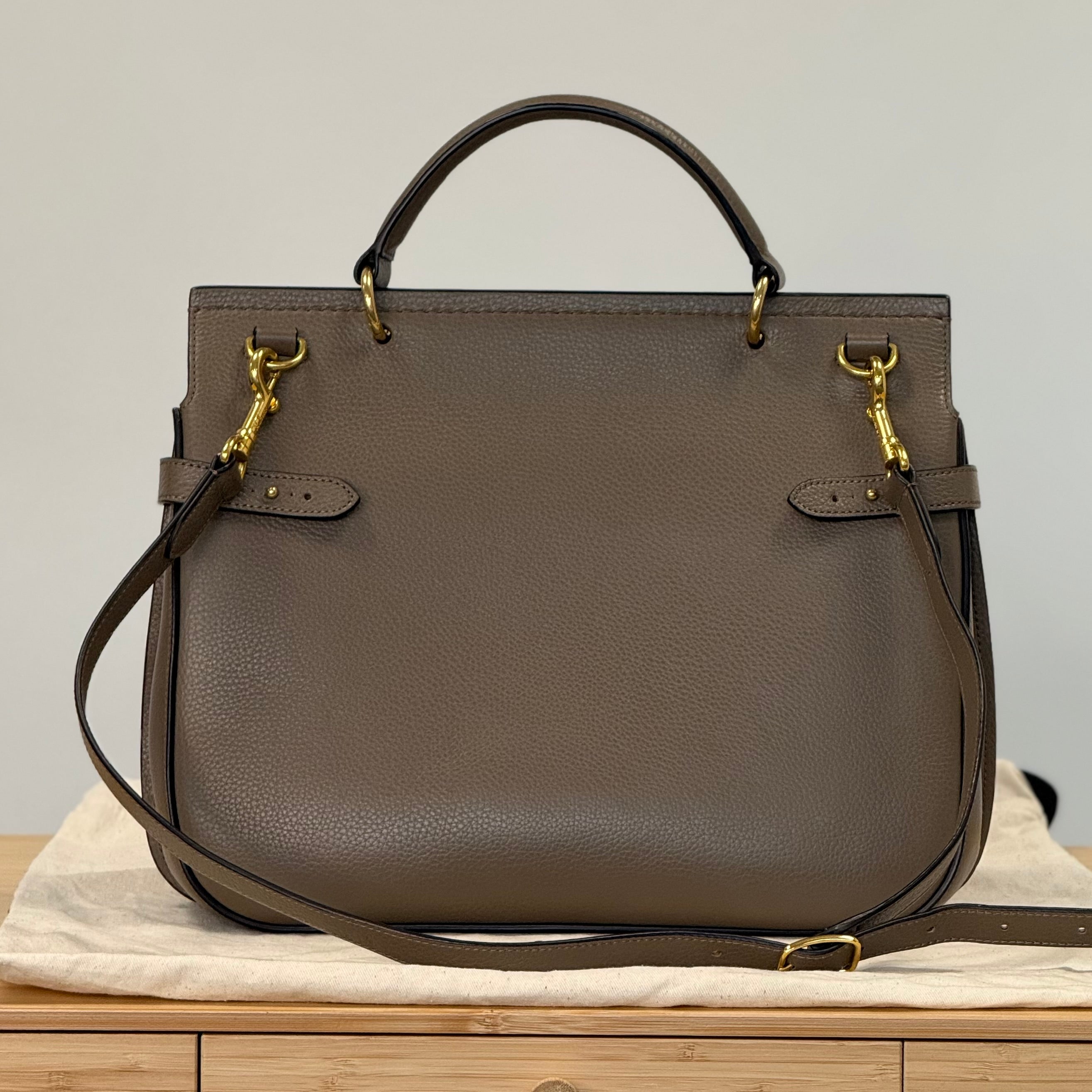 Description: This Mulberry Amberley in size large has an adjustable & removable strap and a top handle. It has a flap closure with Mulberry Rider’s lock. Inside there is 1 zipped pocket and 1 flat pocket.