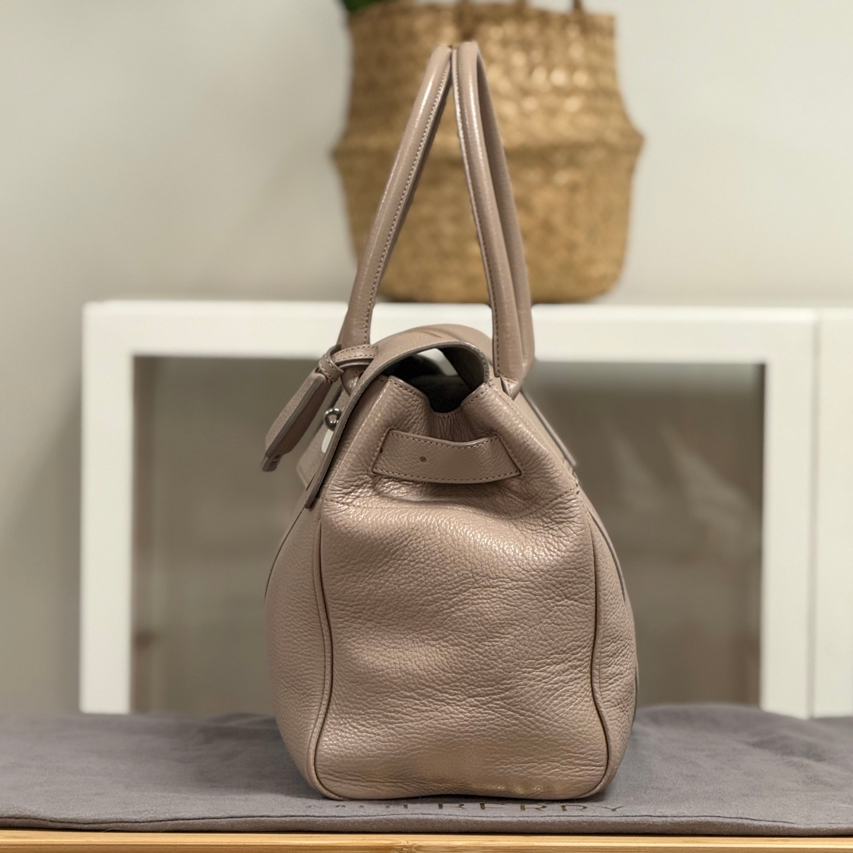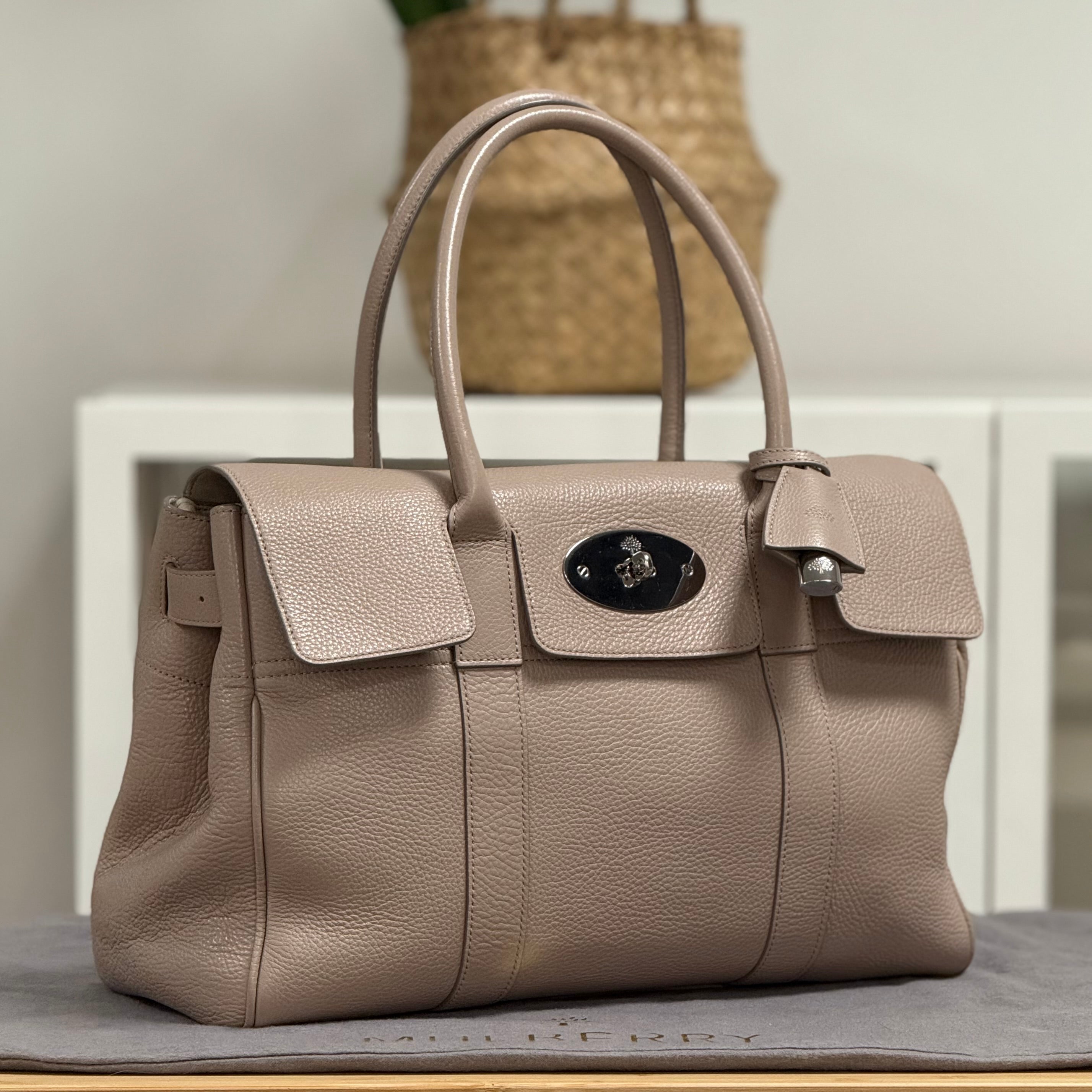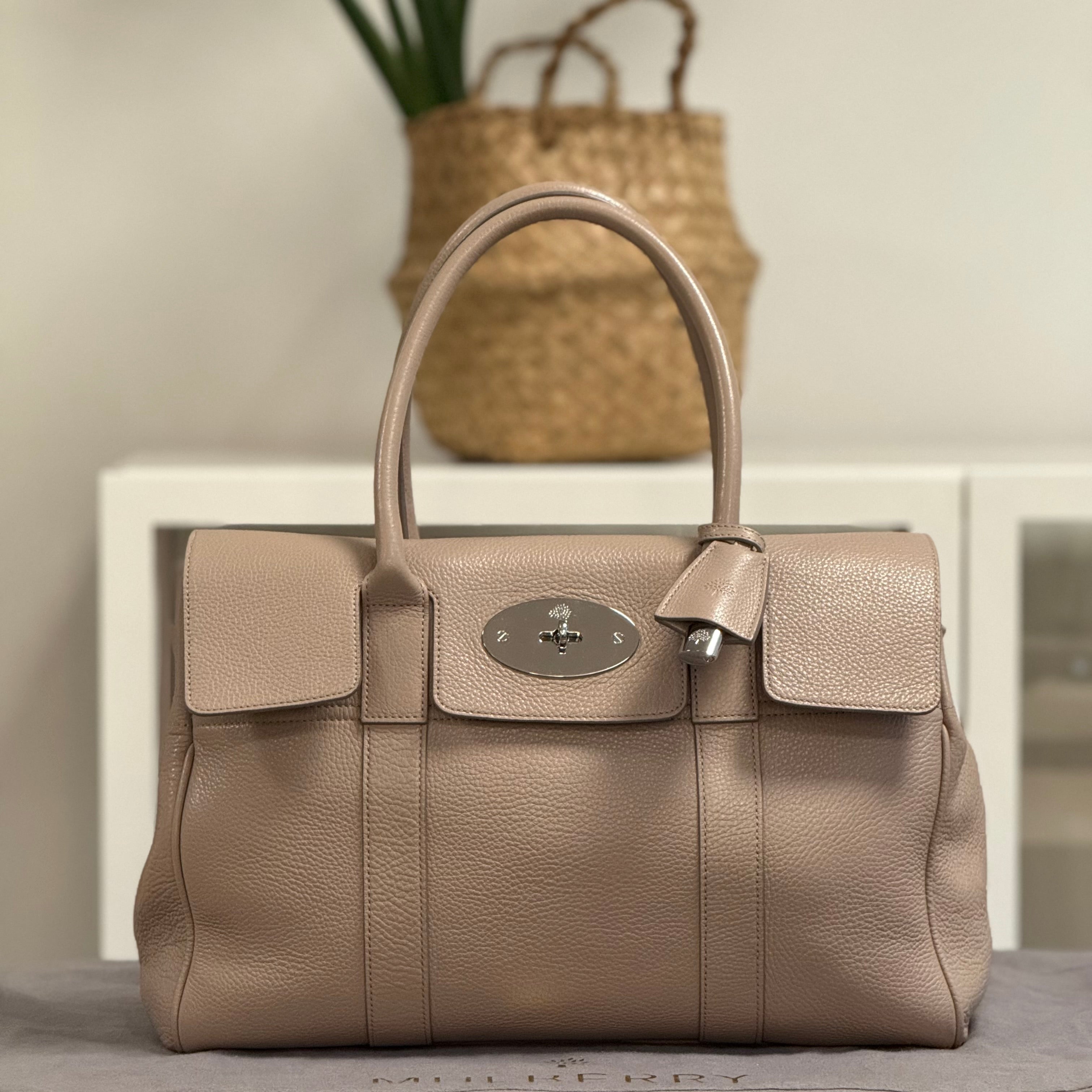 Description: This Mulberry Bayswater has double top handles and a flap closure with a Mulberry postman’s lock. Inside there is a main compartment with two flat pockets and a zipped compartment.
