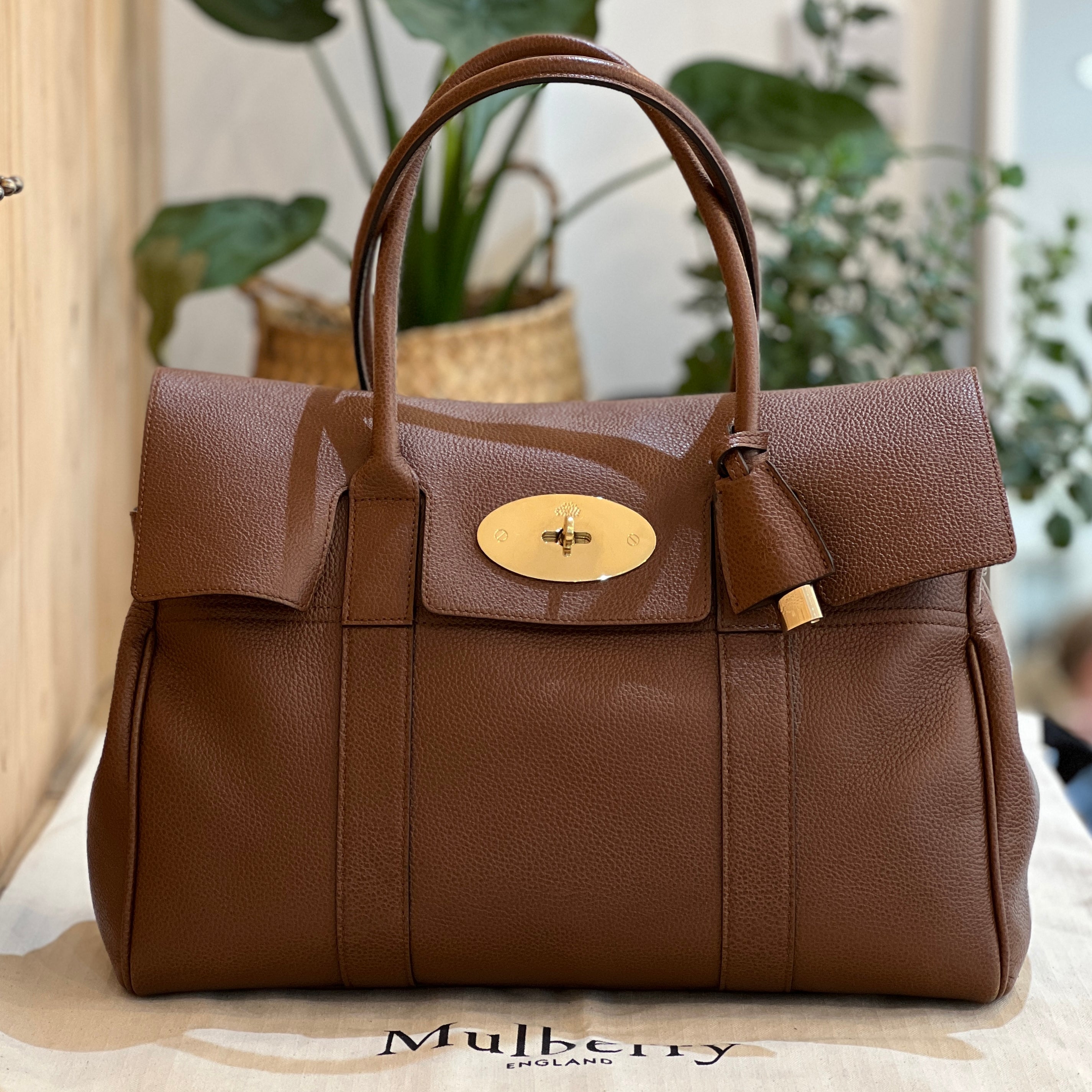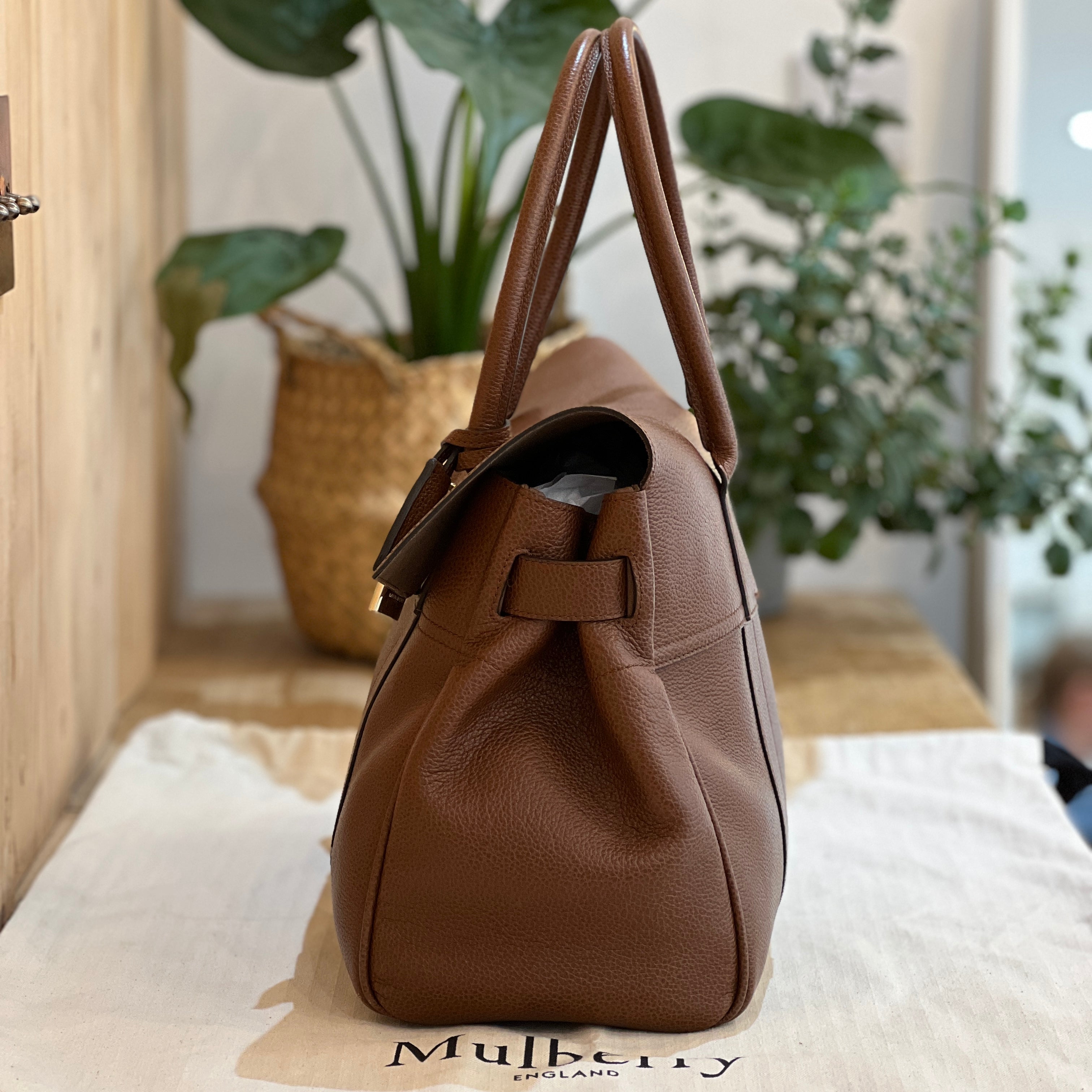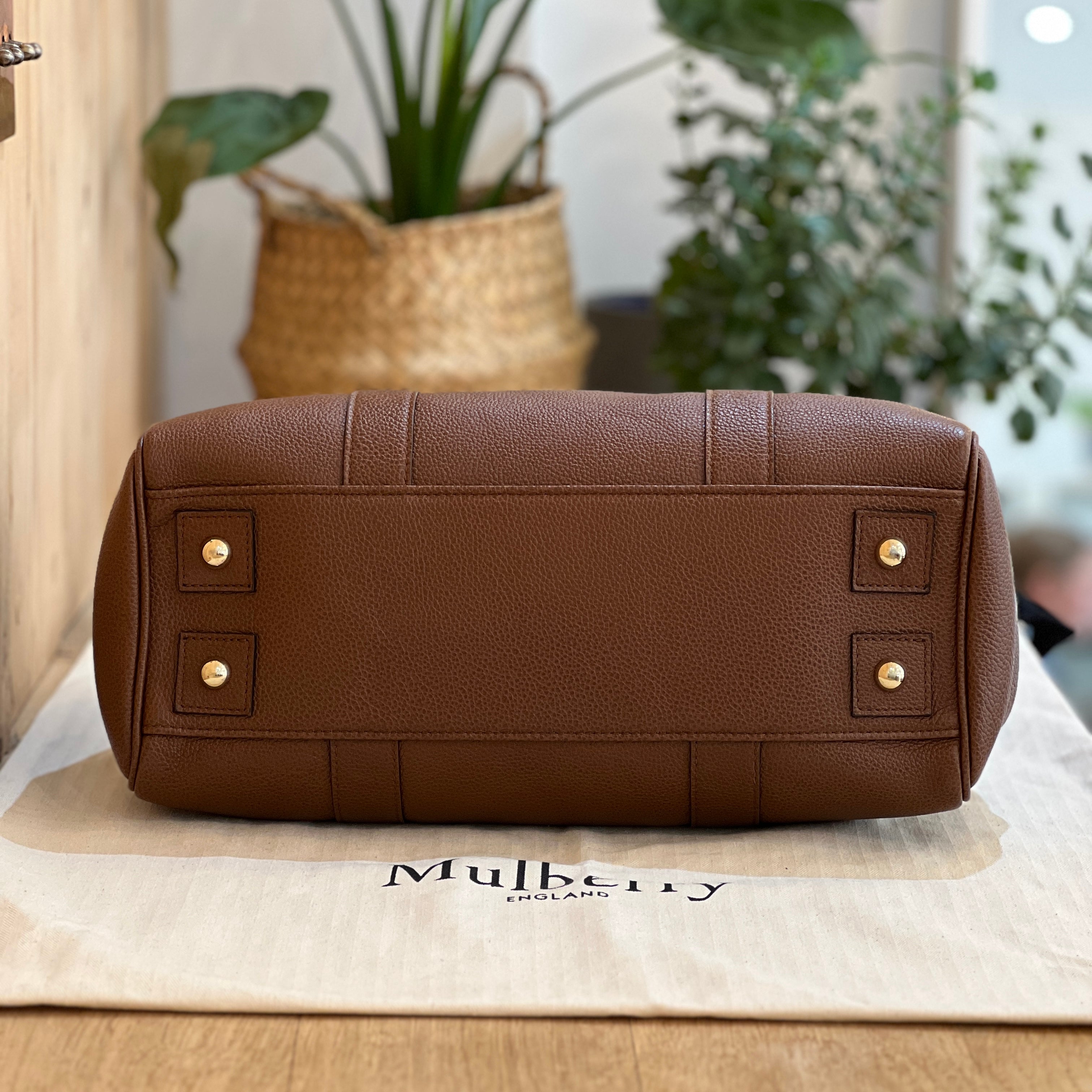 Description: This Mulberry Bayswater has double top handles and iconic Postman's lock fasten. It has 4 base studs. Inside it has two adjustable buckle gussets. It has one zipped pocket and two flat pockets.