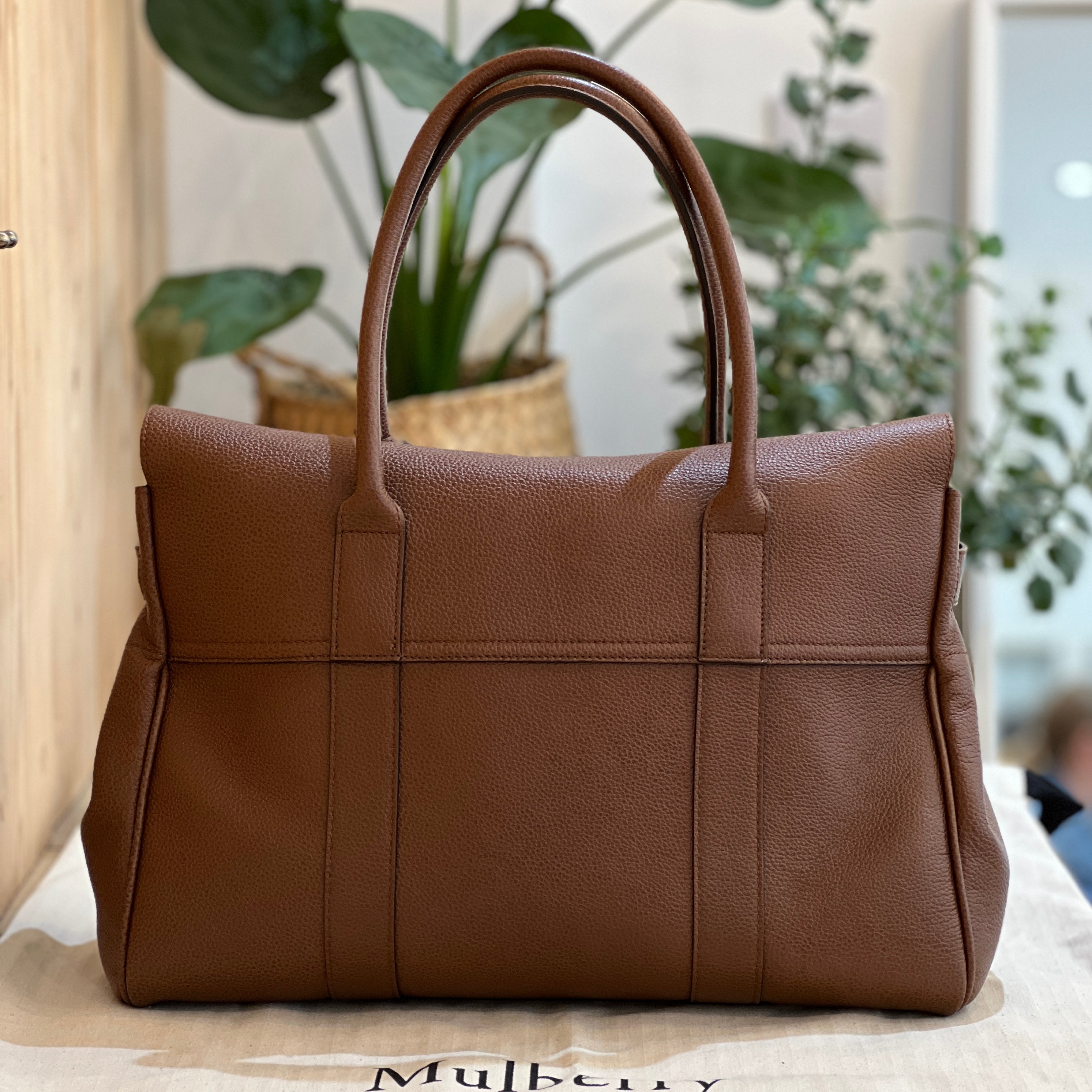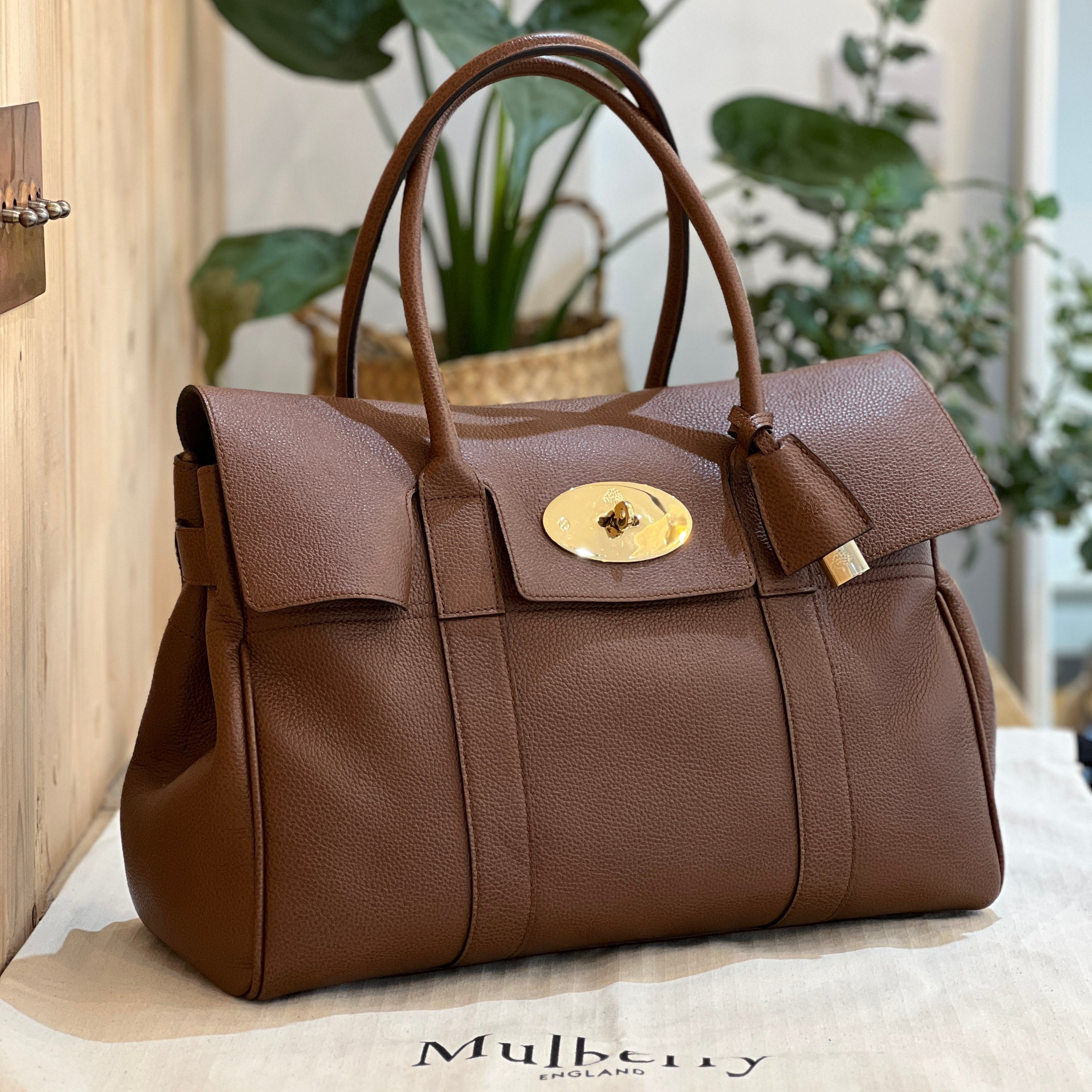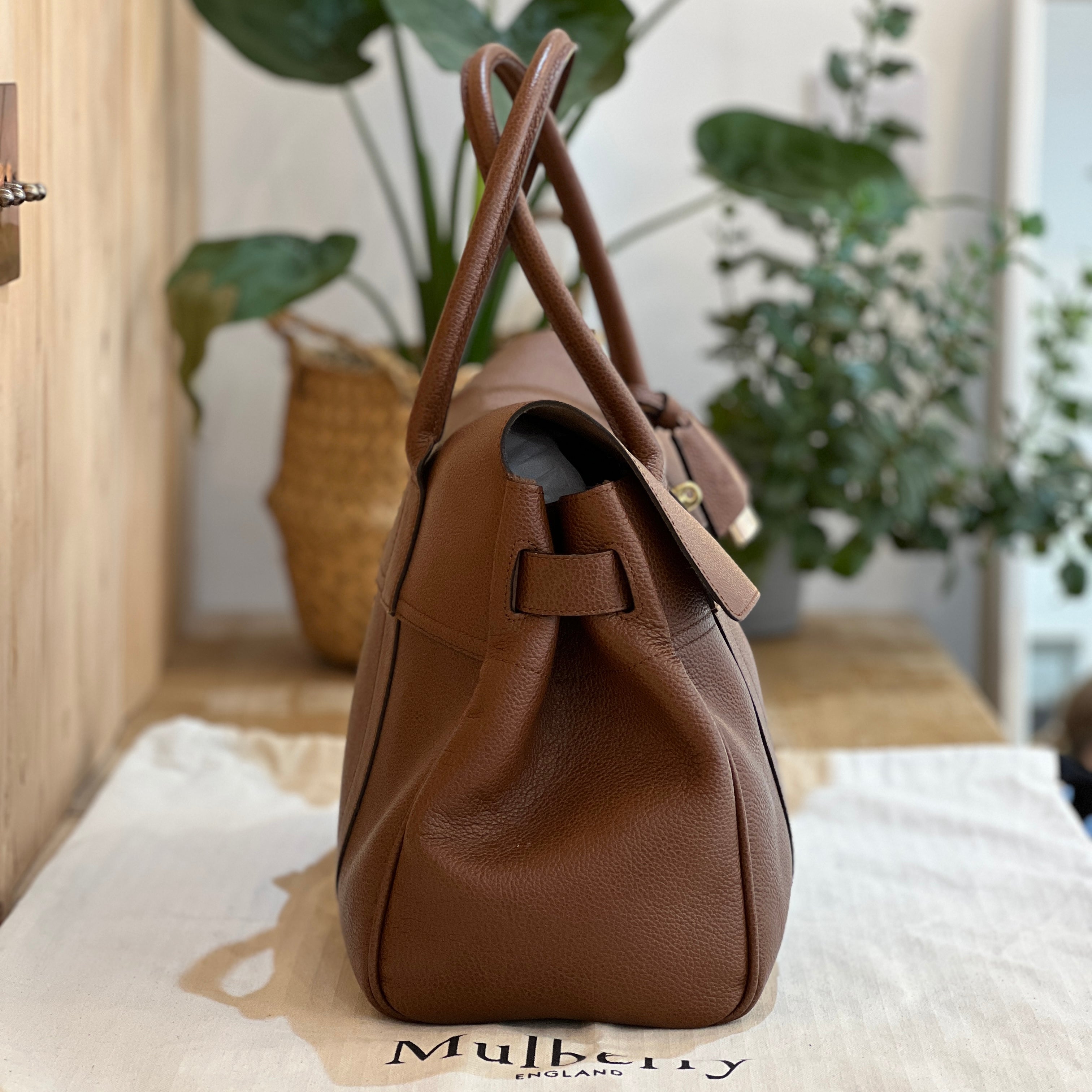 Description: This Mulberry Bayswater has double top handles and iconic Postman's lock fasten. It has 4 base studs. Inside it has two adjustable buckle gussets. It has one zipped pocket and two flat pockets.