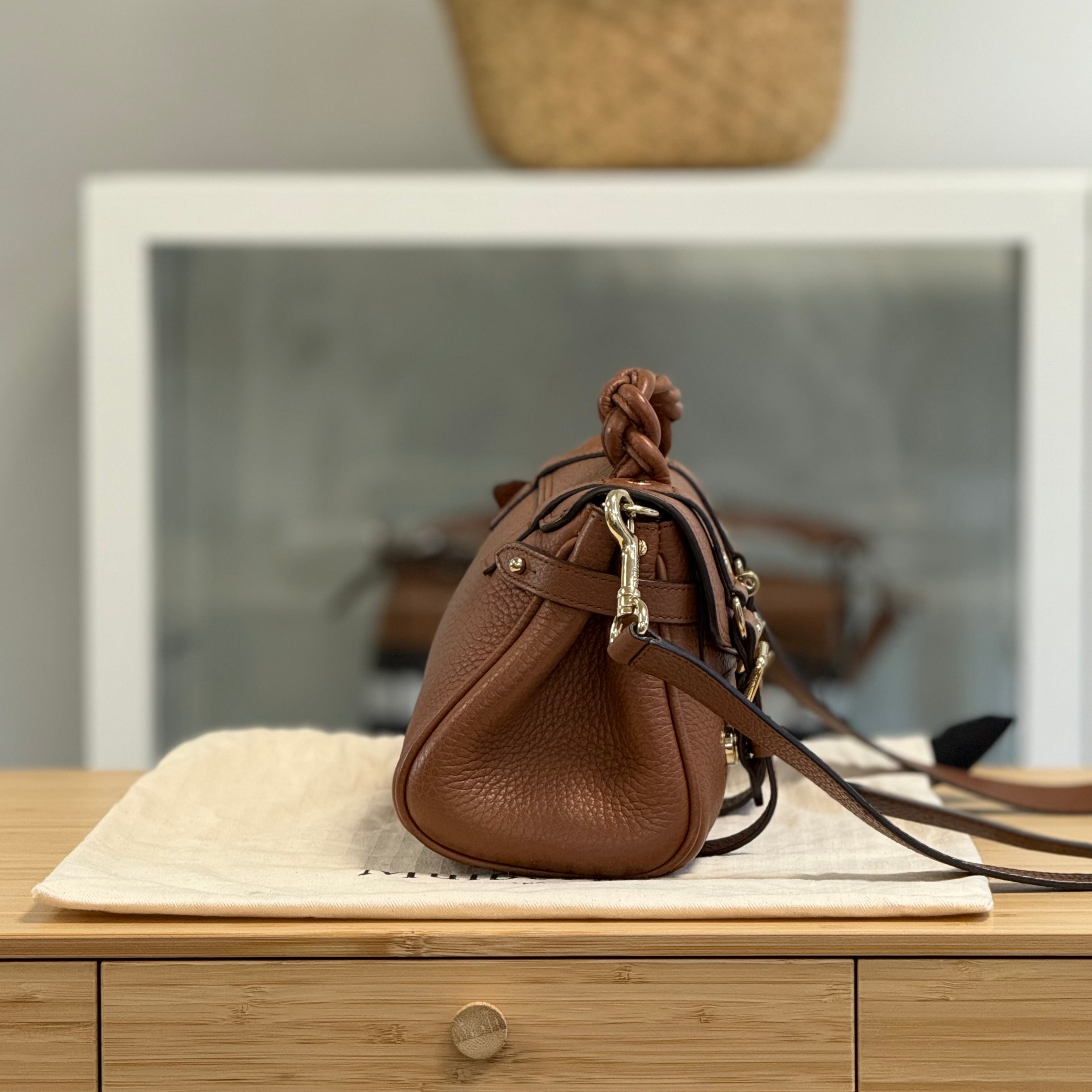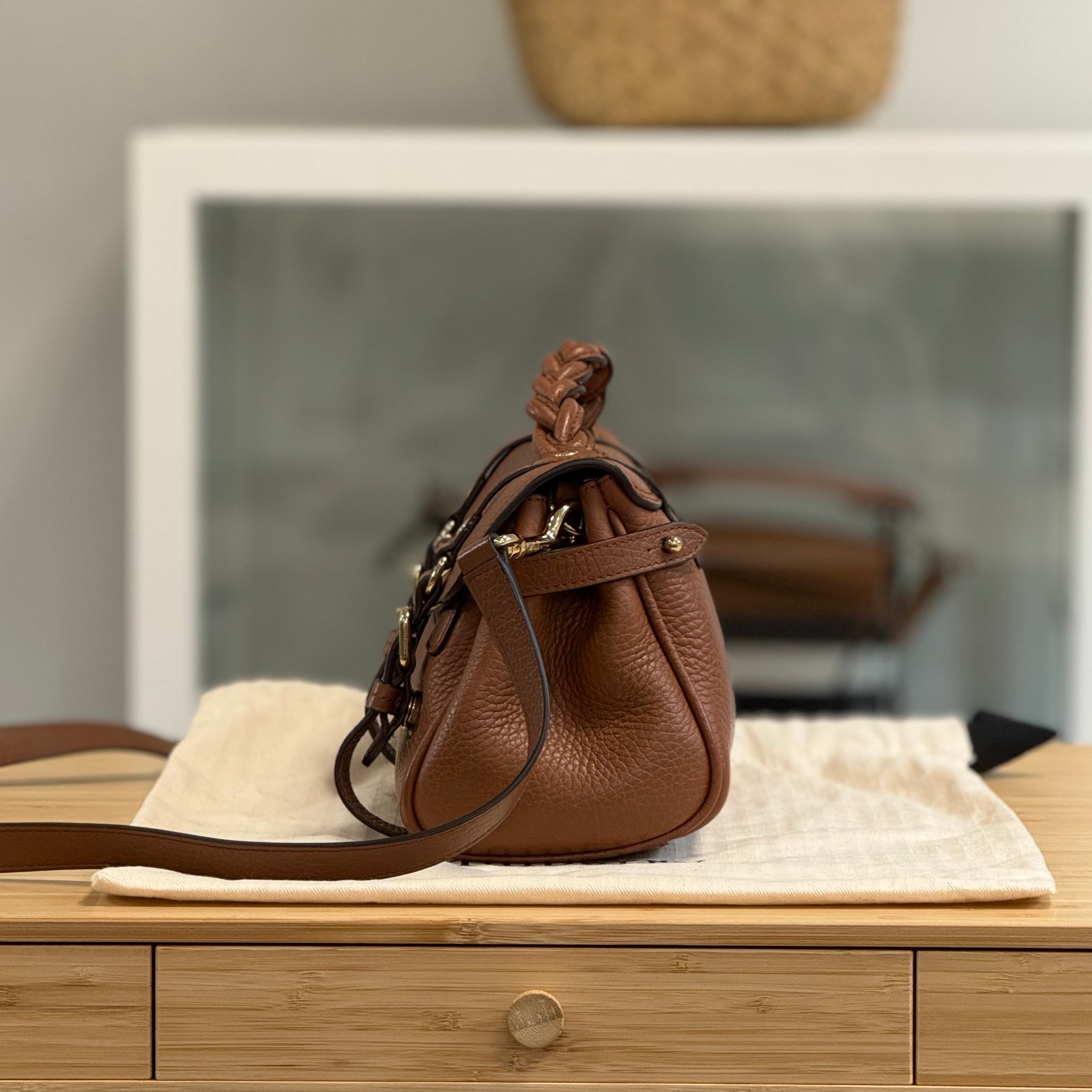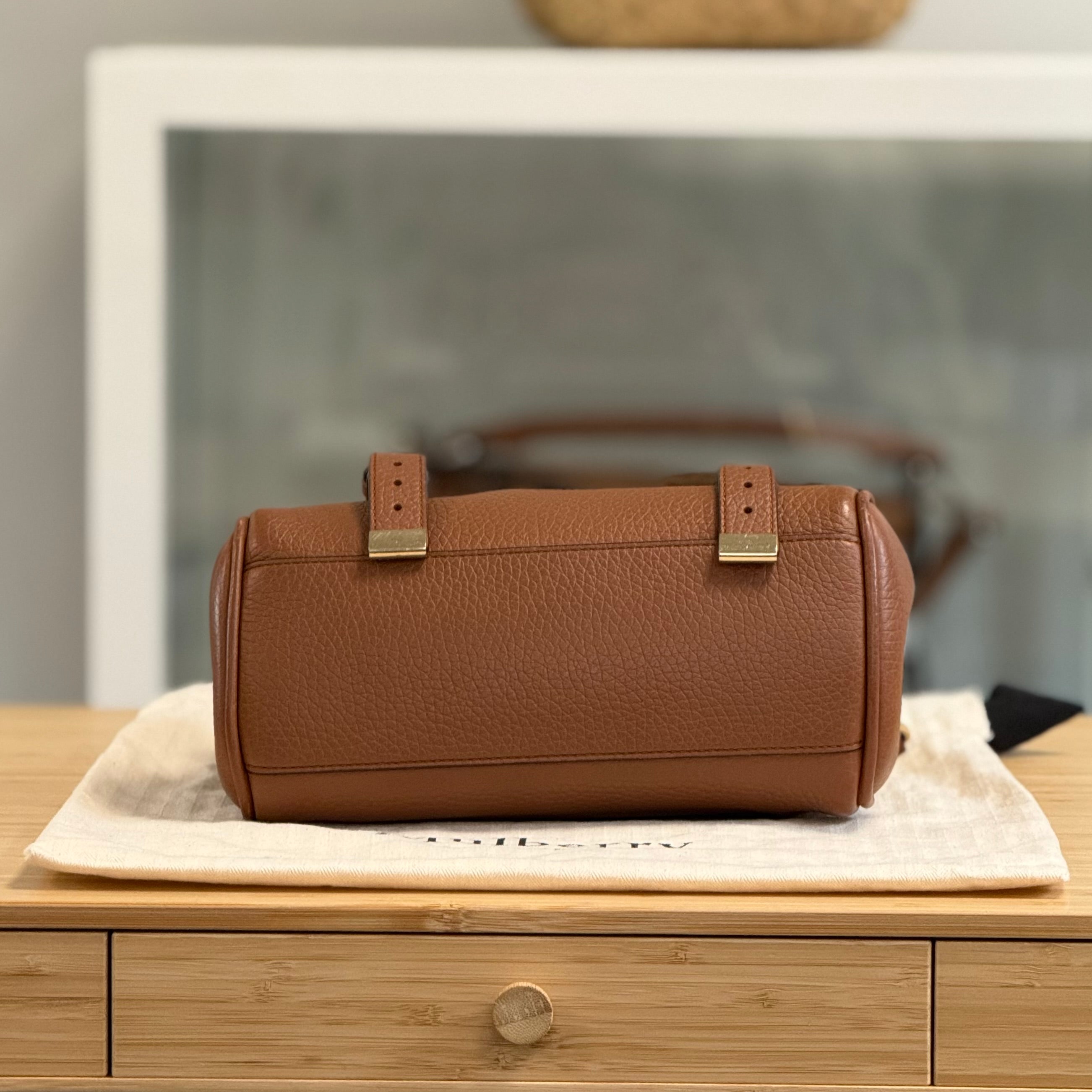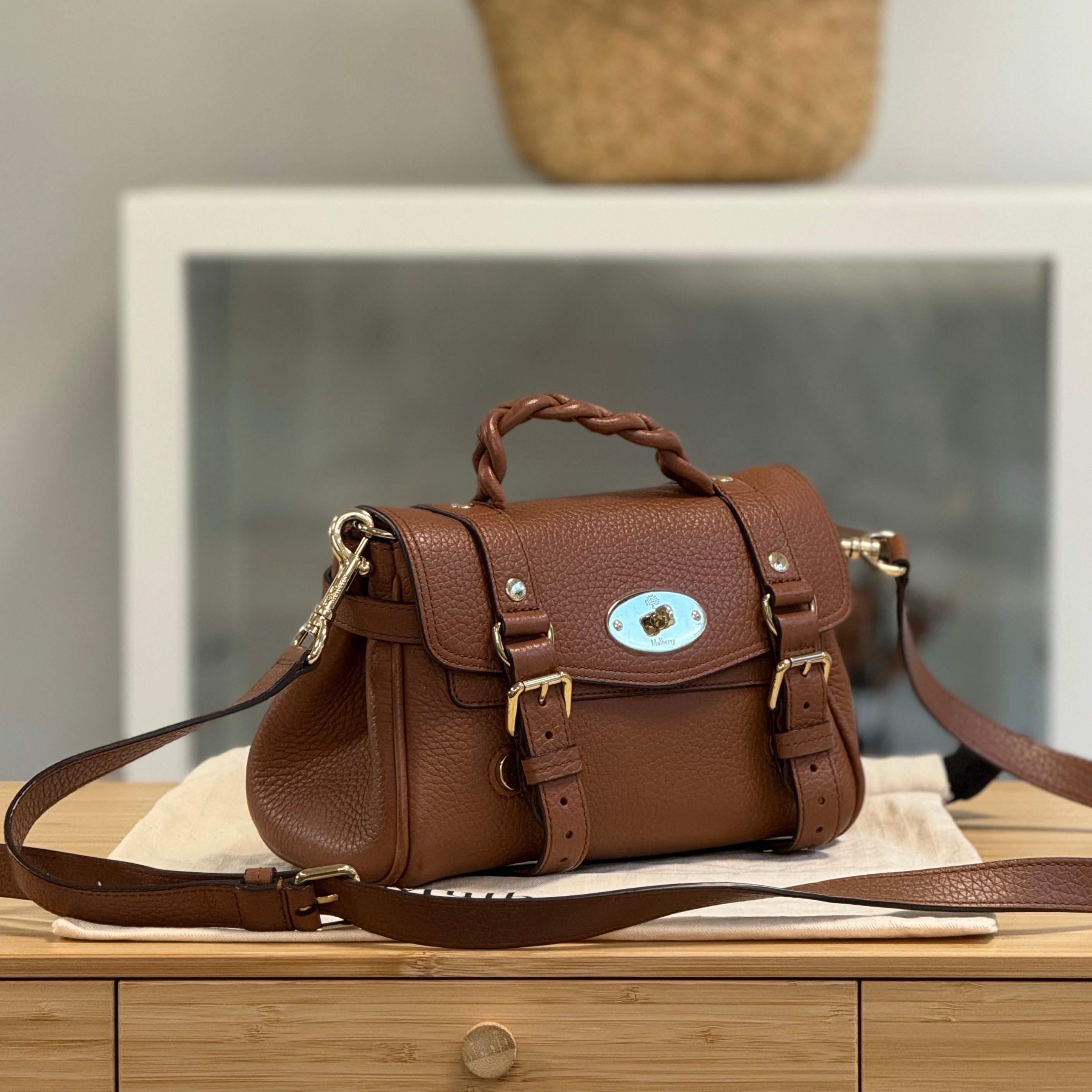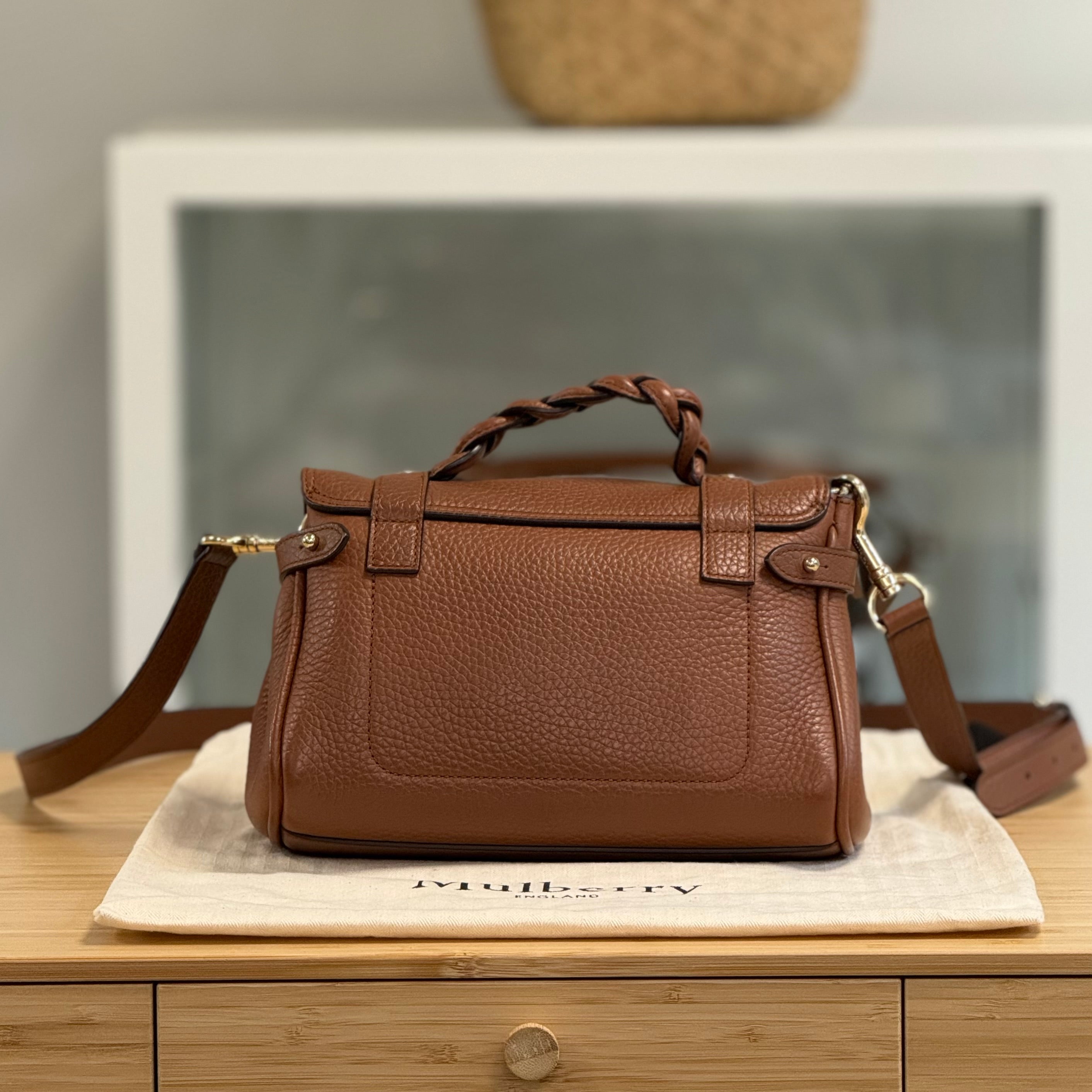 Description: This Mulberry Mini Alexa has 1 top handle and an adjustable & removable strap. It has a flap closure with a Mulberry Postman's Lock fasten, with 2 magnetic press stud fastens. Inside it has 1 zipped pocket.