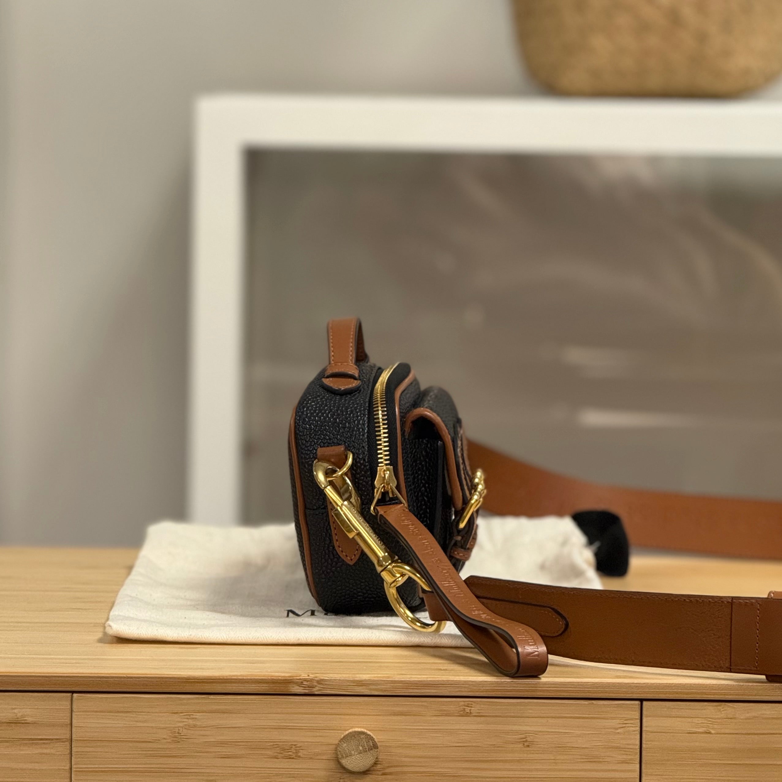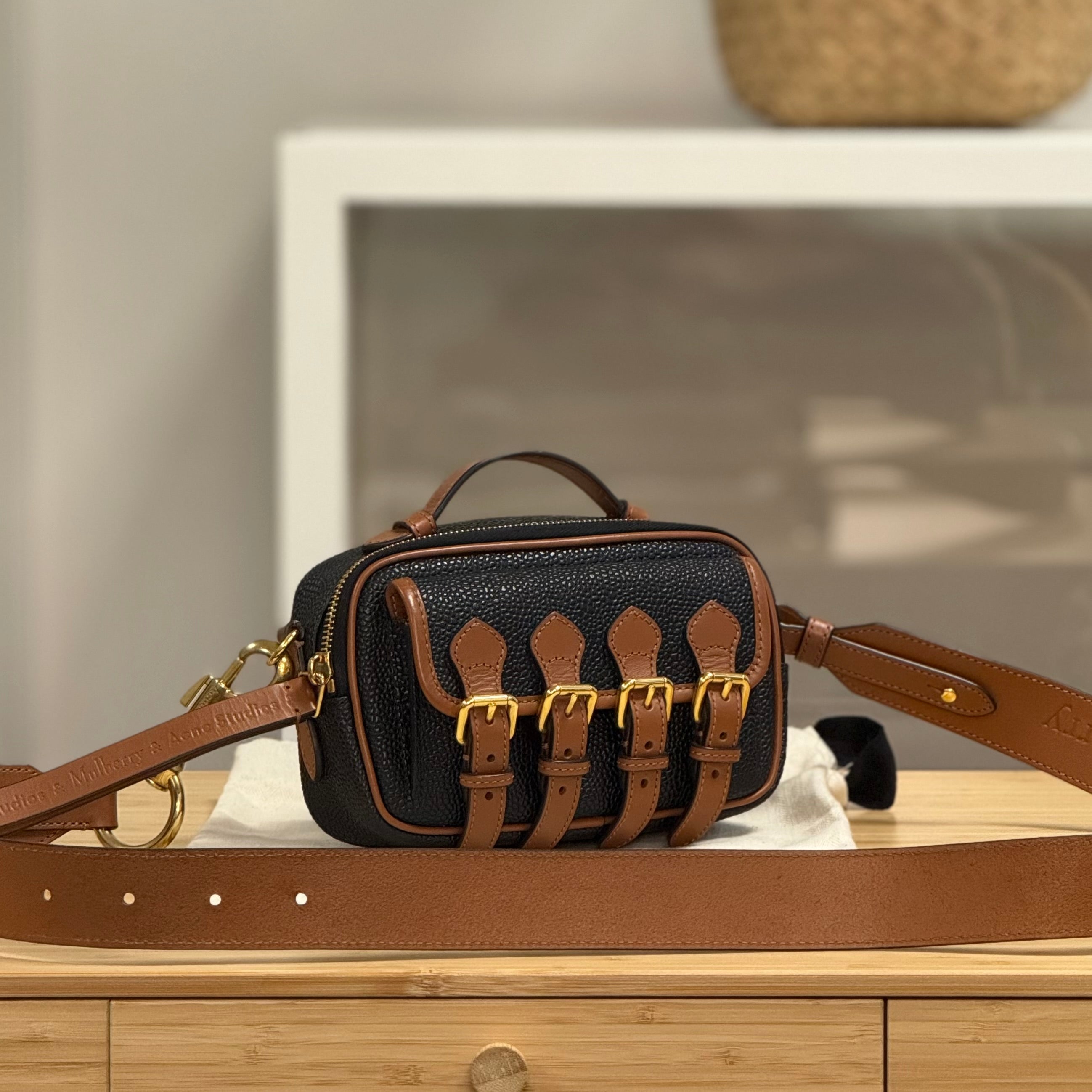 Description: This Mulberry x Acne Studios Mini Crossbody Messenger has a removable & adjustable strap. It has 1 top handle. On the front it has 4 faux buckles and a front flap with magnetic closure and pocket. There is a long leather zip pull and zip round fasten. Inside it has 1 flat pocket.