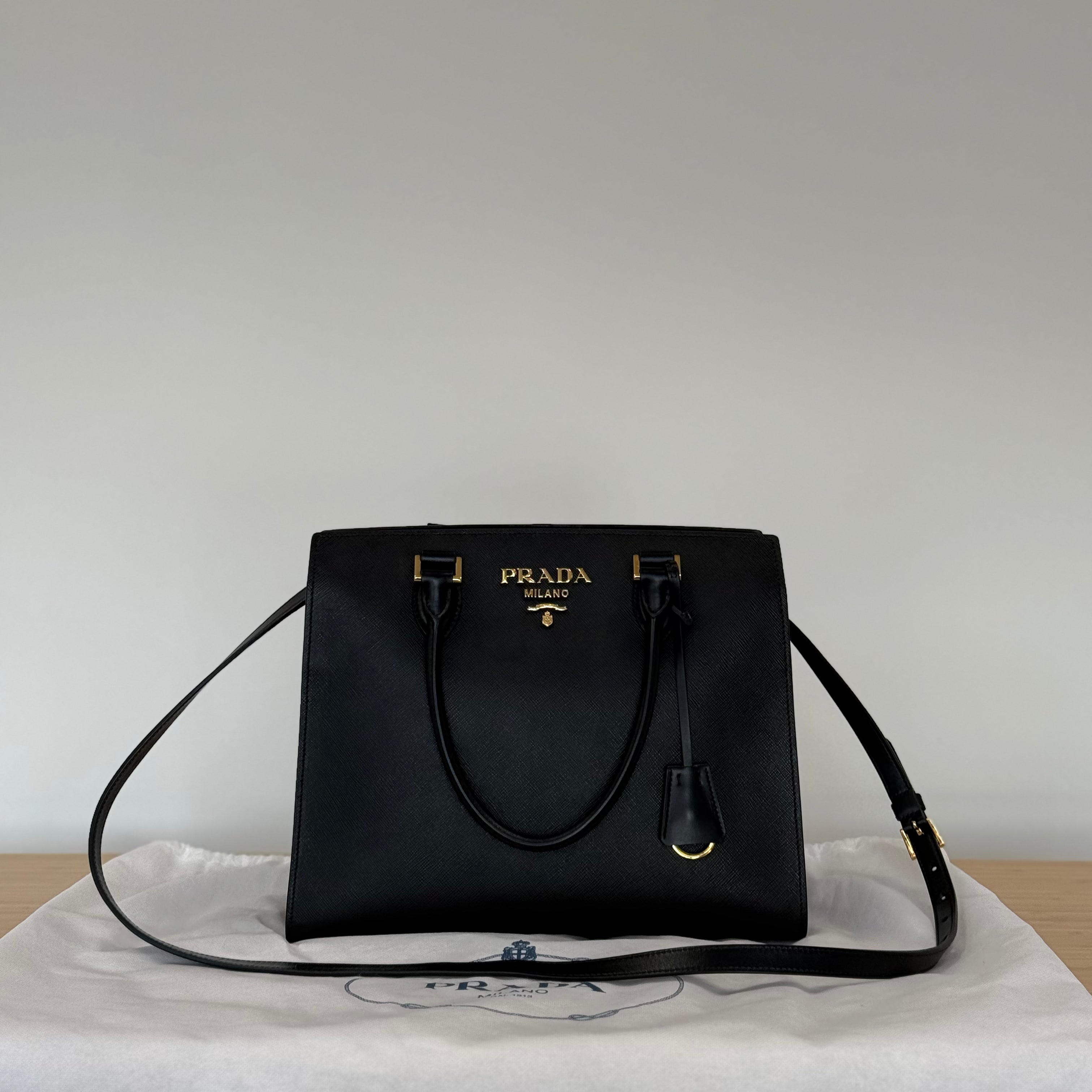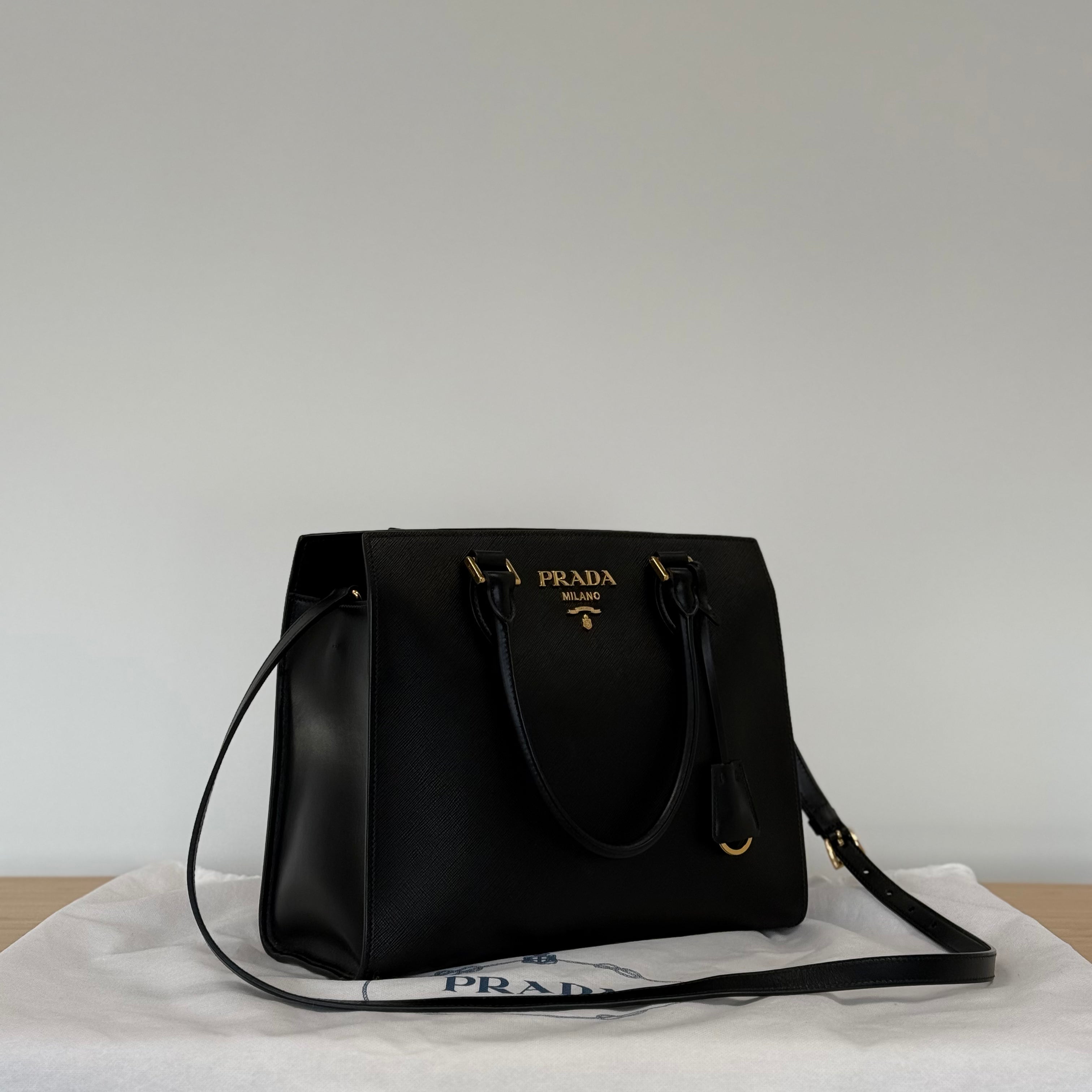 Included: Prada dustbag, Prada envelope, Prada RFID tag, Prada care guide, Prada authenticity card, Prada product tag, Prada cloche and keyring