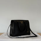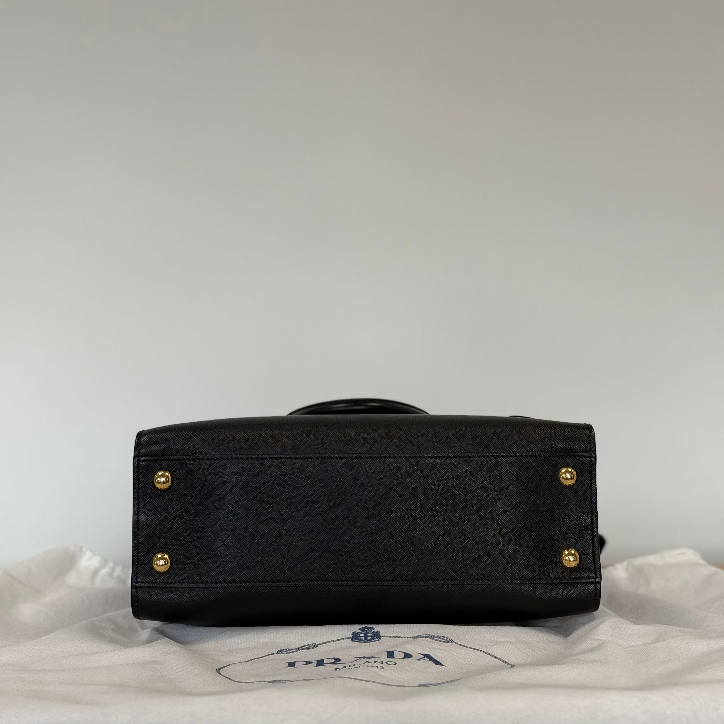 Description: This Prada Galleria has double top handles and a removable & adjustable strap. It has 4 base studs. Inside there is 1 zipped pocket and 1 flat pocket.
