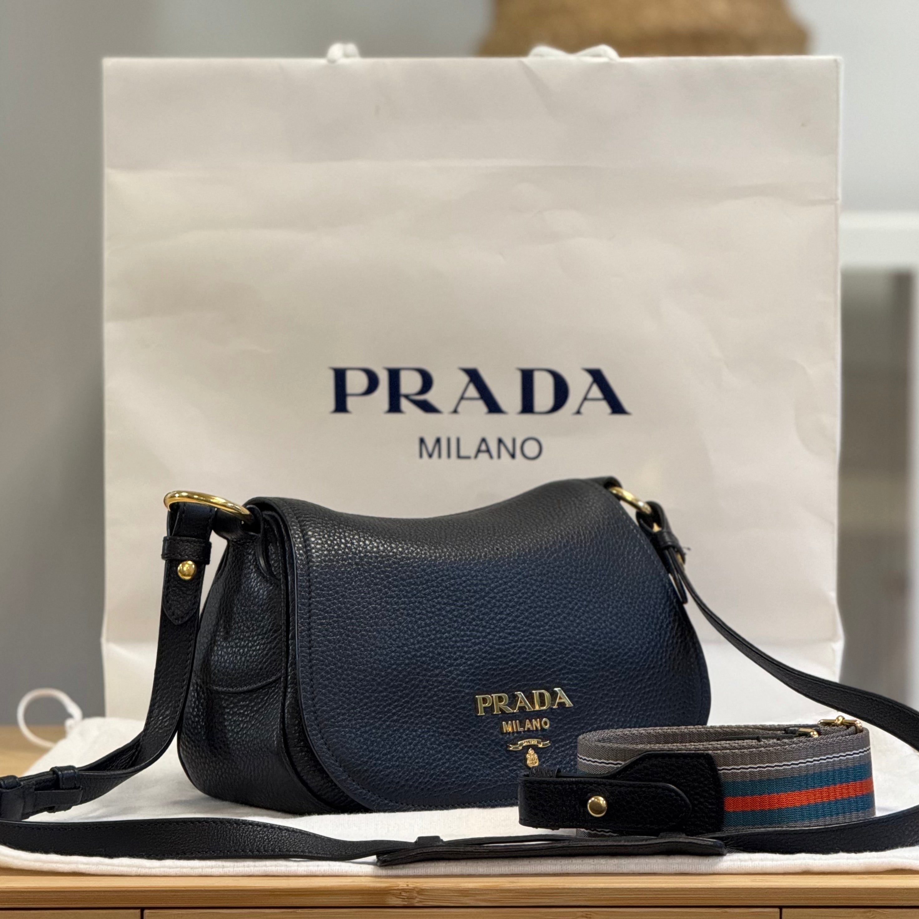 Description: This Prada Vitello Daino Crossbody has 2 removable & adjustable straps and a flap closure with a magnetic fasten. It has an exterior pocket on the back of the bag with a magnetic fasten. Inside there is 1 zipped pocket.